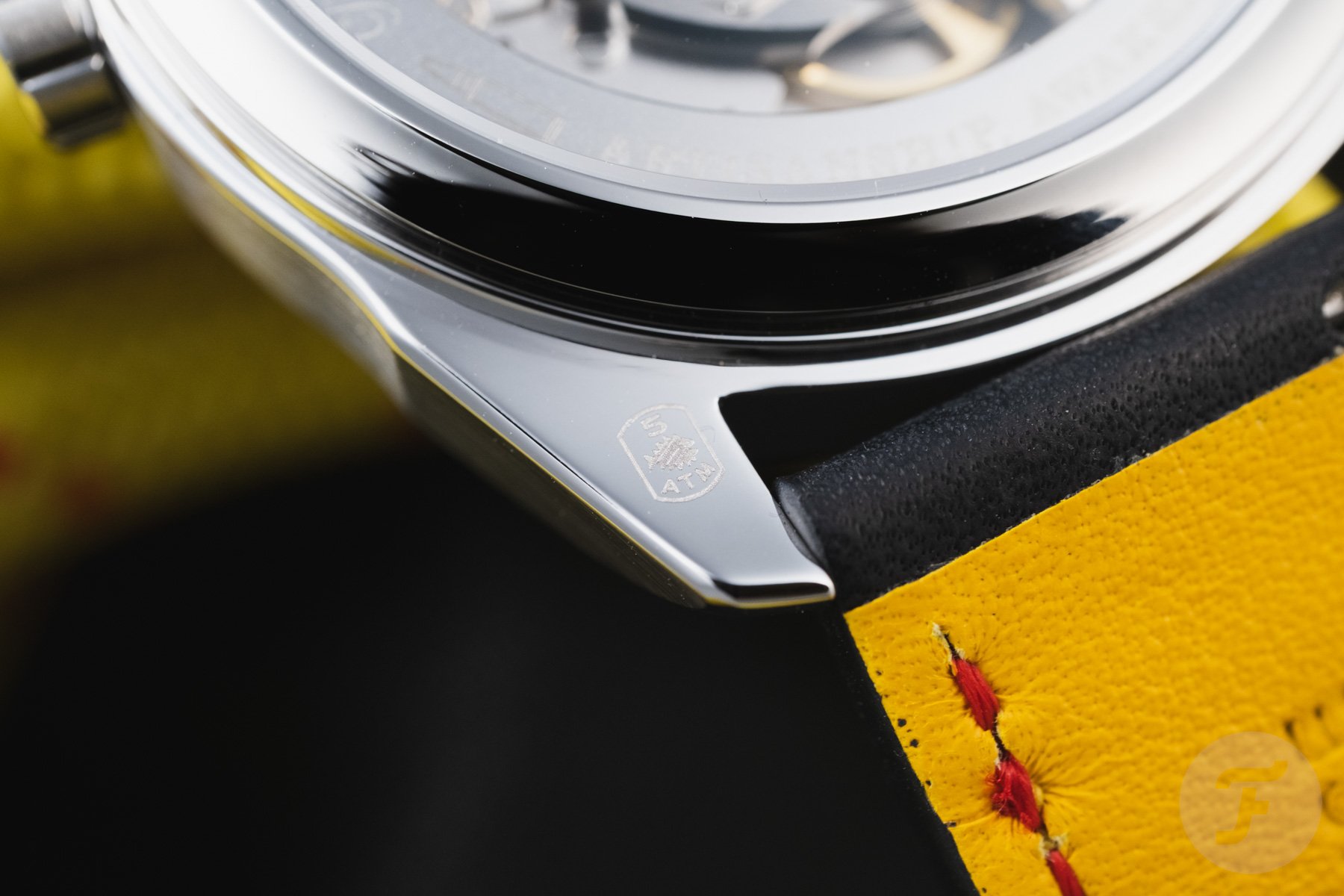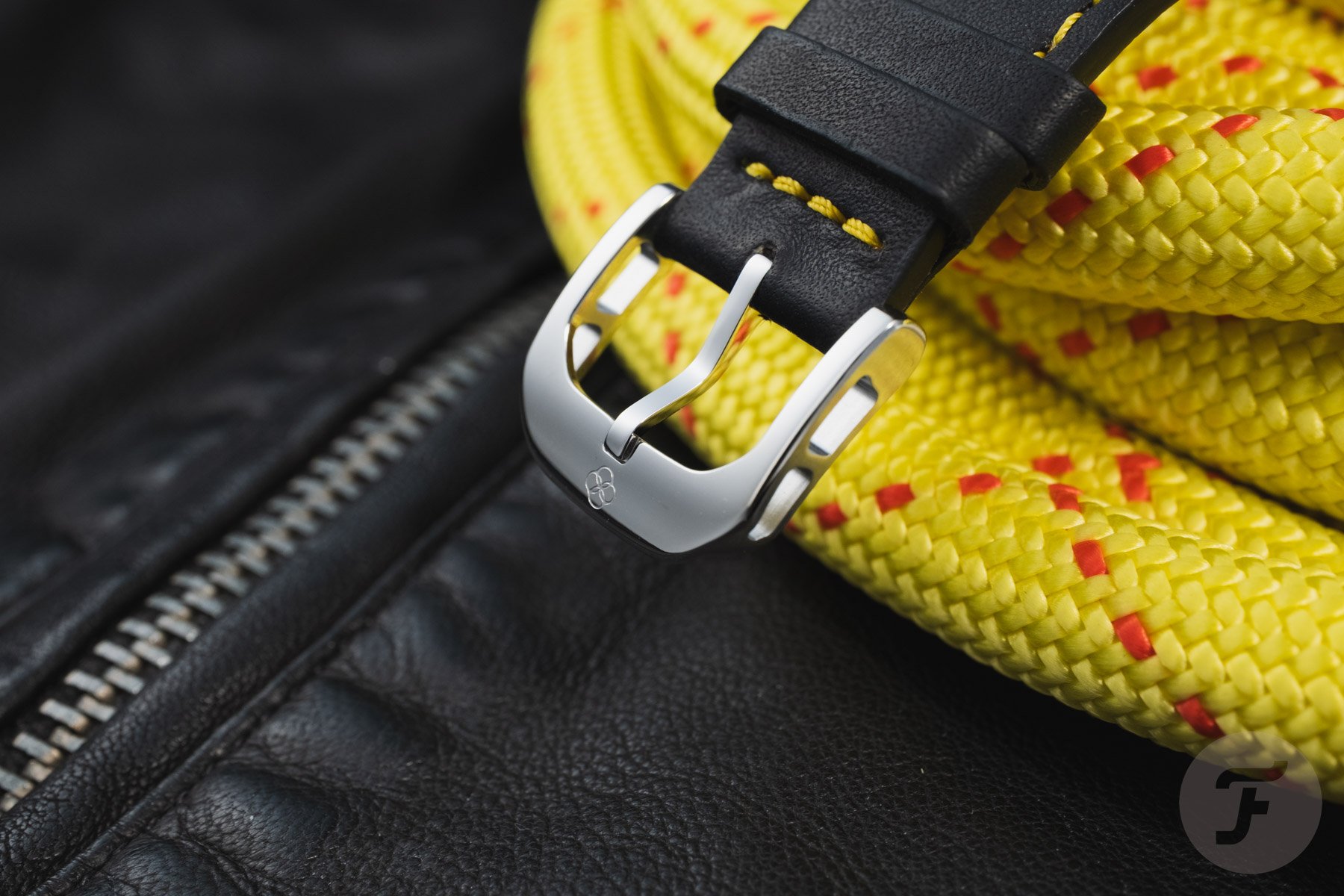 While the Jurassic watches had salmon leather straps that resembled reptile skin, The Deadly Watch takes a different approach. Here, the strap is made from matte black Barenia leather by Bouveret in Franche-Comté, France, and has a bright yellow leather lining. Red stitching completes the look. A skeletonized pin buckle made of recycled stainless steel is a nice finishing touch.