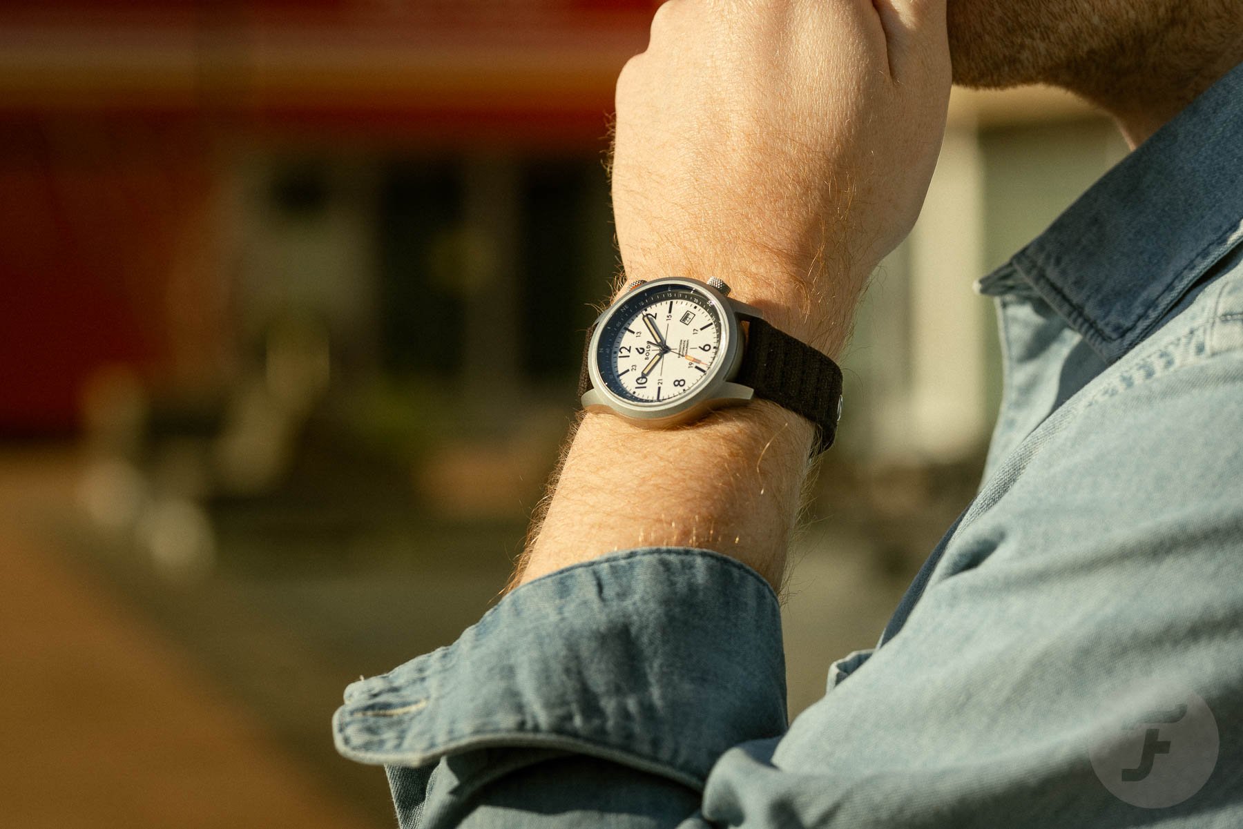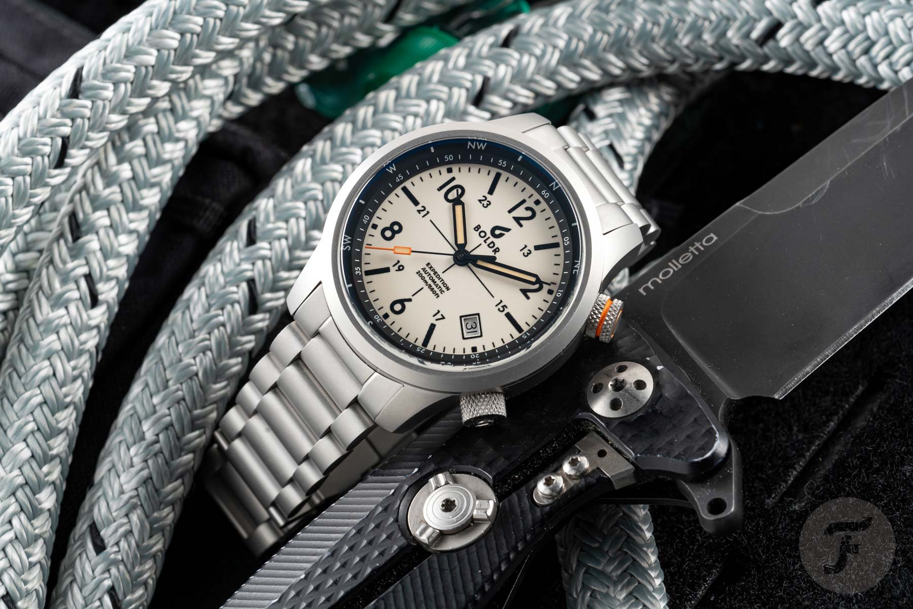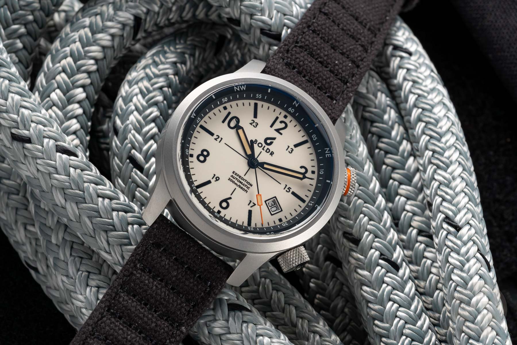 I had the opportunity to test one of the three new versions. Originally, the BOLDR Expedition came in two different colorways — blue, and white with a black bezel and details. Both featured orange accents in the top crown and the tip of the seconds hand. The new models come in black, a warm desert sand color, and a white-and-black combo. These three new models have a slightly revamped dial design with a central crosshair. Other than that, the hour markers are shown in 12-hour and 24-hour formats, and the internal rotating bezel has a compass scale that can be used for navigation. These three watches come on complementing canvas straps. They come in green for the black model, a warm orange-brown for the desert model, and black for the “tuxedo” model. New to the Expedition I is also a custom steel bracelet, which is an option when purchasing the watch.