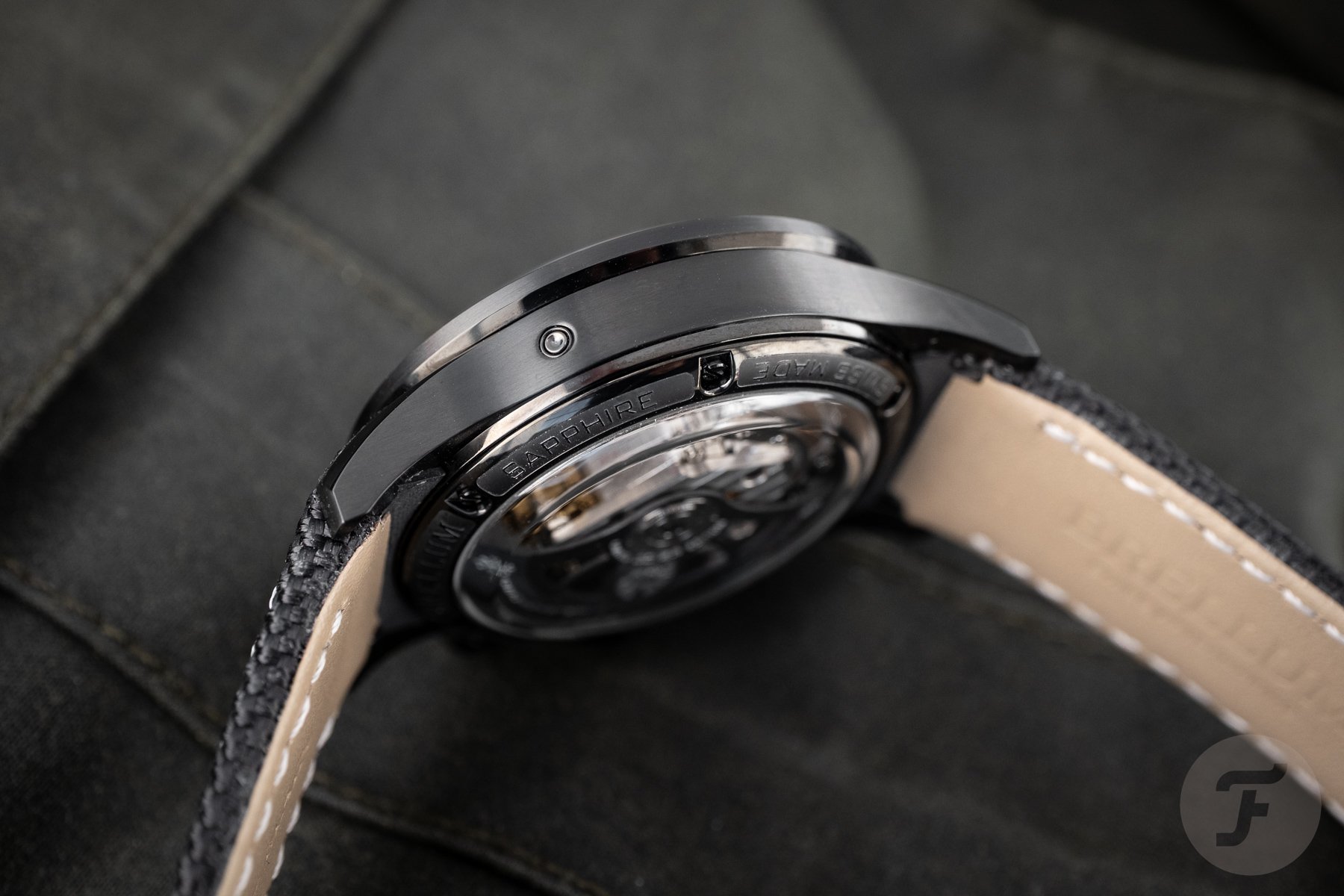 Let’s begin with a rundown of the particulars. The latest Brellum model arrives with a black DLC-coated Grade 5 titanium case. It’s a stout piece weighing in at just 72 grams (head only) with a 43mm diameter and a 51.5mm lug-to-lug. Its 15.9mm thickness includes a box-type sapphire crystal with an antireflective coating. Like its steel counterpart, the watch features a 100m water resistance rating. From an accessory perspective, the watch comes with a case-hugging black Nebur Tec strap. A matching black DLC-coated titanium folding buckle completes the package.