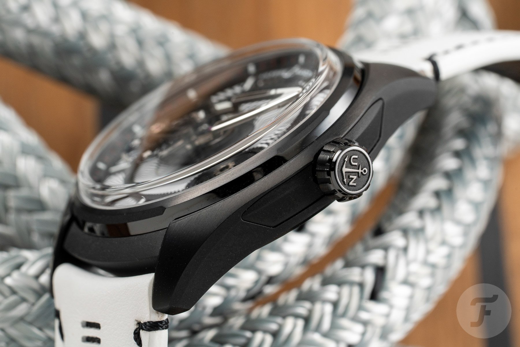 The watch attracts attention when you wear it; from others, but also from yourself. The white open-worked calfskin leather strap with point de bride stitches, contrasts with the black DLC coated titanium case, continuously seeks attention from its wearer.
