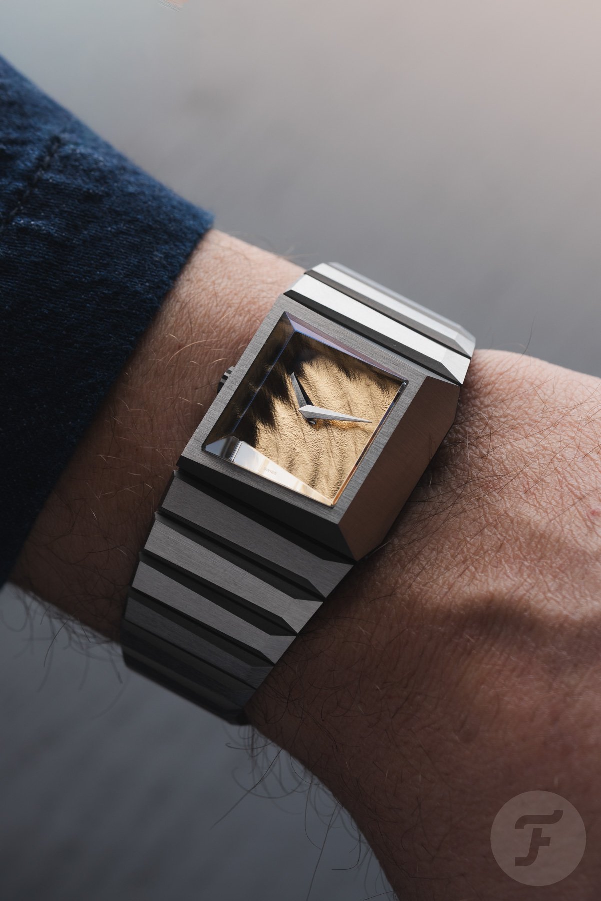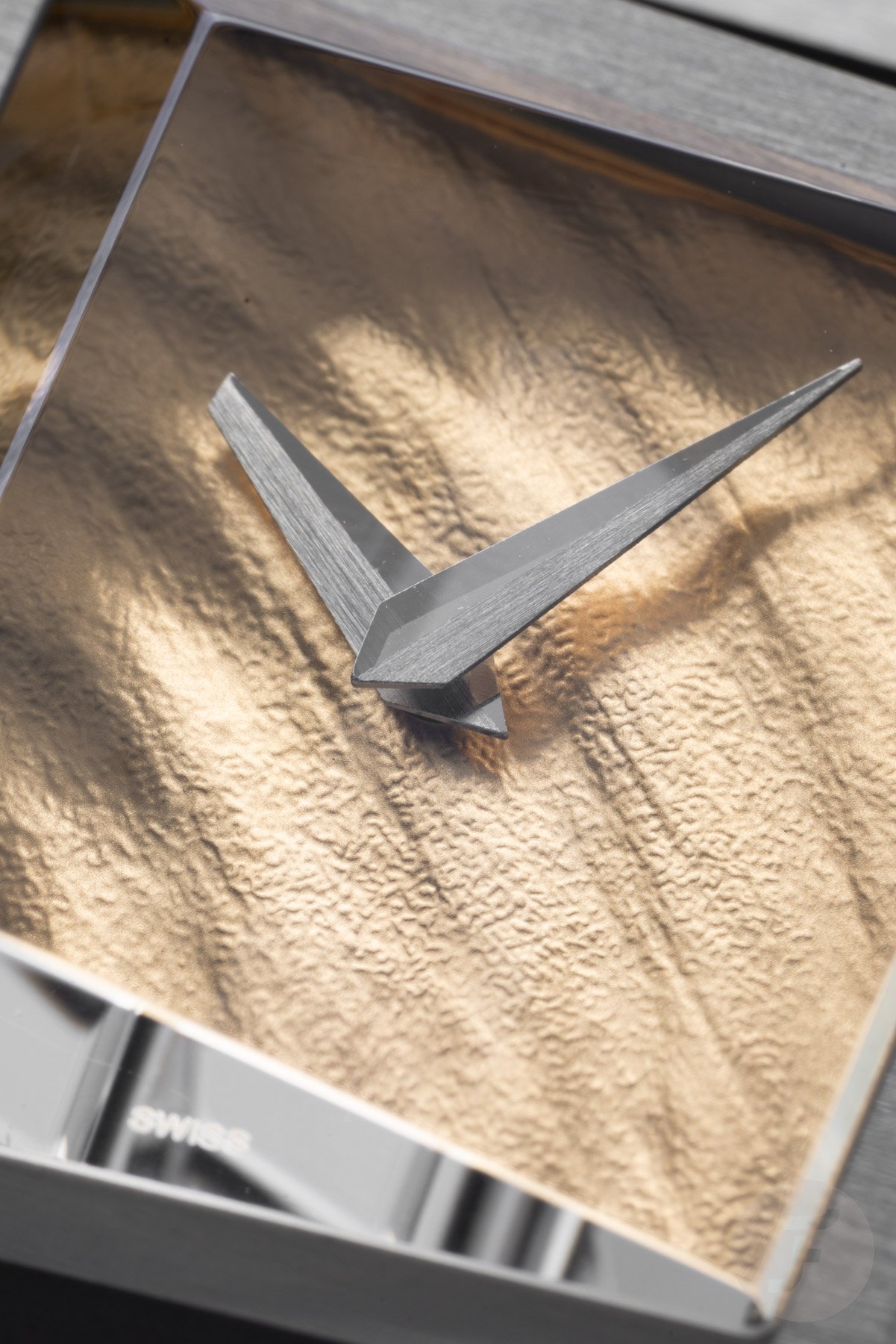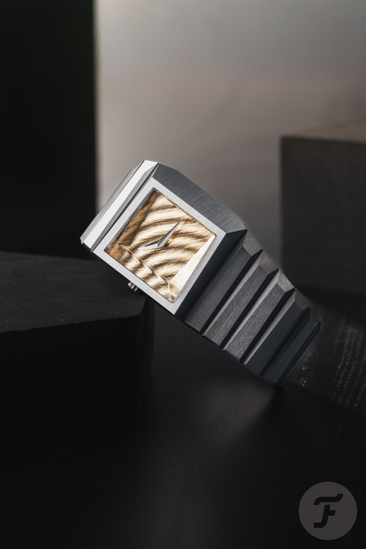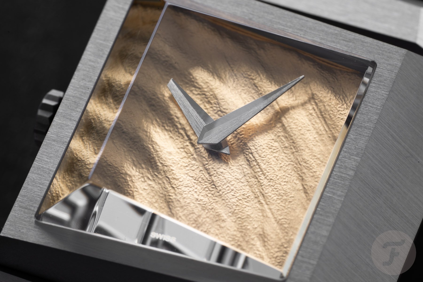 As mentioned, this lightweight titanium version also has a new dial. This one takes a step away from the stone dials of the first two models. While using a different stone would have been logical, the two men decided it was too obvious. Instead, they opted for an 18K yellow gold dial with a pattern inspired by water’s ripples. Additionally, the gold displays a beautifully detailed texture that adds incredible depth. Finishing the look are the two asymmetrical, razor-sharp hands that nicely suit the design.