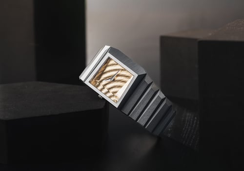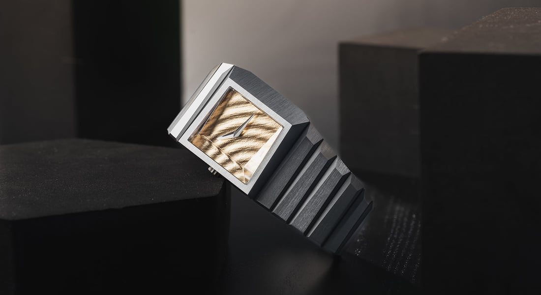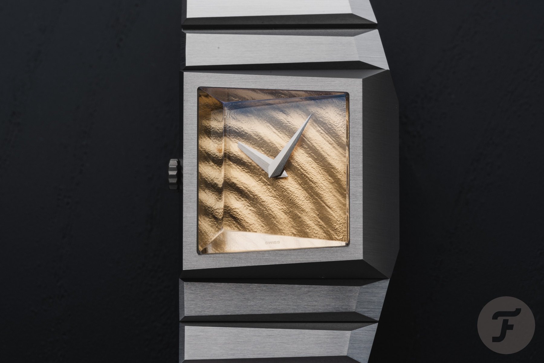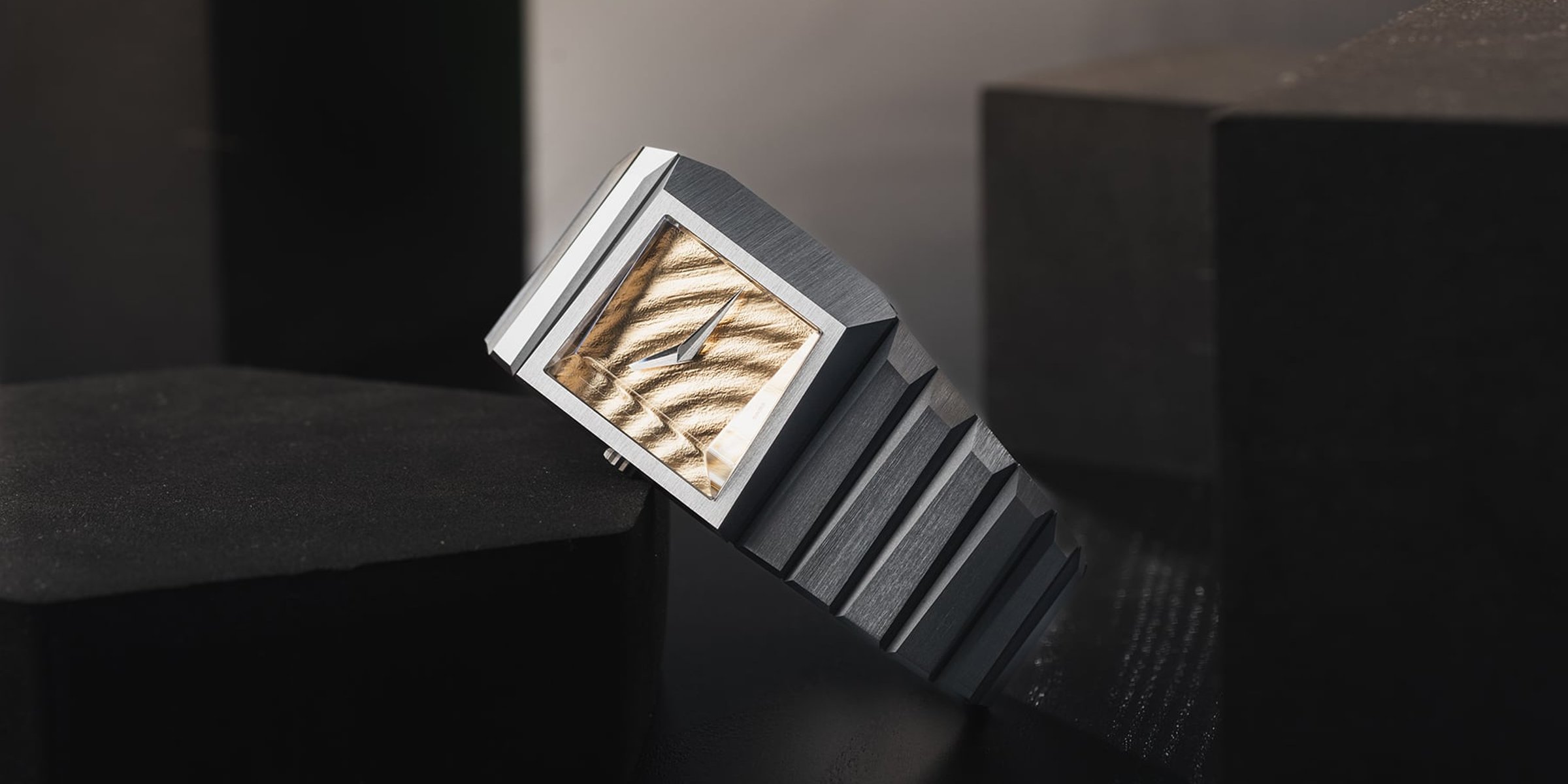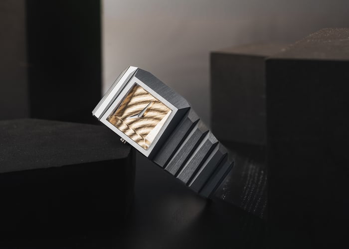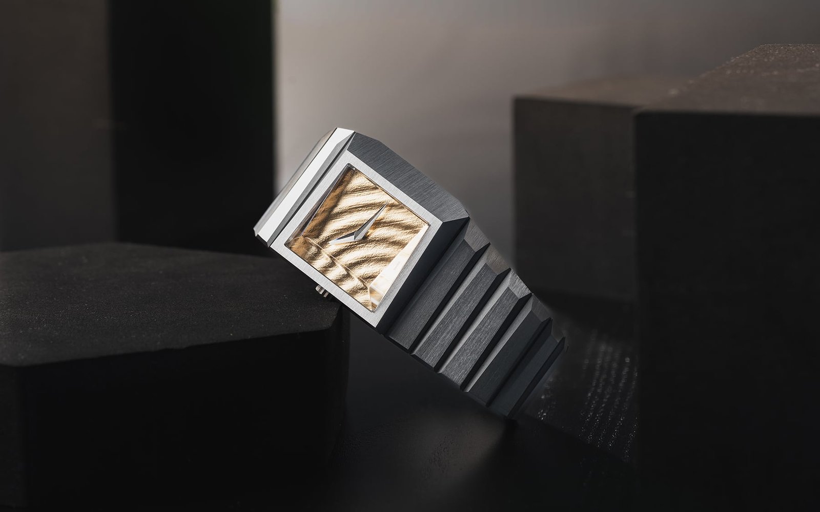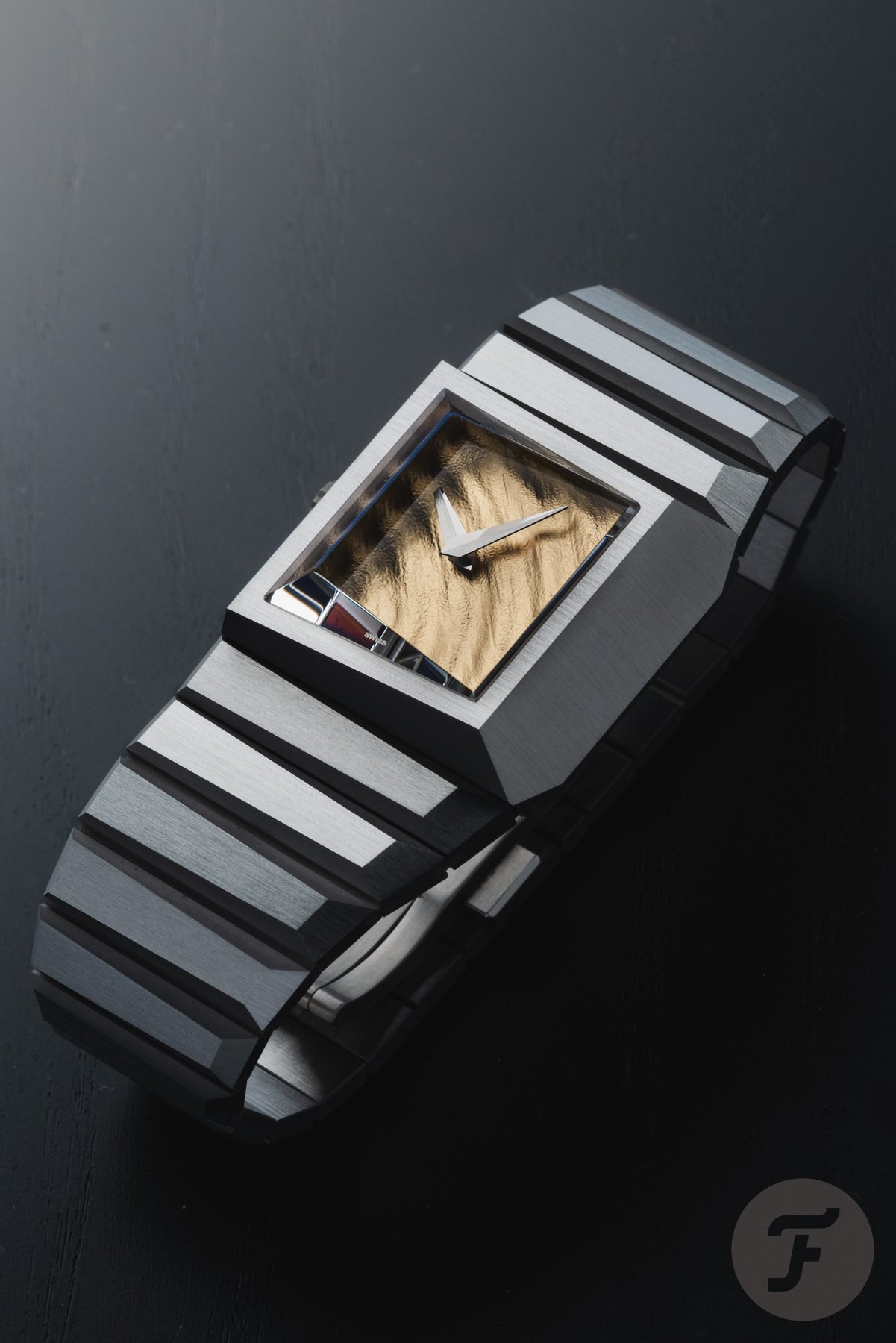 As mentioned, this lightweight titanium version also has a new dial. This one takes a step away from the stone dials of the first two models. While using a different stone would have been logical, the two men decided it was too obvious. Instead, they opted for an 18K yellow gold dial with a pattern inspired by water’s ripples. Additionally, the gold displays a beautifully detailed texture that adds incredible depth. Finishing the look are the two asymmetrical, razor-sharp hands that nicely suit the design.
