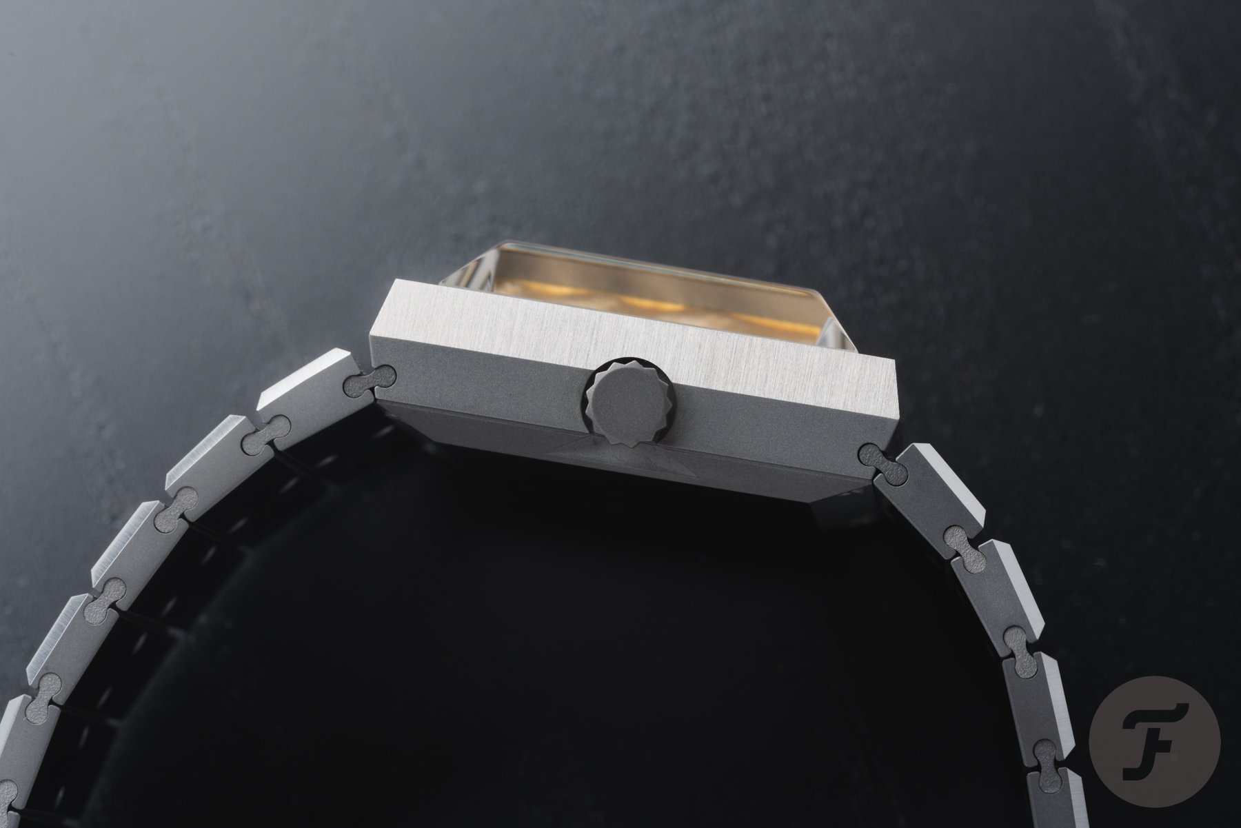 This new titanium version is also slightly smaller. It has a 32mm diameter, a 31.5mm length, and a 9.1–10.4mm thickness, with the last being due to the asymmetrical design. While the diameter has only seen a 1.5mm decrease, that makes the watch slightly sleeker. What has stayed is the destro layout, with the crown on the left. As you know, great design is all about the little details, and I love that the two founders went over each one and optimized them where they considered it necessary.