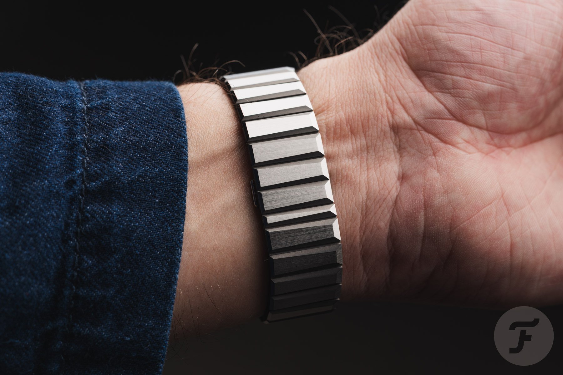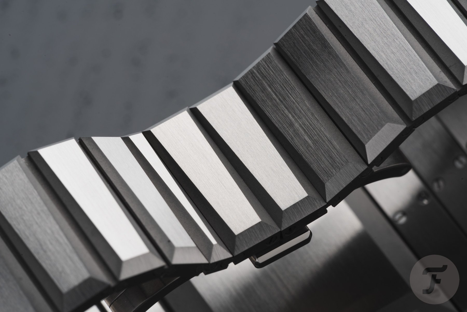 Another standout detail is the overall finishing of the case and bracelet. The vertical brushing shows beautiful detail, adding even more character to the overall presence. Knowing how hard it is to machine and finish titanium, I felt so impressed by the sculpture and finishing of this new B/1.3r, as did many of my Fratello colleagues.