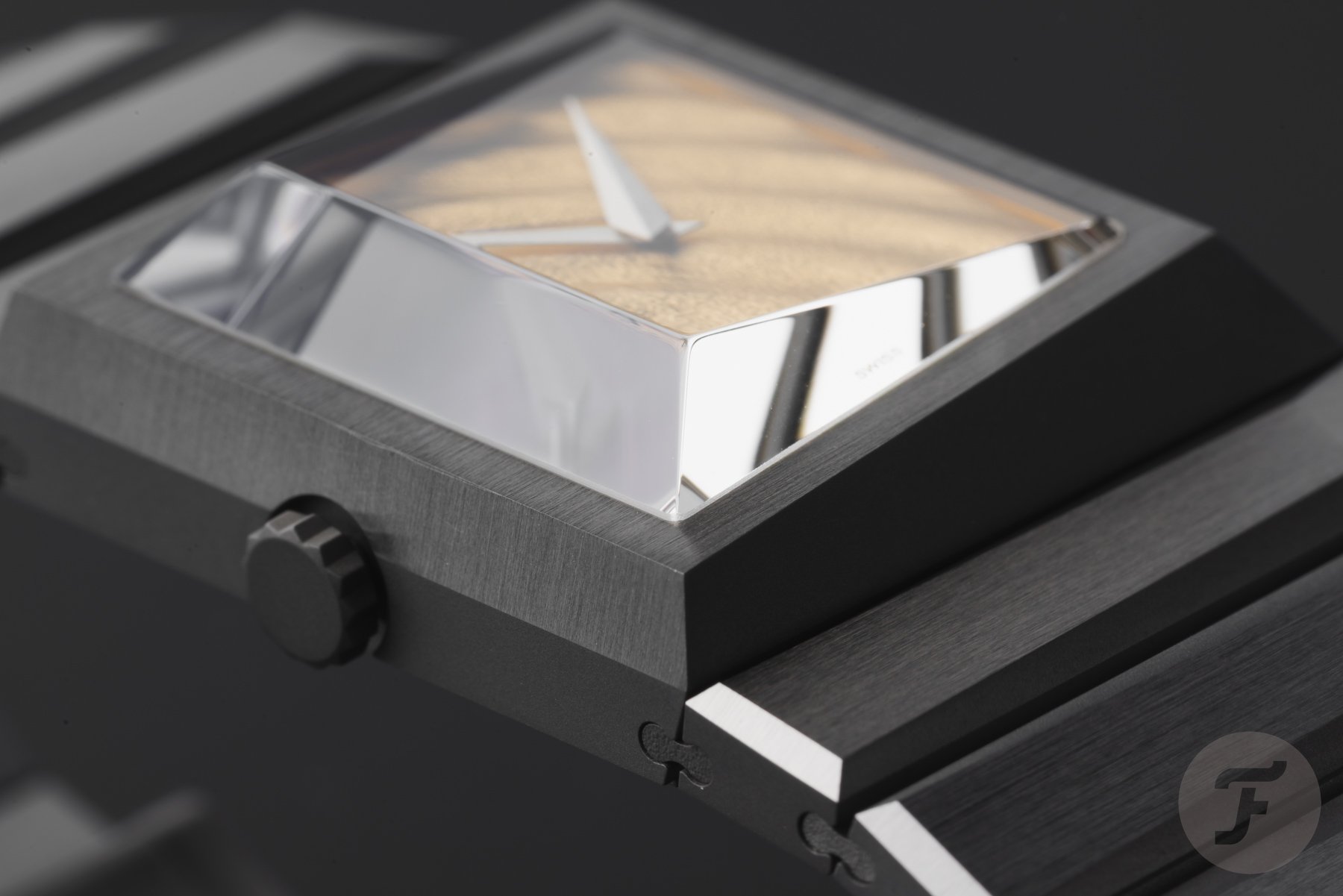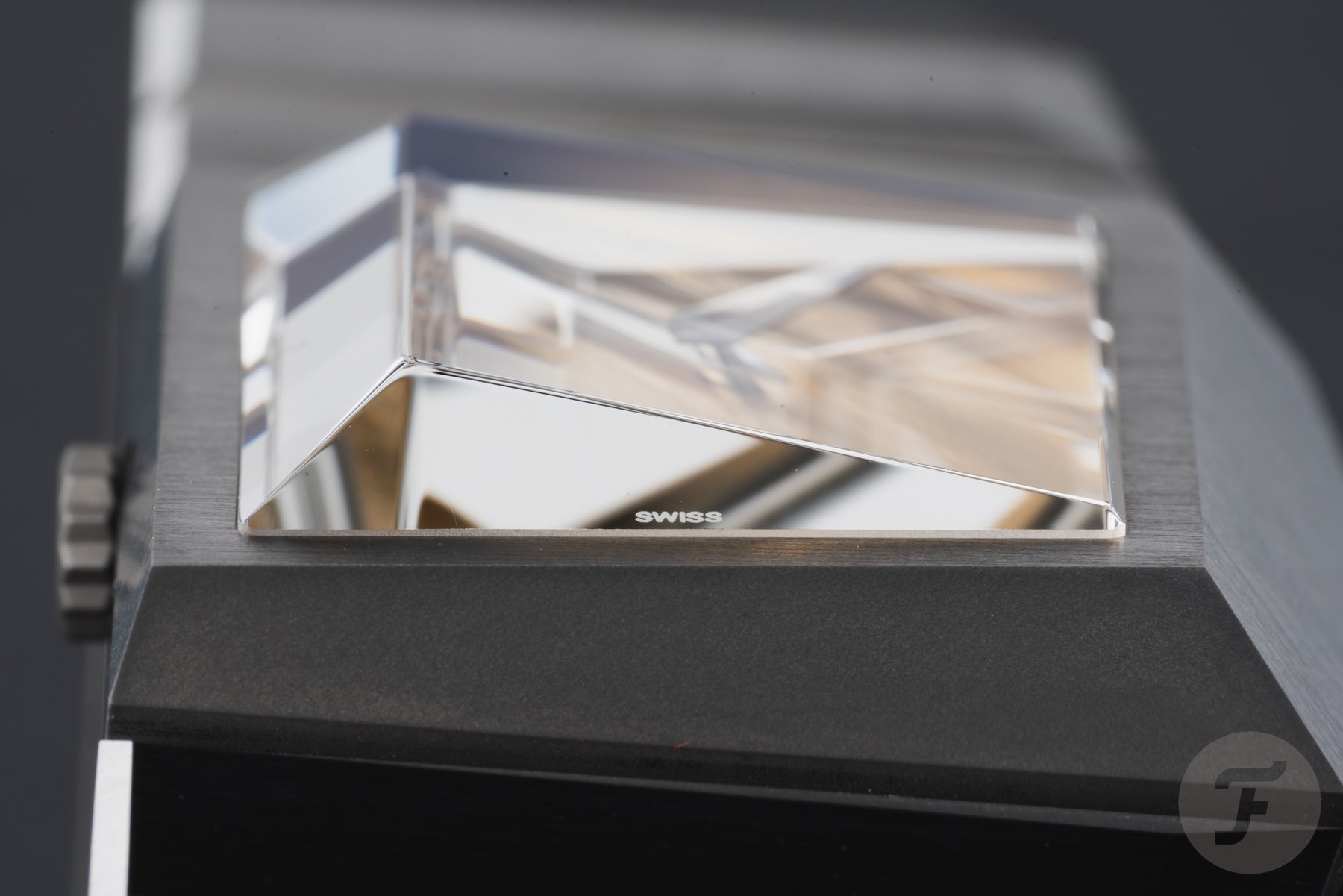 Especially in combination with the beautifully faceted sapphire crystal, the dial creates great visual drama. It was mesmerizing to see it for the first time. A nice detail is the laser-engraved “Swiss” text on the crystal. The dial and crystal are two signature elements that make this watch so alluring.