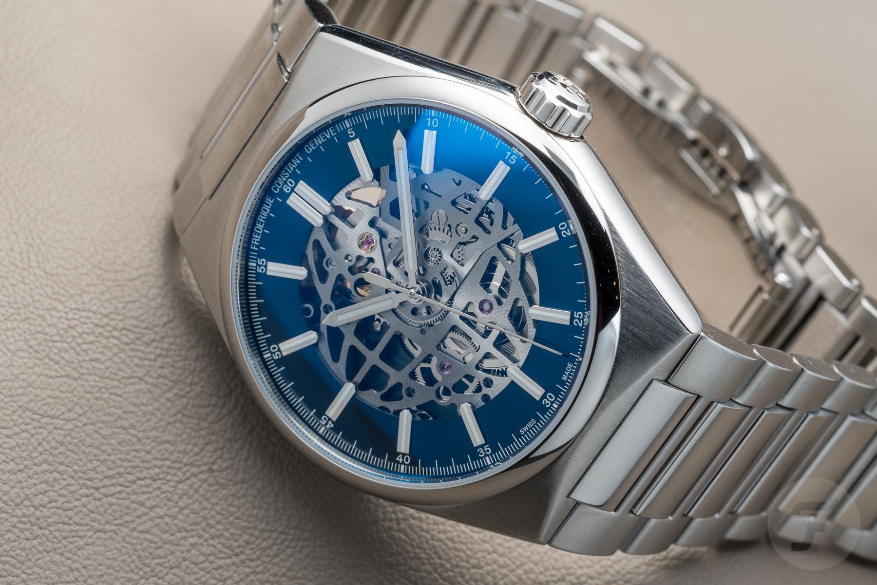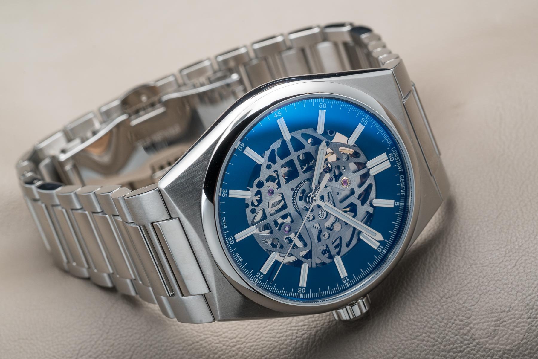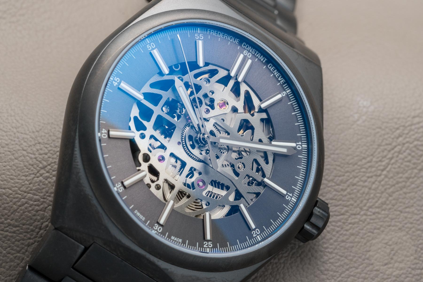 I’m pleased to say that Frederique Constant has delivered on that front. The slim h-link bracelet is extremely comfortable on the wrist. A dual-pusher deployant clasp nicely signed with the brand’s logo secures the watch to your wrist. These butterfly clasps can sometimes make it hard to get the right fit due to the lack of micro-adjustment. However, the relatively small links allow you to adjust the bracelet as needed. Should the bracelet not be for you, you’re in luck! The Highlife Automatic Skeleton comes with a matching rubber strap. Blue in the case of the steel model, and dark grey for the titanium PVD-coated reference. Both the bracelet and strap feature a quick-release system, for stress-free strap swaps.