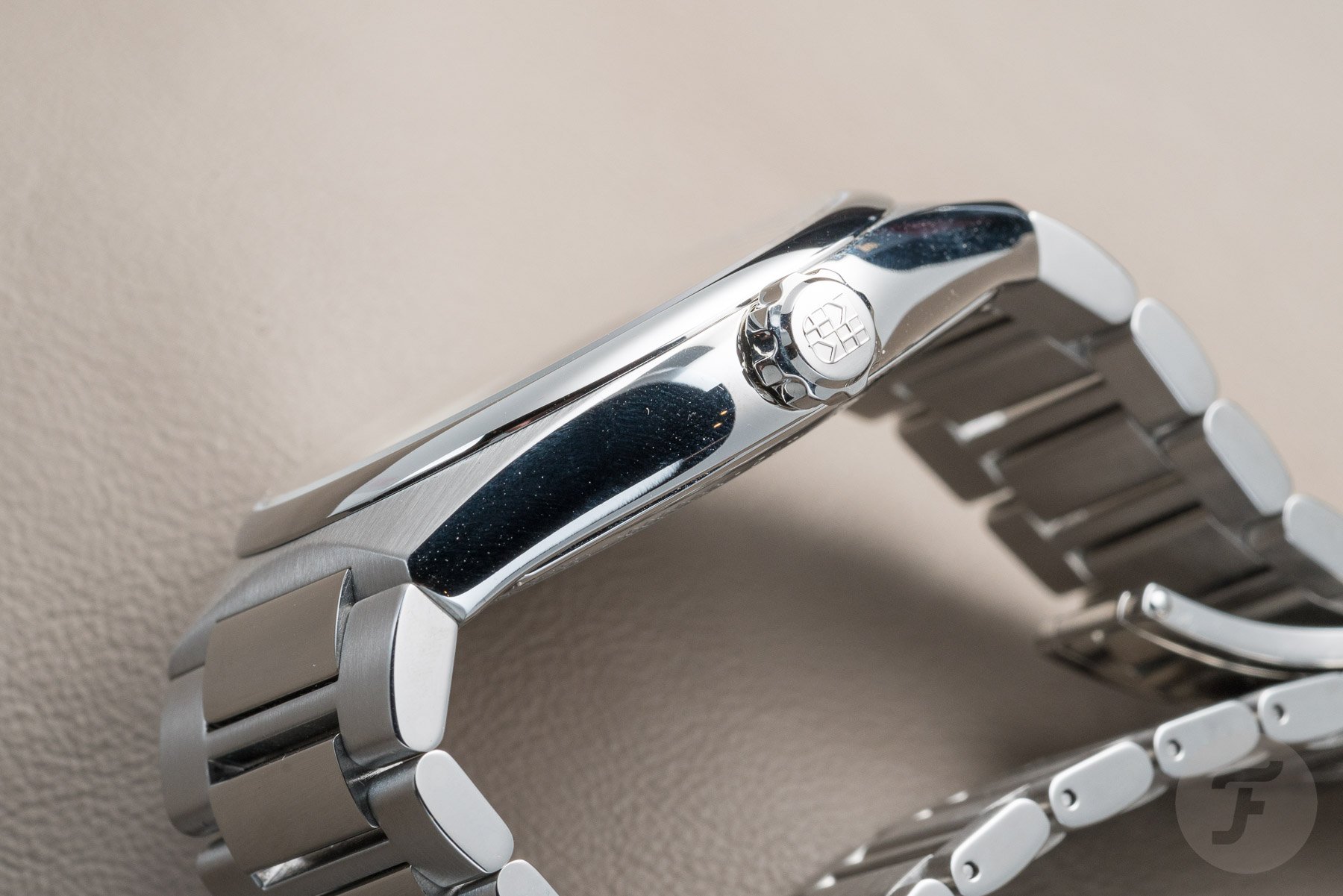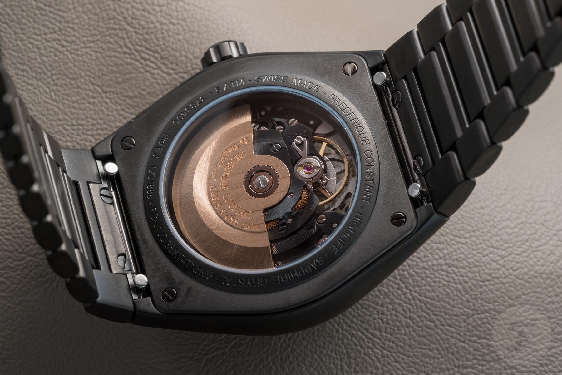 What you will see through both the front and back of the watch is the caliber FC-310 operating at 28,800 VpH and with a power reserve of 38 hours. The movement features blackened elements and a wonderful gold rotor. The case on the steel model has a polished bezel and brushed finish to match the bracelet, where the titanium PVD-coated model has a uniform matt look.