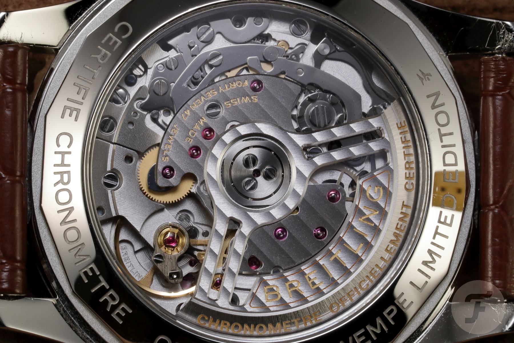 Breitling’s manufacture B01 caliber drives the Navitimer B01 Chronograph 43 Signature Collection. Its chronograph functions are controlled by a column wheel, which engages via a vertical clutch. This movement beats at 4Hz (28,800vph) and has a power reserve of approximately 70 hours. It bears a COSC chronometer certification as well. In the image, you can see the seven tiny steel balls of the ball bearing retaining the winding rotor. These enable effective winding in both directions. These characteristics show that the B01 is a modern and pretty well-designed movement. The finishing is industrial, yet some decorations in the form of Geneva stripes and radial graining are cleverly placed to create an appealing look.