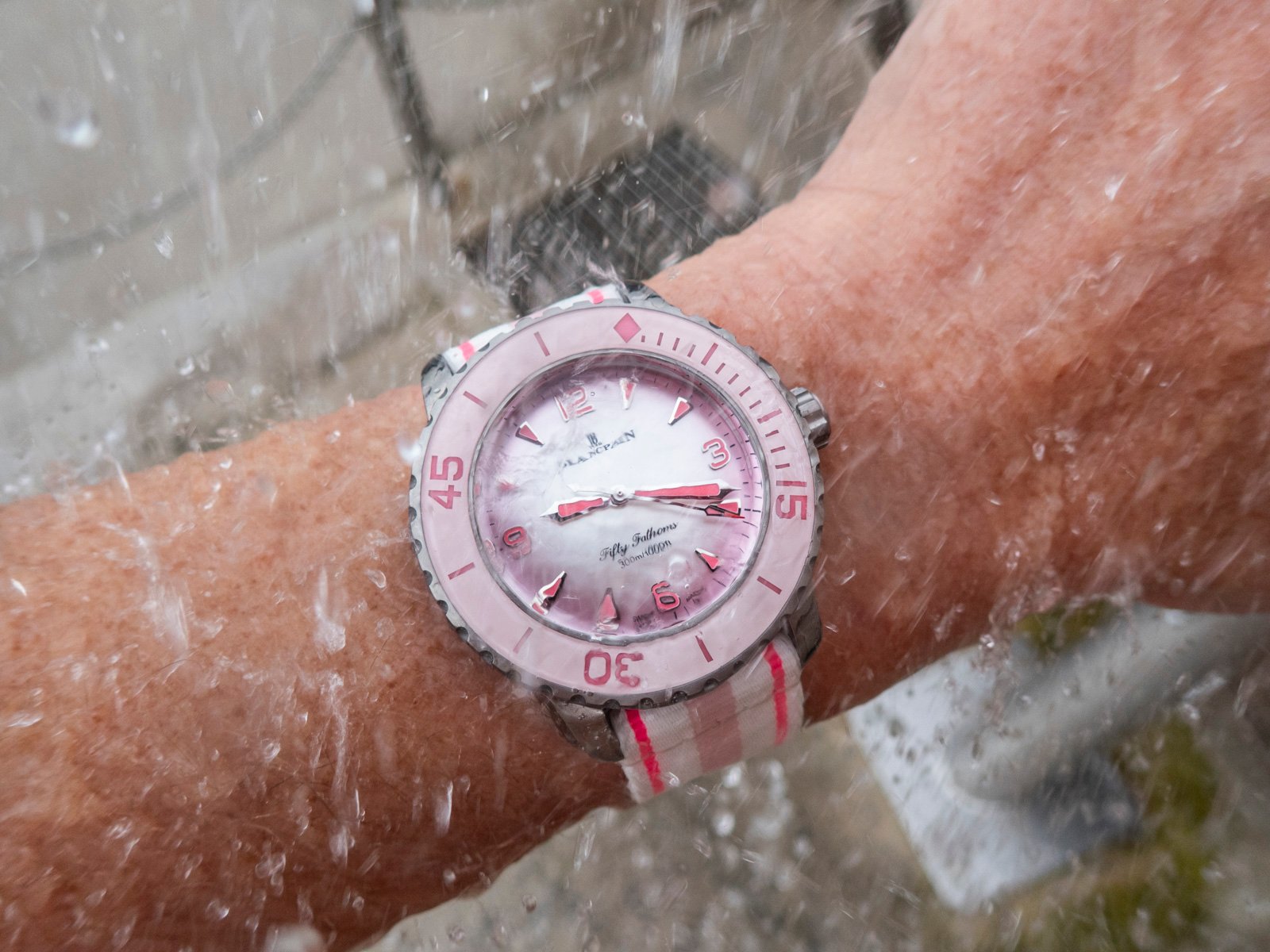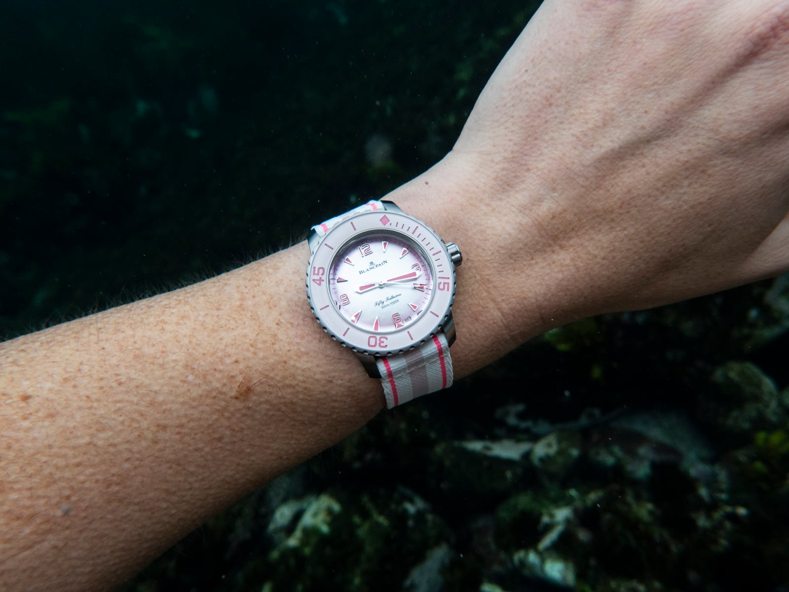 During a wear test in the Pacific, the pink dial proved not only enjoyable but also impressively functional. Pink, as it turns out, is more legible underwater than one might guess, particularly when paired with strong lume and a mother-of-pearl base that reflects ambient light beautifully. The Fifty Fathoms has always been a serious dive watch, and I expected the color to be the point of compromise. Instead, it became the watch’s personality. One thing I would say, though, is that to tone down the intensity of the experience, I’d change the strap to something a little more neutral.