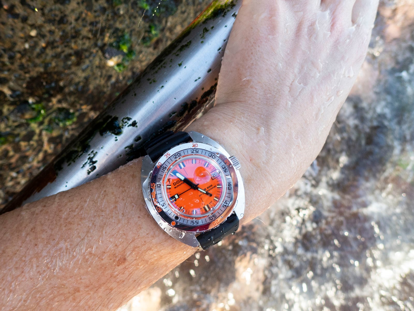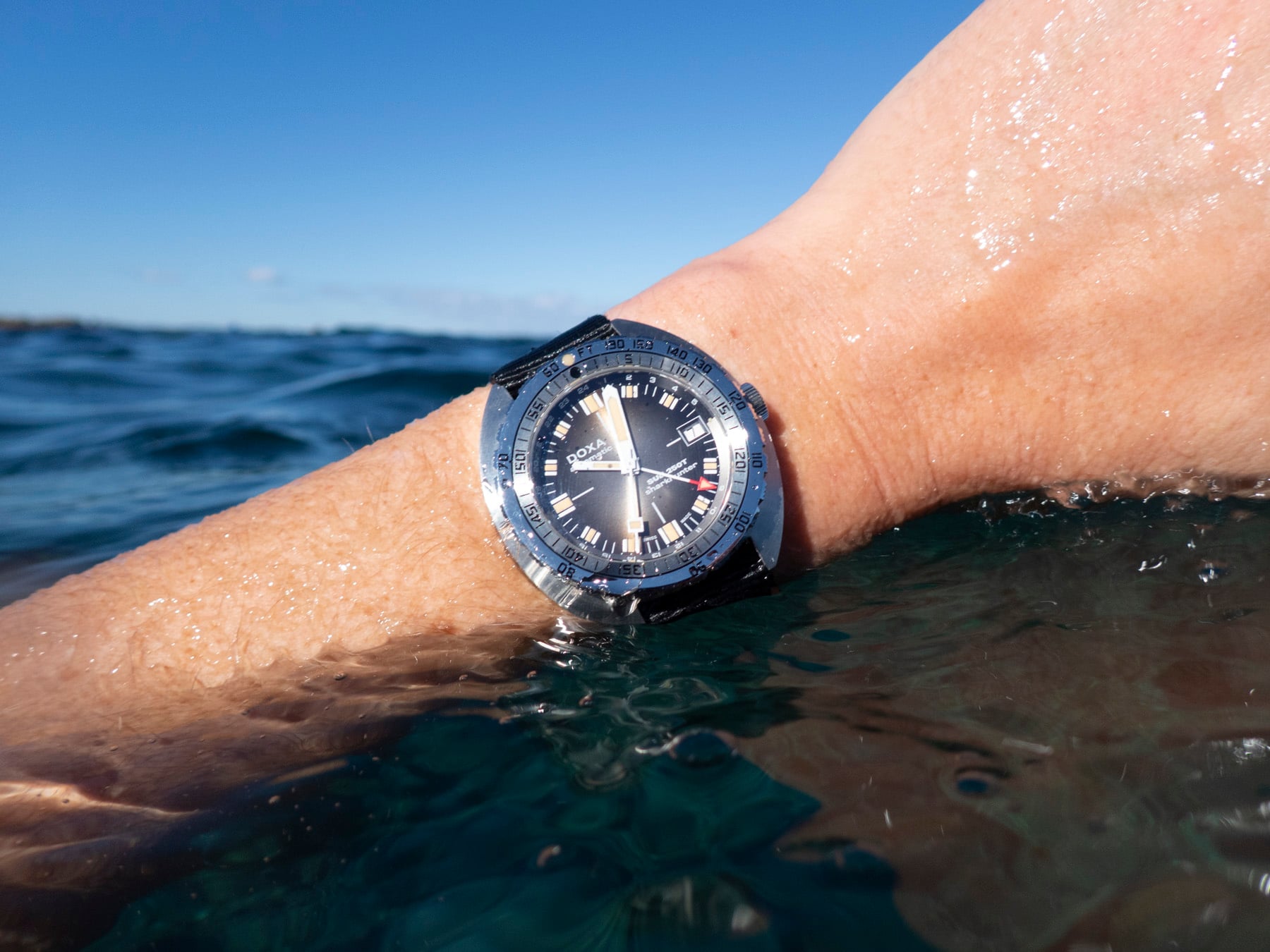 A week after the watch arrived, I took it out to the Pacific off Sydney’s eastern beaches — the kind of shifting coastline where sandstone shelves drop to kelp forests, and the swell can go from placid to punishing in an hour. On the stainless steel beads-of-rice bracelet, the watch hugged the wrist comfortably under a wetsuit. Doxa’s modern bracelet design remains one of the most wearable in its class, with polished “rice” beads catching glints of water and sun.