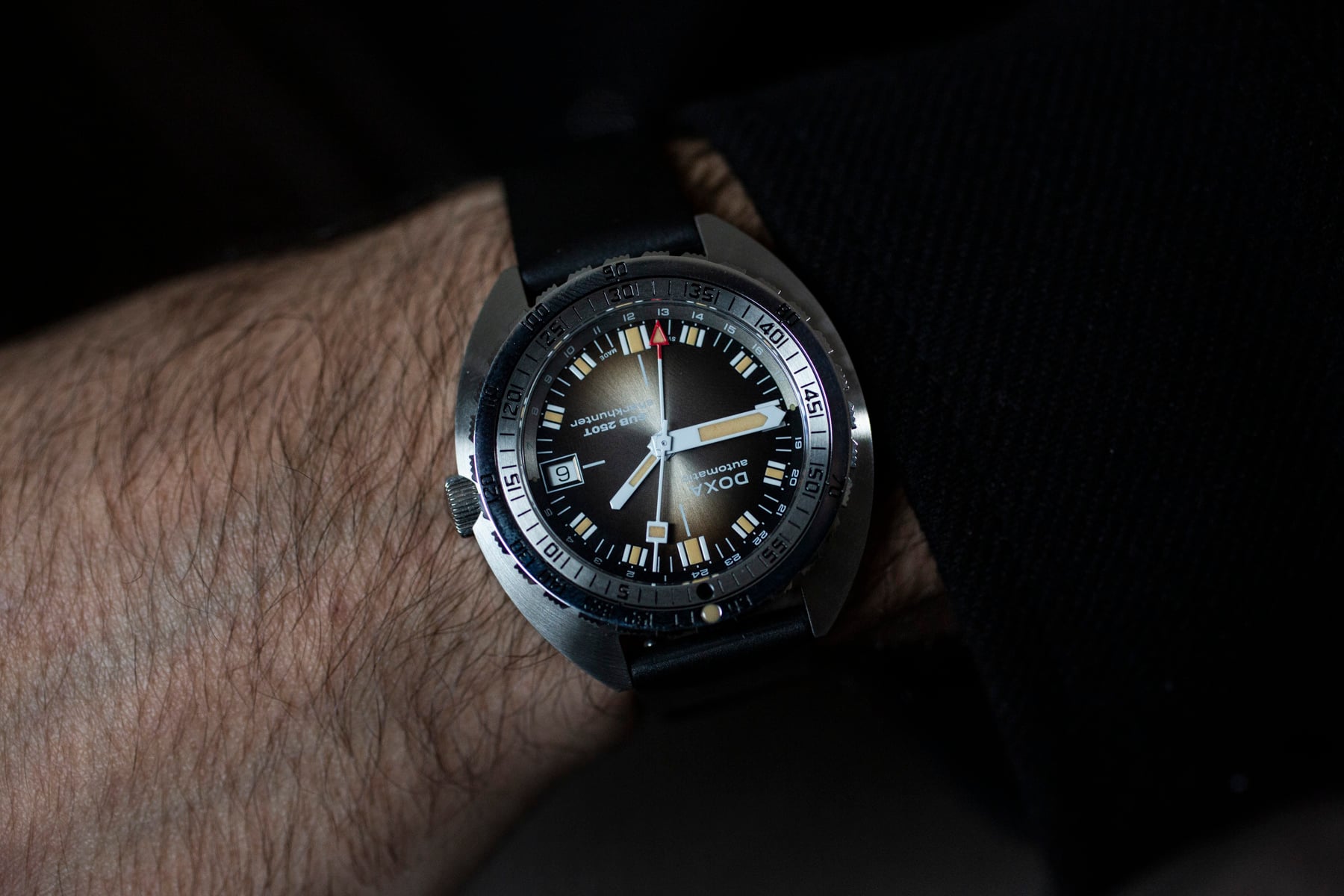 The standout feature of this particular model — and the one that had me immediately reaching for a loupe — is the dial. Doxa calls it “Vintage,” though that word is often abused in the watch world. Here, it earns its place. The fumé gradient moves from a soft charcoal in the center to a deep midnight at the edges. It’s subtle, almost reluctant to reveal itself indoors, but outdoors, particularly in the Australian sunshine, it gives the watch an atmospheric depth uncommon in tool divers. The lume is a beige tone but thankfully not “forced patina” in the kitschy sense; it simply softens the starkness of the indexes and hands, grounding them in a more analog aesthetic.