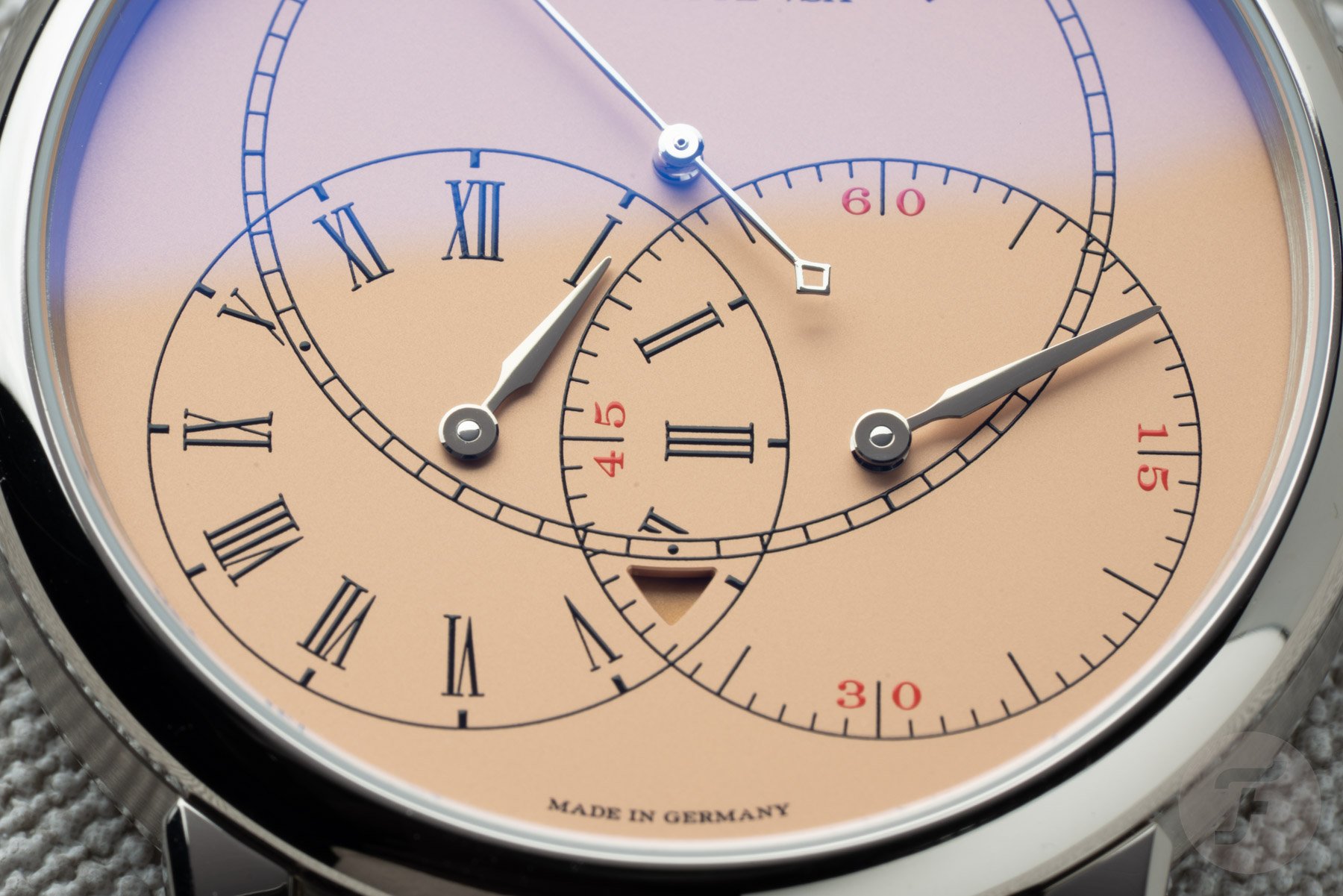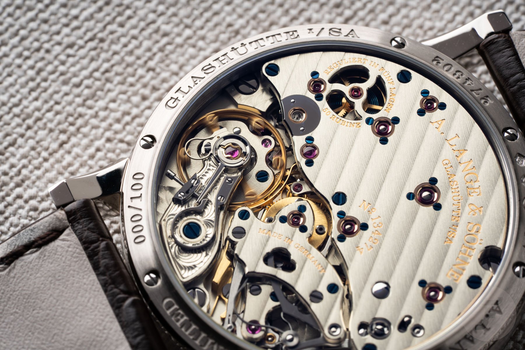 The complications can be enjoyed through the sapphire display case back. Yes, the typical-for-German-watches three-quarter plate is there, covering many of the intricacies beneath. However, I’d say it is more of a three-fifths plate here, enabling a view of the unique adaptations to (and around) the escapement. It offers refinements that, again, only connoisseurs will recognize. The hand-applied anglage with sharp internal corners, for instance, requires some knowledge to truly appreciate. The same applies to the beautiful black-polished details and gold chatons for the rubies.