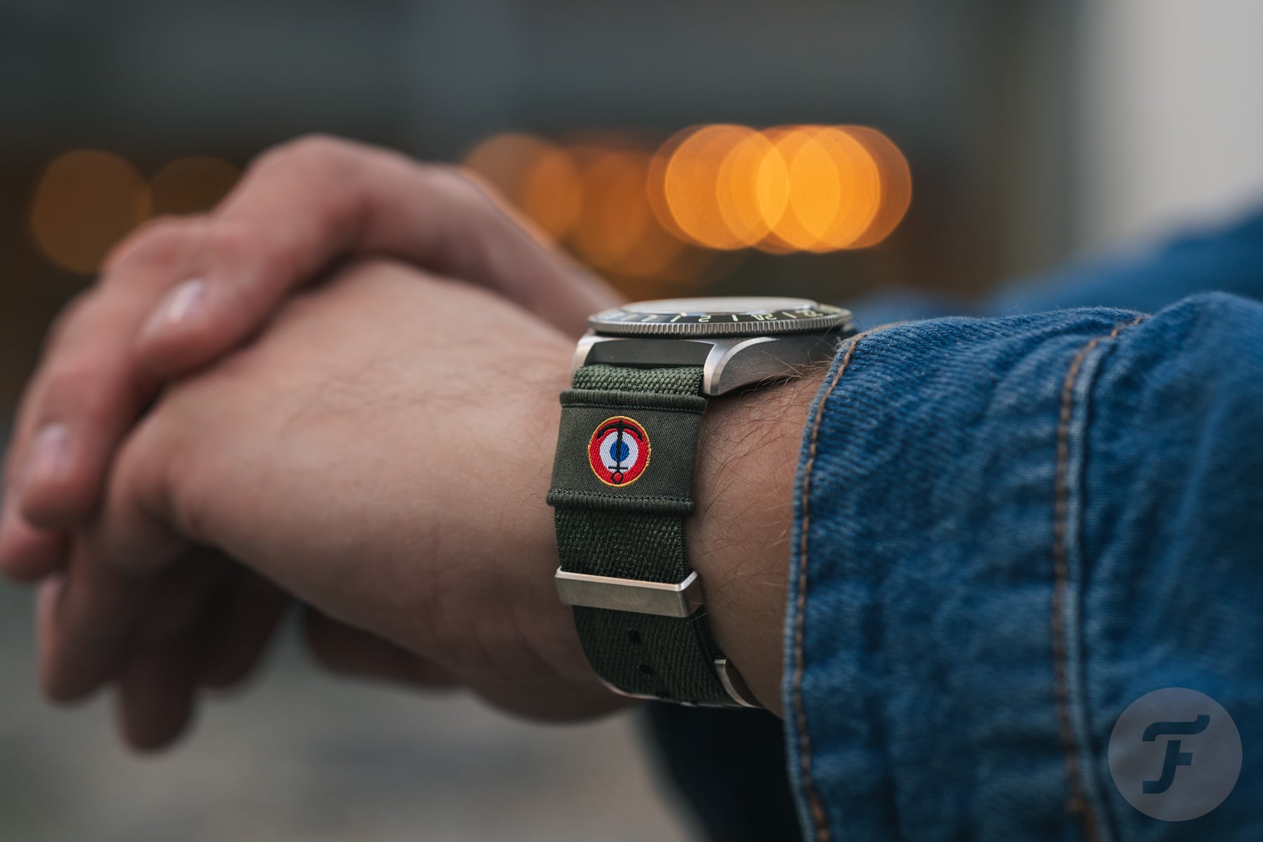 But this is a modern hardcore tool watch, so its size fits its purpose perfectly. The green single-pass strap is another element that adds to that character. When I first saw the images of the watch, I wasn’t a fan of the large Marine Nationale emblem on the large keeper. Vintage Marine Nationale models do not have large identifying elements on the dial or strap, and neither did the first blue Pelagos FXD.
