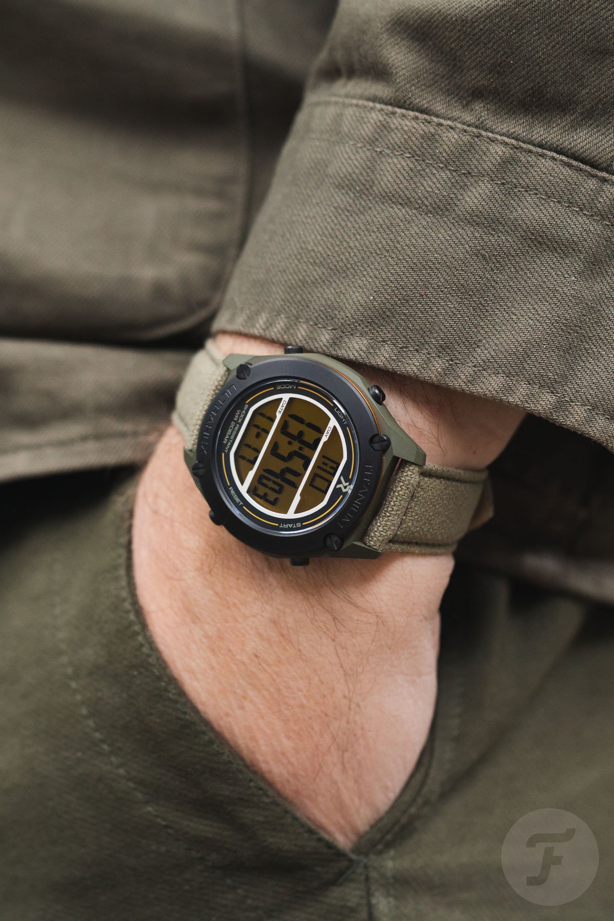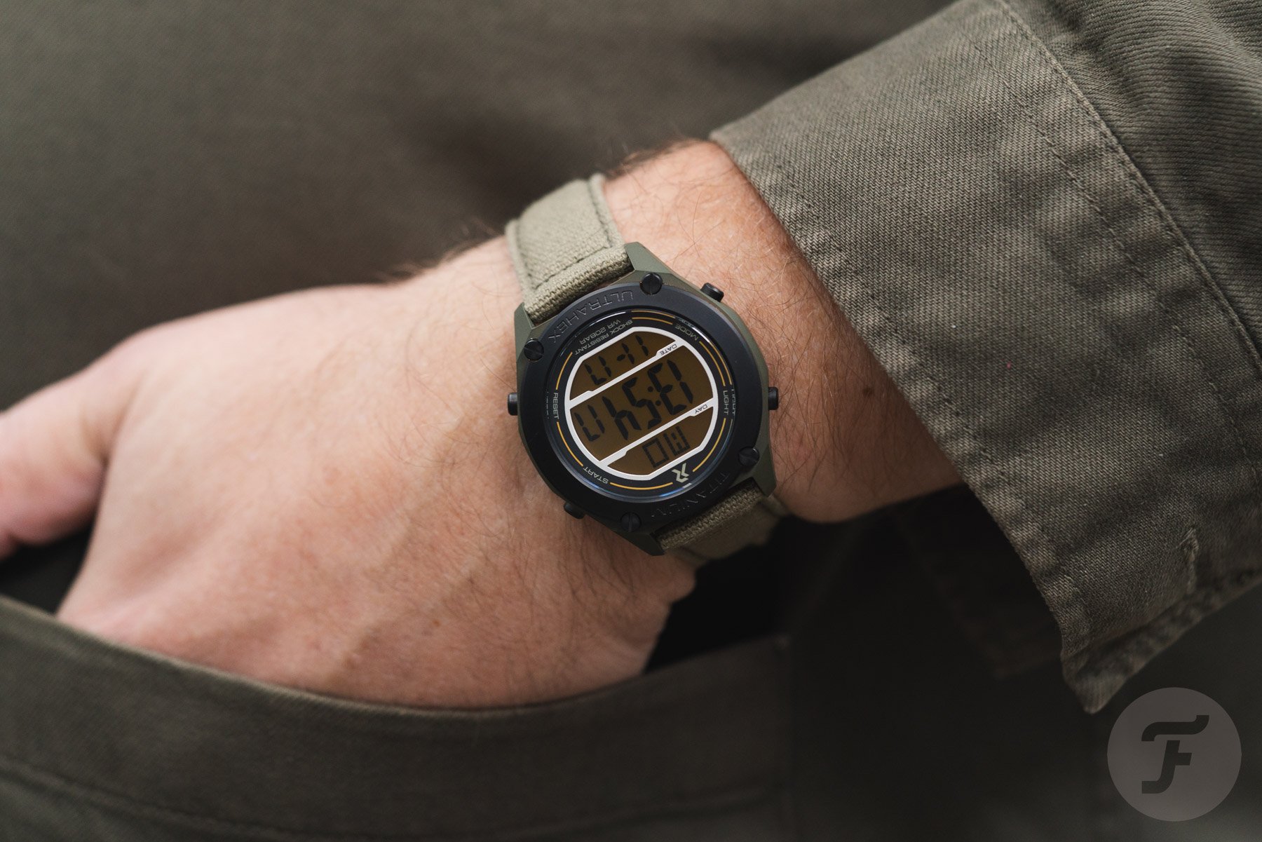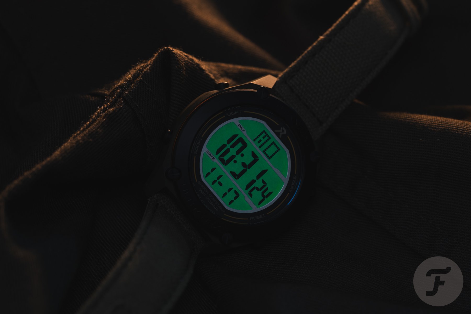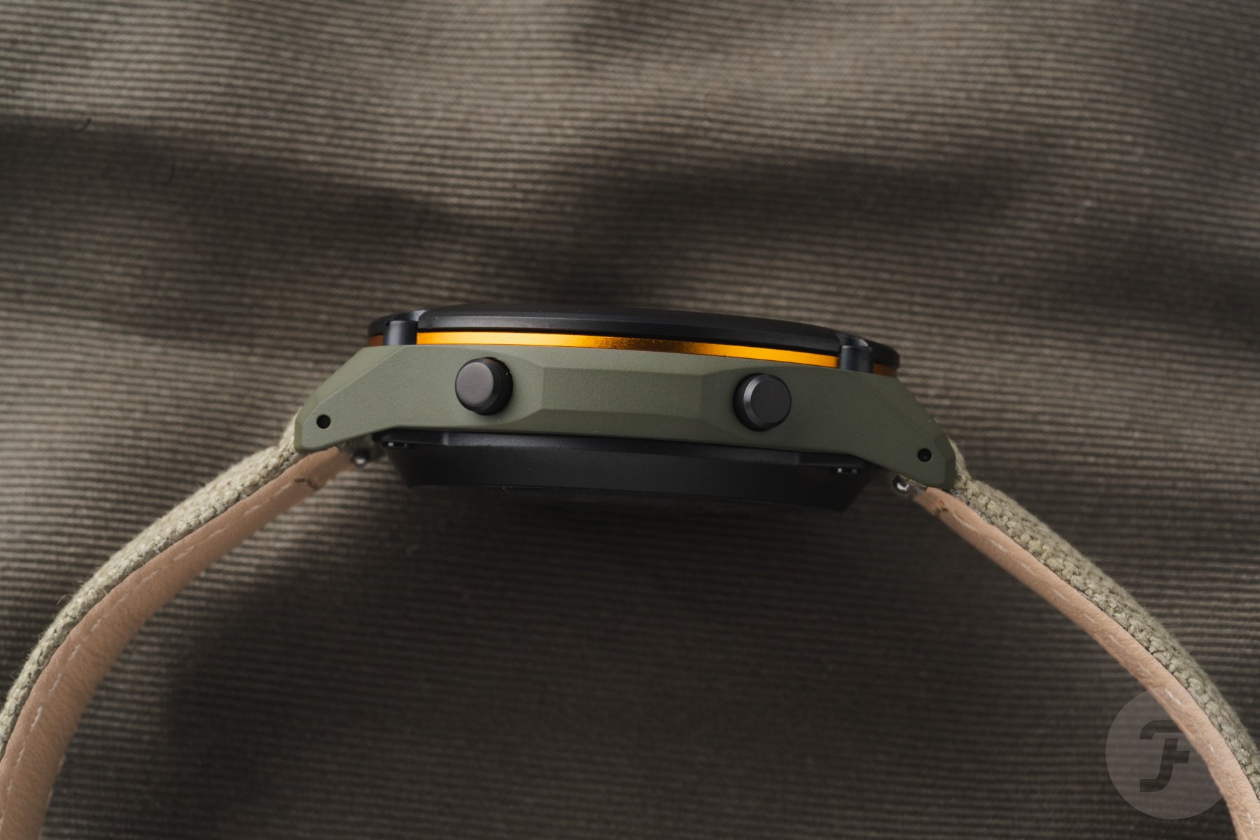 A nice detail is that the display is a warm amber color. It matches the orange ring on the green outer dial, which holds the logo and spec-related text. Additionally, it brings a certain warmth that adds to the overall appeal of the watch.