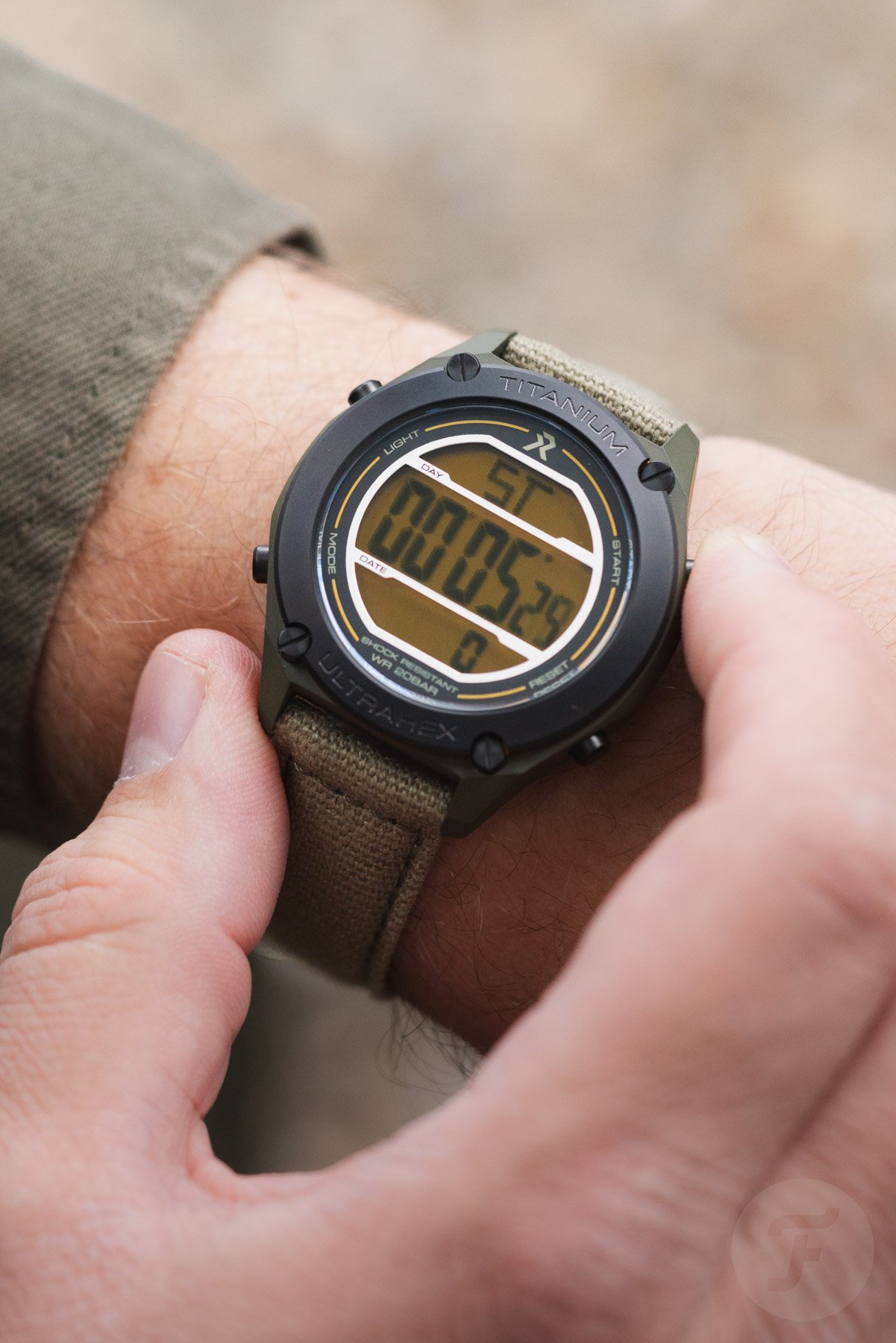 On the wrist, the new RZE UTD-8000-CKG is a blast. It is super lightweight thanks to the titanium case, and the proportions are spot on, allowing it to sit comfortably on the wrist. It boasts a significant presence thanks to its vibrant colors and large display. The short lugs slope down steeply, ensuring the strap wraps easily around the wrist. Additionally, the strap is sturdy yet flexible enough to be extremely comfortable. It makes wearing the watch an absolute joy.