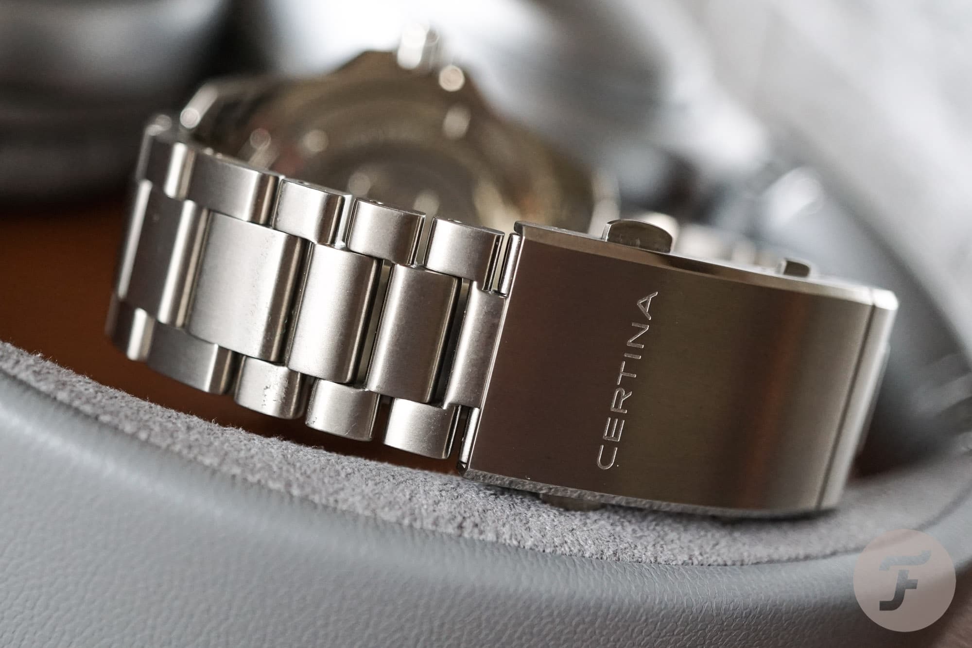 What is a titanium watch without a titanium bracelet? If you consider getting the Certina DS Action Diver Titanium, you won’t ever have to know this. The bracelet, which has 21mm wide lug size (I don’t know why), is as rugged as a sports watch bracelet gets. The fold-over clasp has two safety buttons and the name Certina in-between them. However, as you’d expect from a diver, there is a smart built-in diving extension. This is at the bottom of the clasp also secured with two safety push-buttons. Deskdivers can use the extension as a micro-adjustment. The system is pretty similar to the Doxa Expandro clasp I talked about here. The bracelet fits the watch head; it is not too thick or bulky at all. One point worth mentioning is that the links have push pins, so the bracelet is super easy to resize.