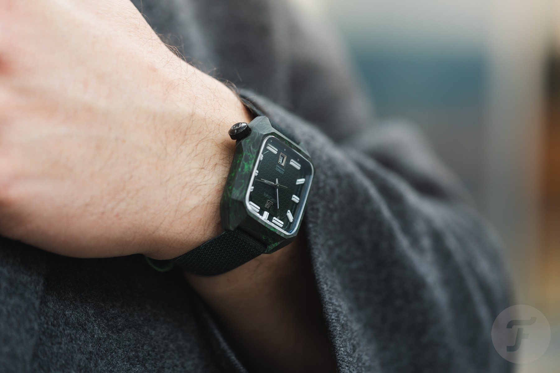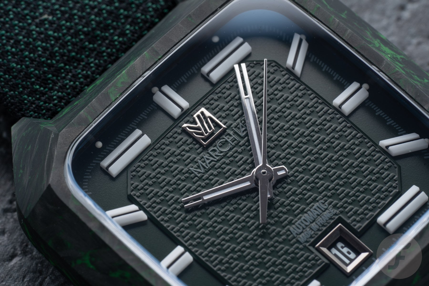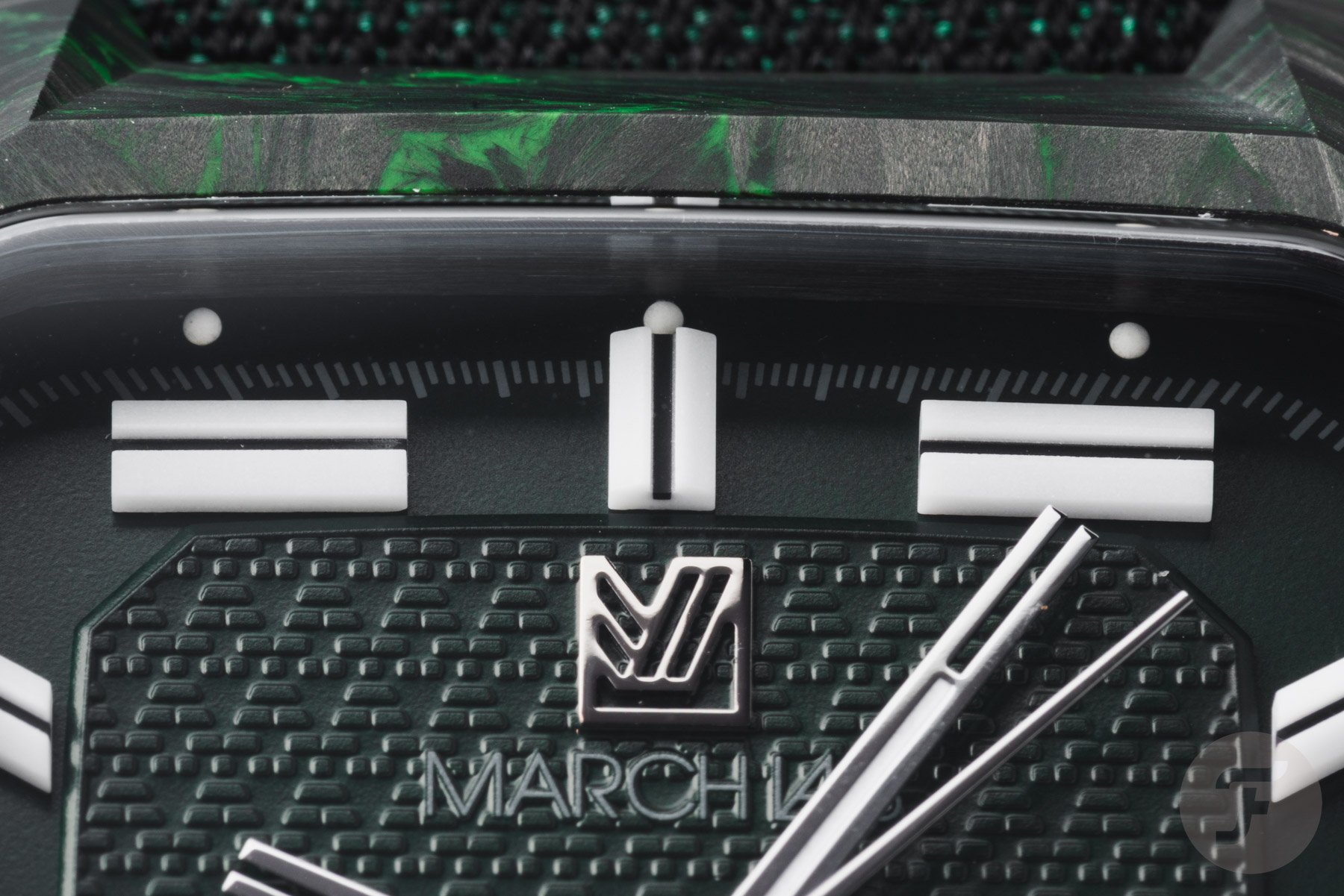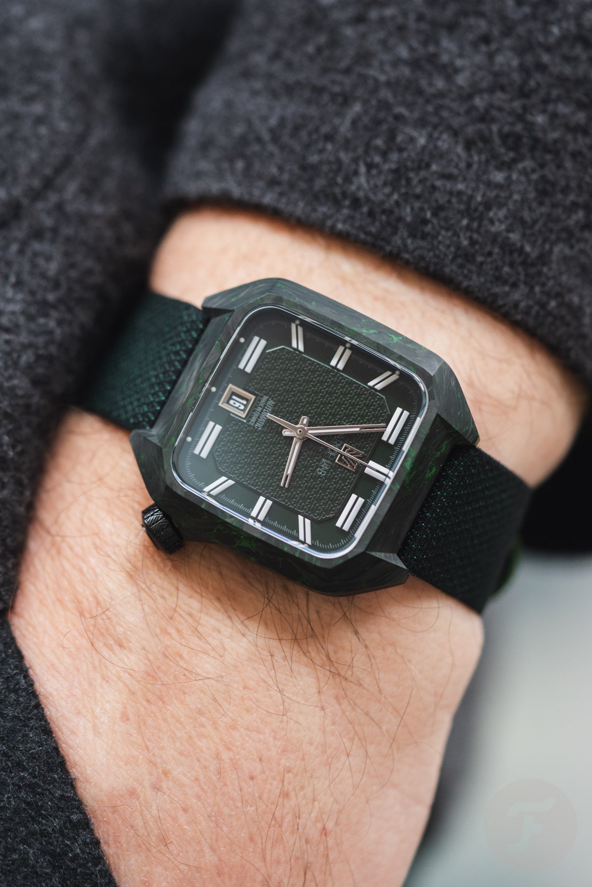 Inside the black-and-green carbon case lies a dark green two-part dial. The central part features a special “armor” motif inspired by the two jacquard-woven straps that come with the watch. The outer portion of the dial houses the large 3D lume markers, connected by the white-printed minute track. As you can see, the large markers at 1, 5, 7, and 11 o’clock are horizontal. I like this design detail because it adds character.