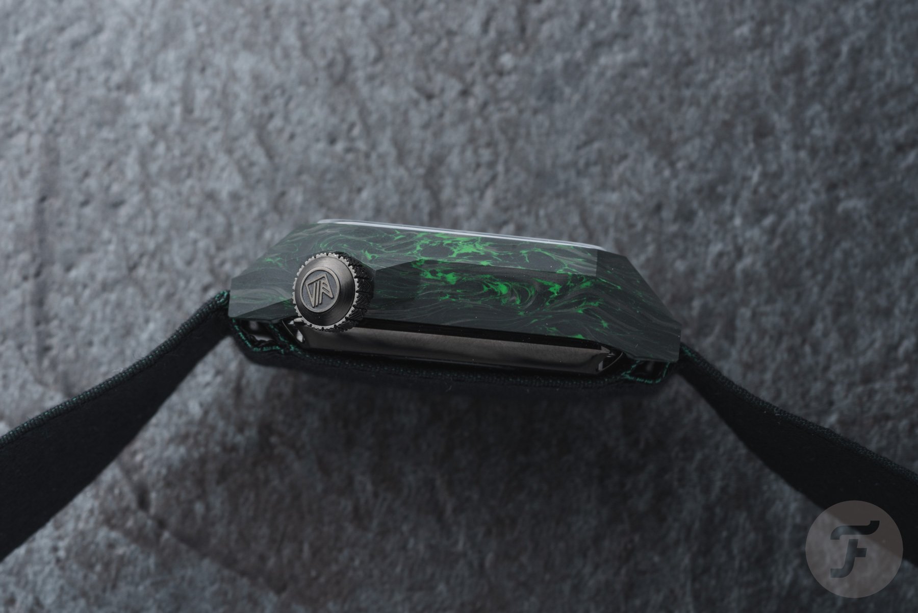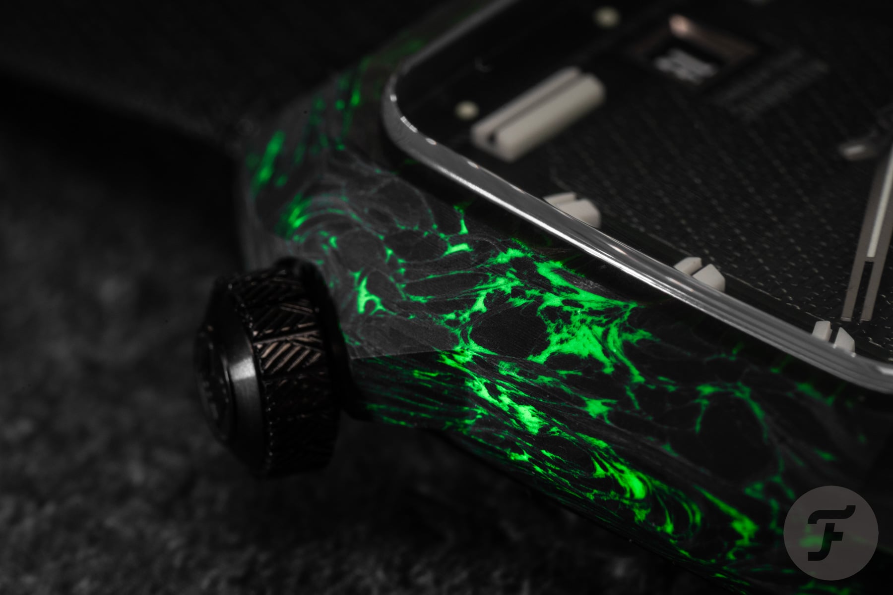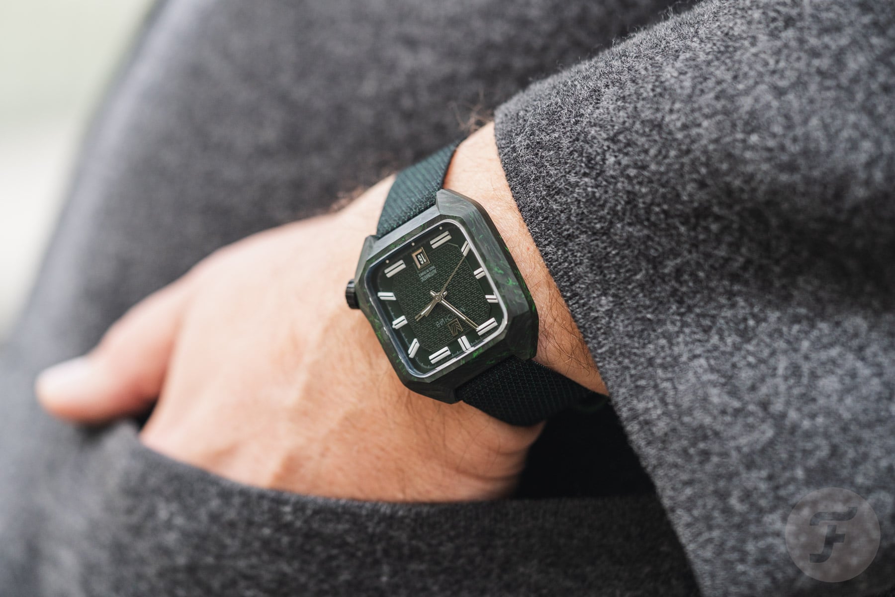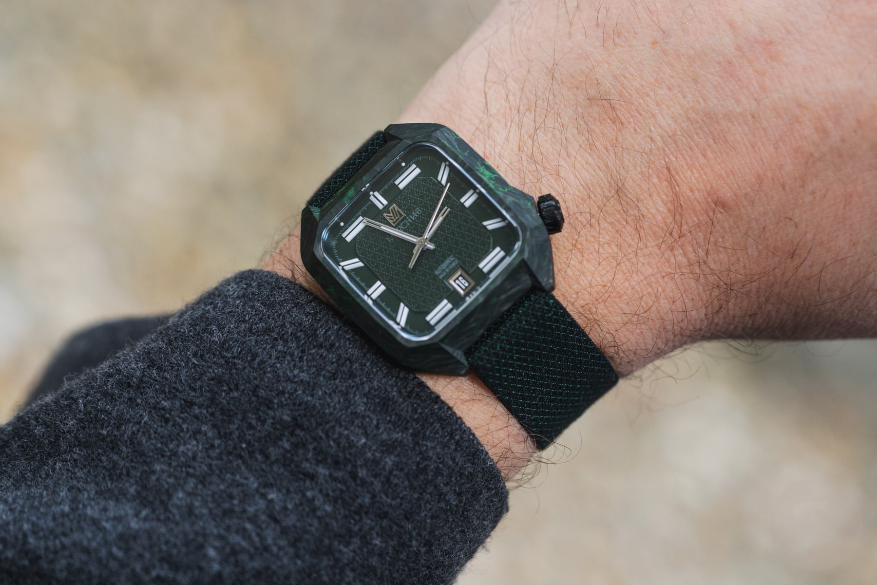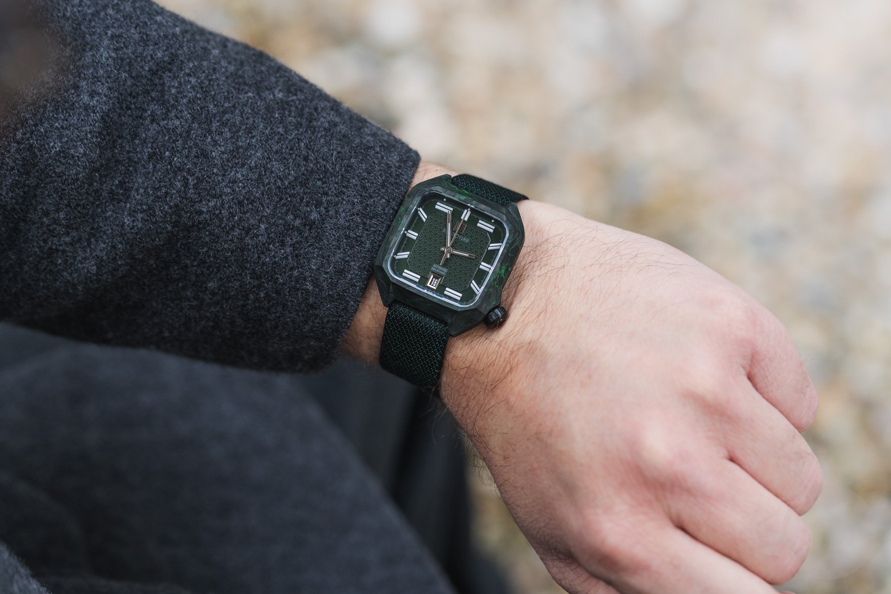 Inside the black-and-green carbon case lies a dark green two-part dial. The central part features a special “armor” motif inspired by the two jacquard-woven straps that come with the watch. The outer portion of the dial houses the large 3D lume markers, connected by the white-printed minute track. As you can see, the large markers at 1, 5, 7, and 11 o’clock are horizontal. I like this design detail because it adds character.