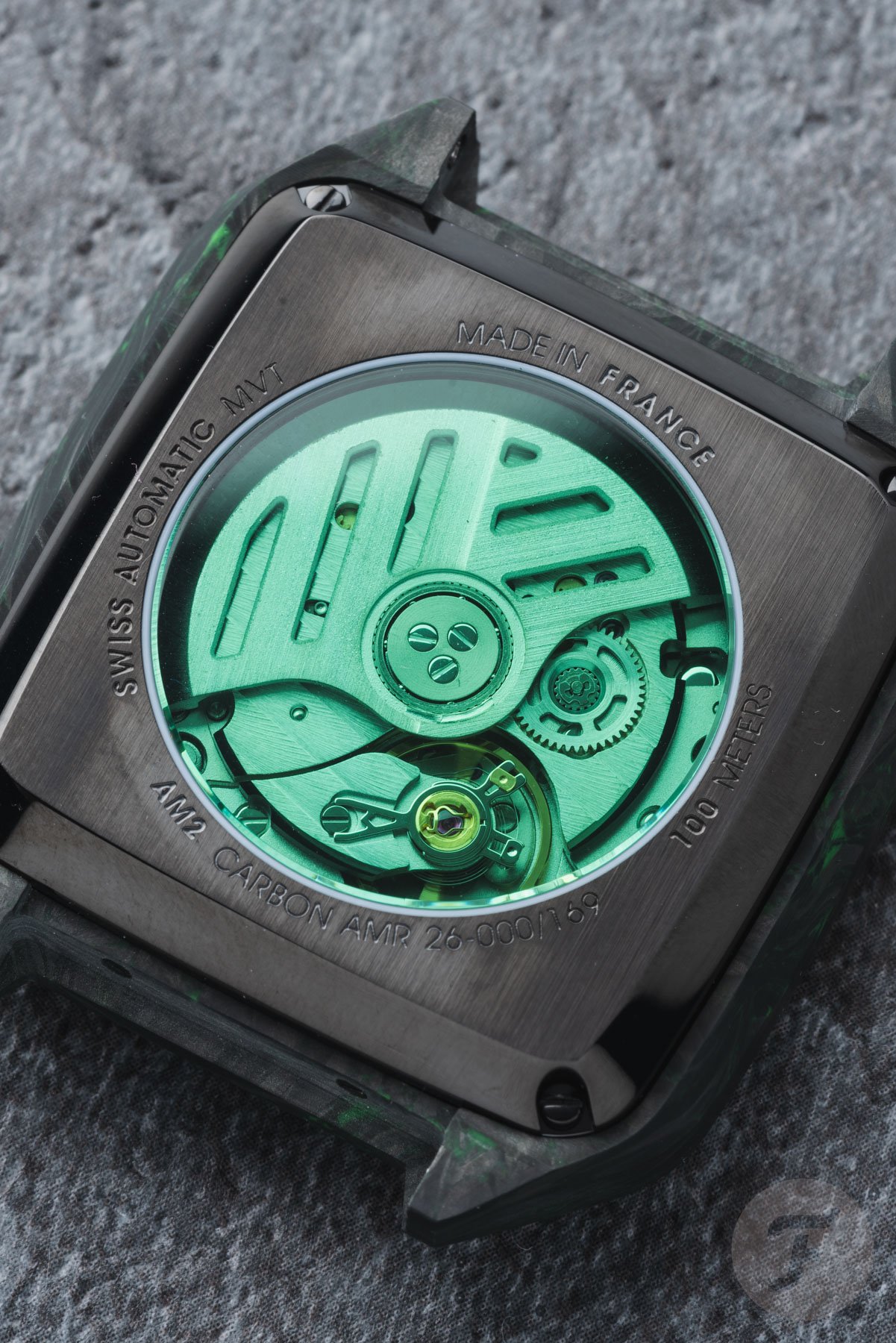It has plenty of wrist presence, and thanks to the lightweight material, it’s a joy to wear. On top of that, the forged carbon immediately changes the watch’s presence. Whereas the regular stainless steel AM2 models feel distinctly retro, this “Nyctalope” Carbon version has a modern vibe that suits the watch’s design very well.