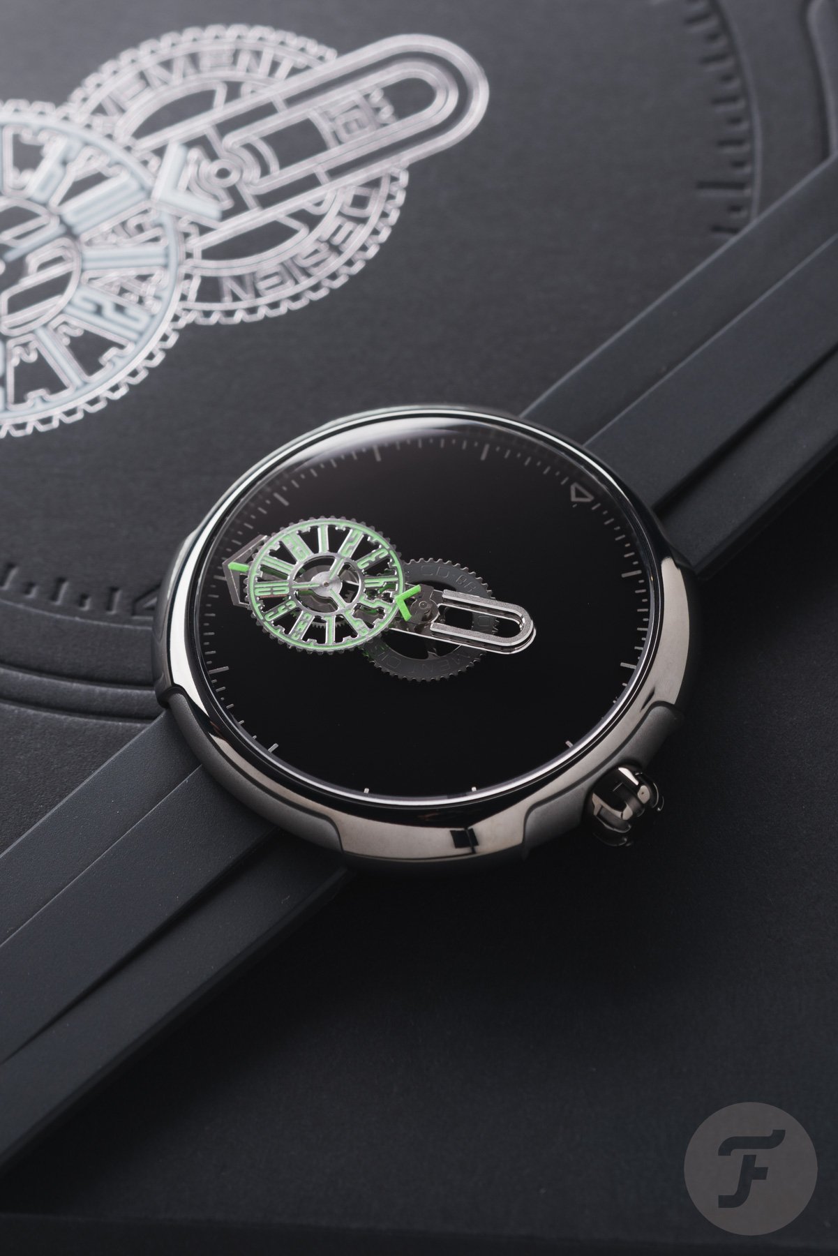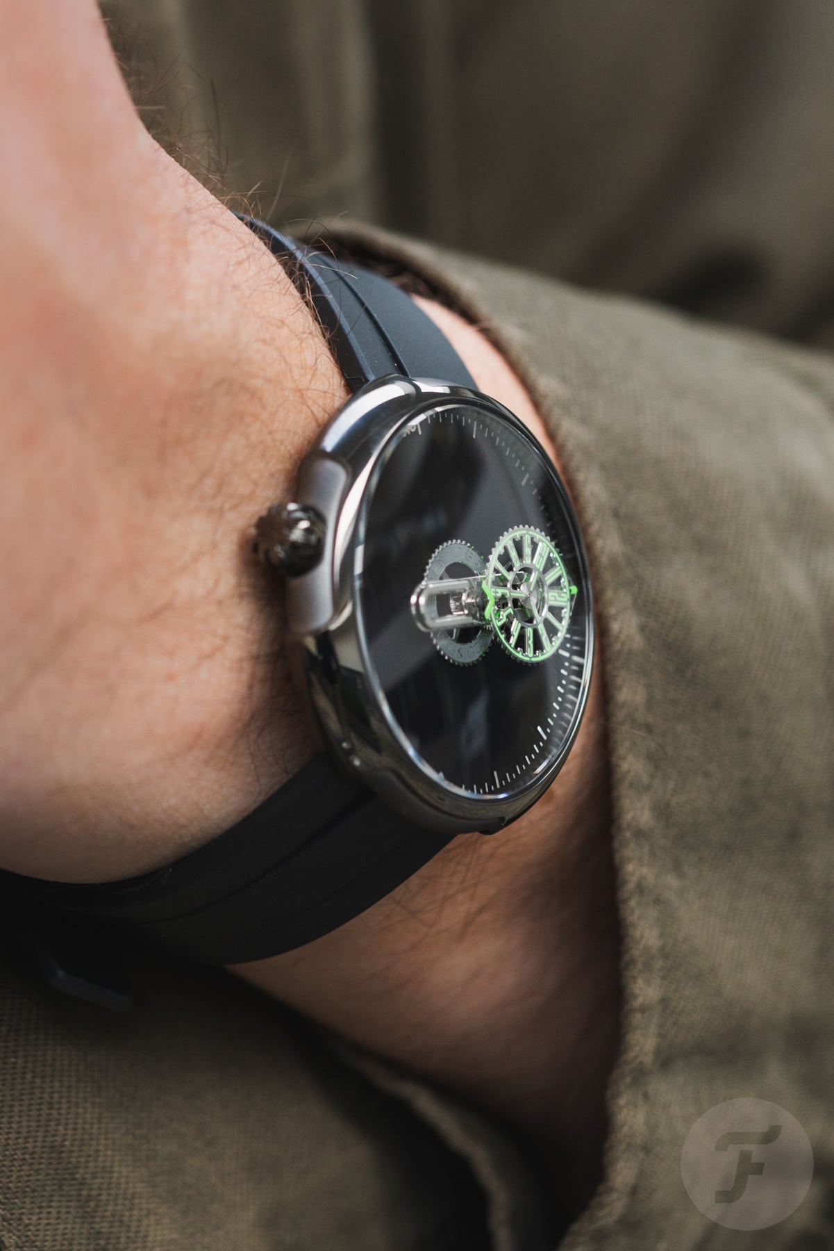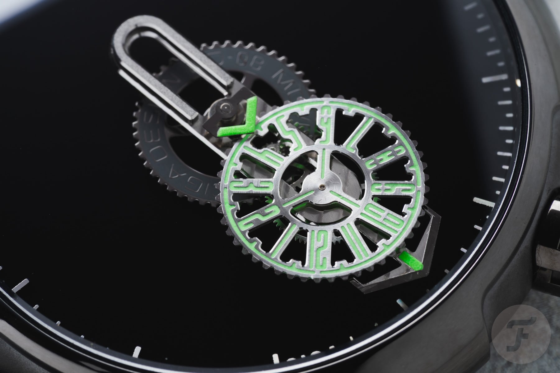 A gently domed sapphire crystal protects the Super Black dial, which absorbs 99.3% of light, similar to the more famous Vantablack dials. This makes it a great backdrop for the large arrow-shaped indicator that rotates around the dial to indicate the minutes on the raised CNC-engraved minute markers. Set atop the large minute arm is a rotating disc that indicates the hours via a centrally mounted indicator.
