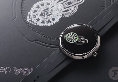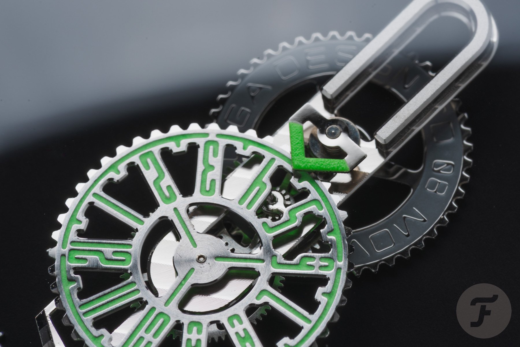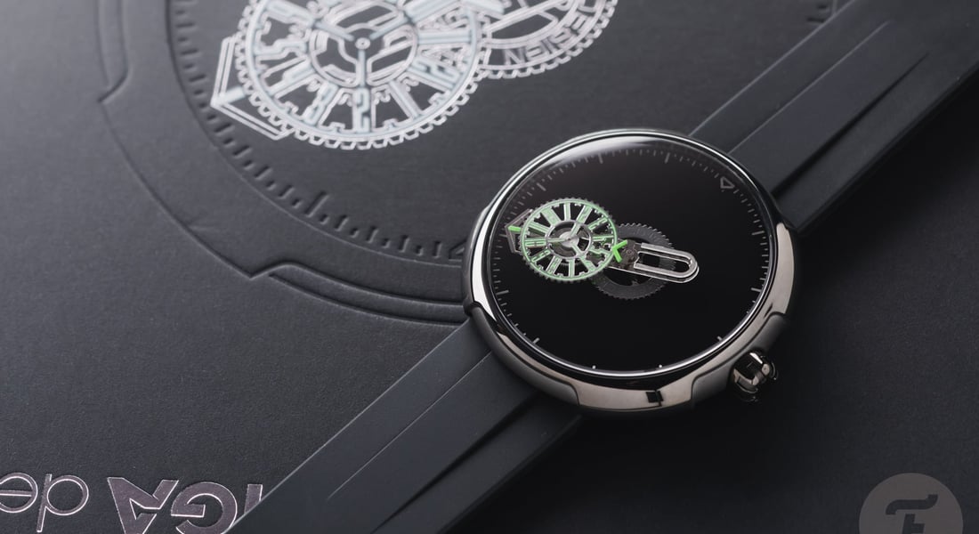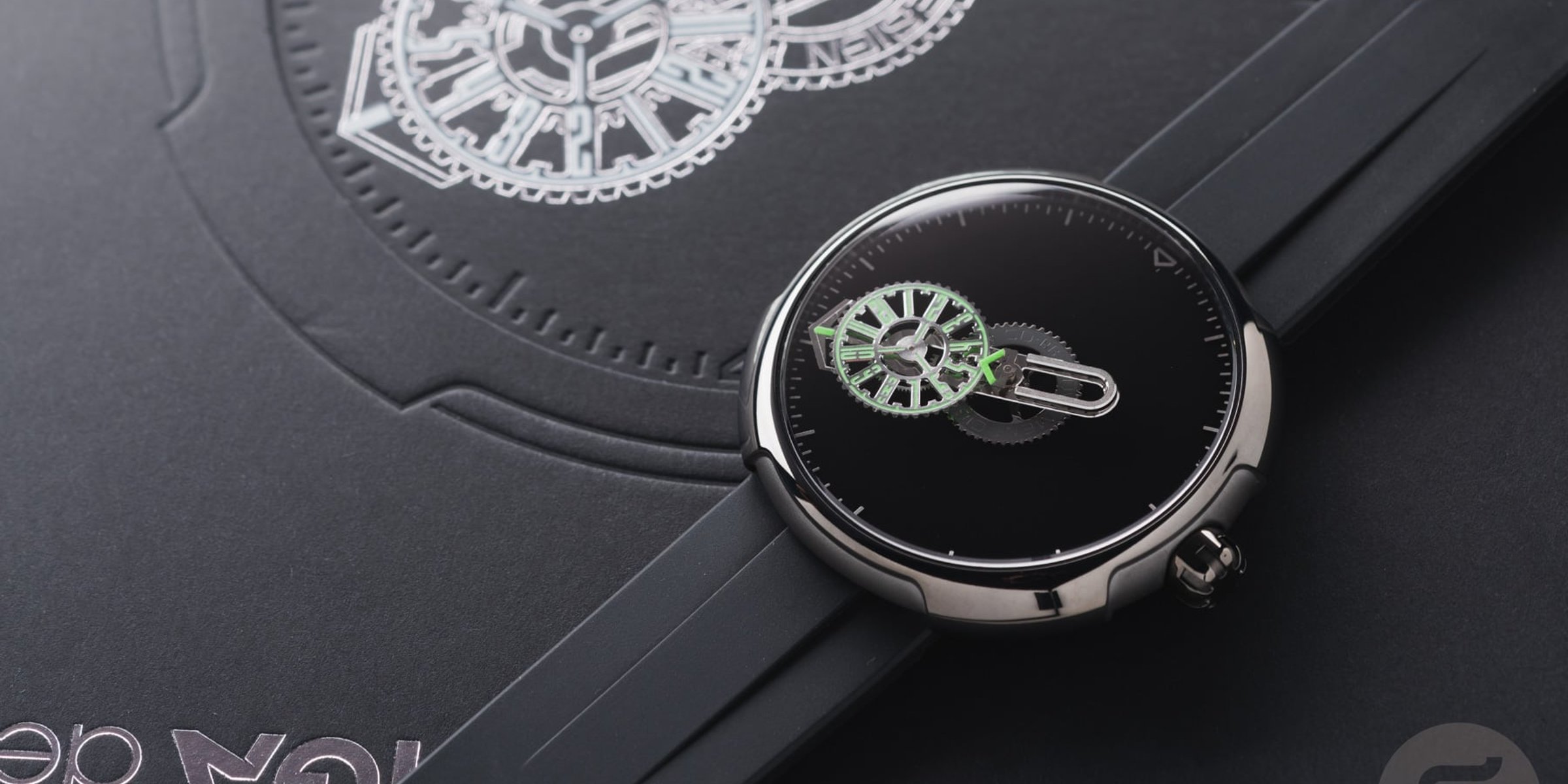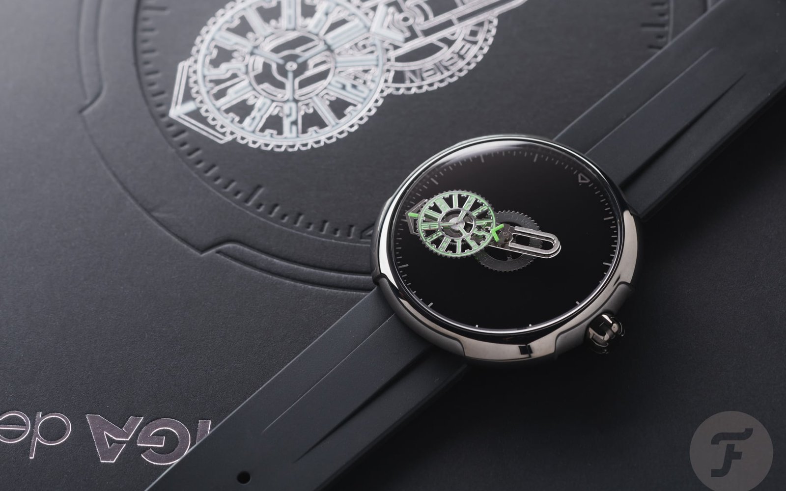 A gently domed sapphire crystal protects the Super Black dial, which absorbs 99.3% of light, similar to the more famous Vantablack dials. This makes it a great backdrop for the large arrow-shaped indicator that rotates around the dial to indicate the minutes on the raised CNC-engraved minute markers. Set atop the large minute arm is a rotating disc that indicates the hours via a centrally mounted indicator.
