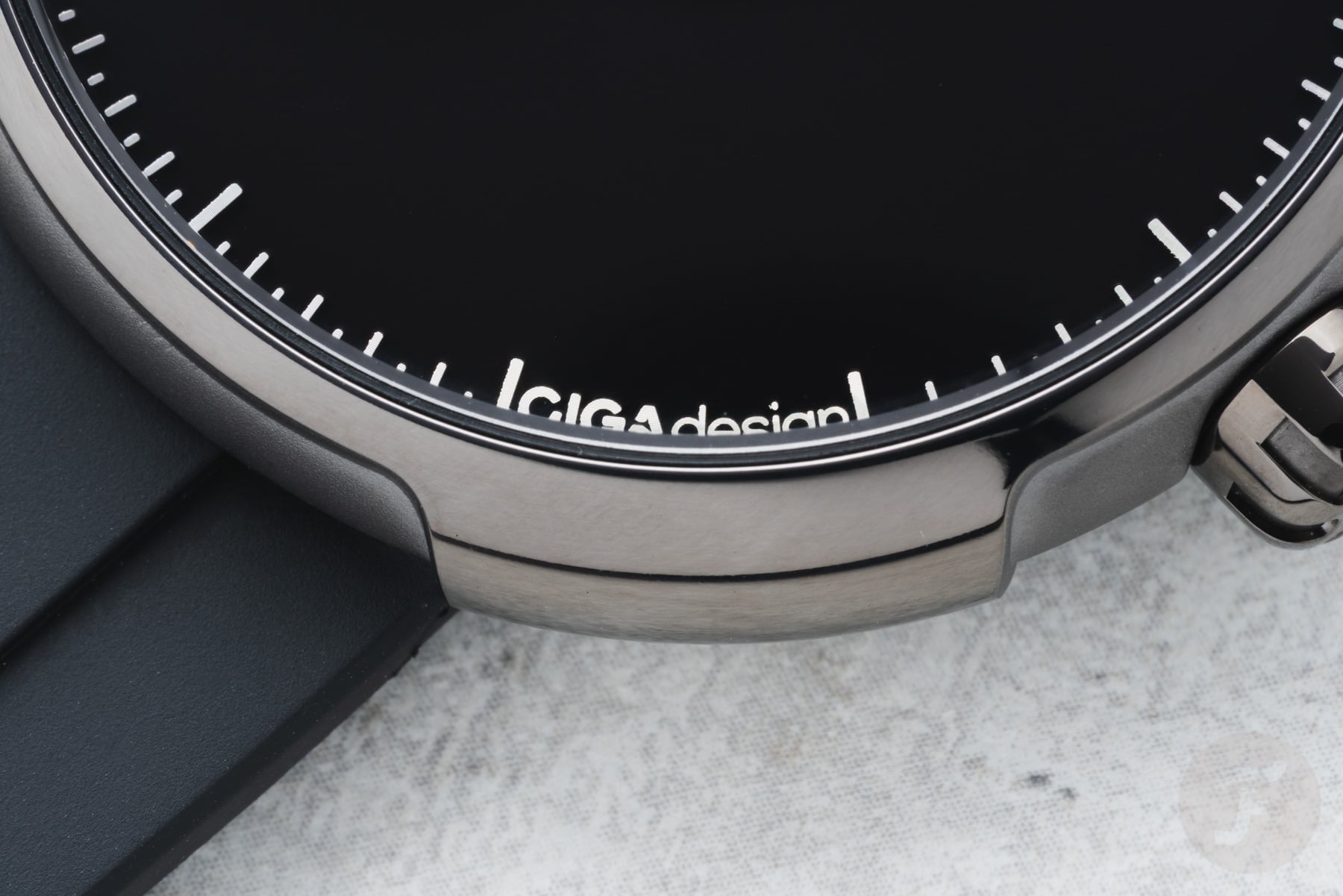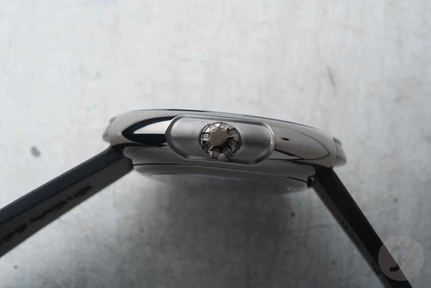 The round case is predominantly mirror-polished black, which emphasizes the sleek design. On the right side sits a 6.5mm crown, and shallow sandblasted capsule recesses at 3, 6, 9, and 12 o’clock provide extra depth and detail. It is an interesting case and the perfect canvas for the rest of the watch.