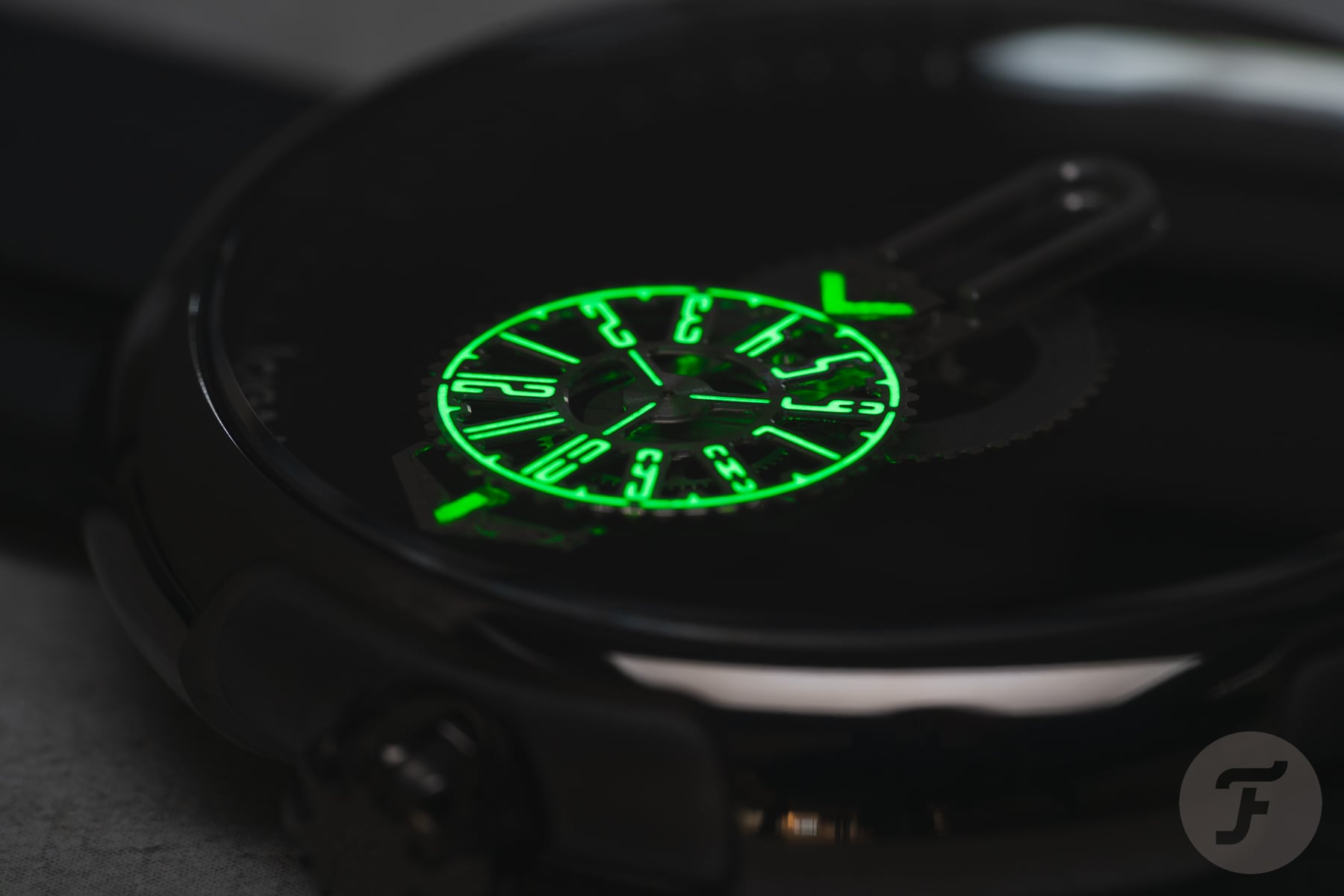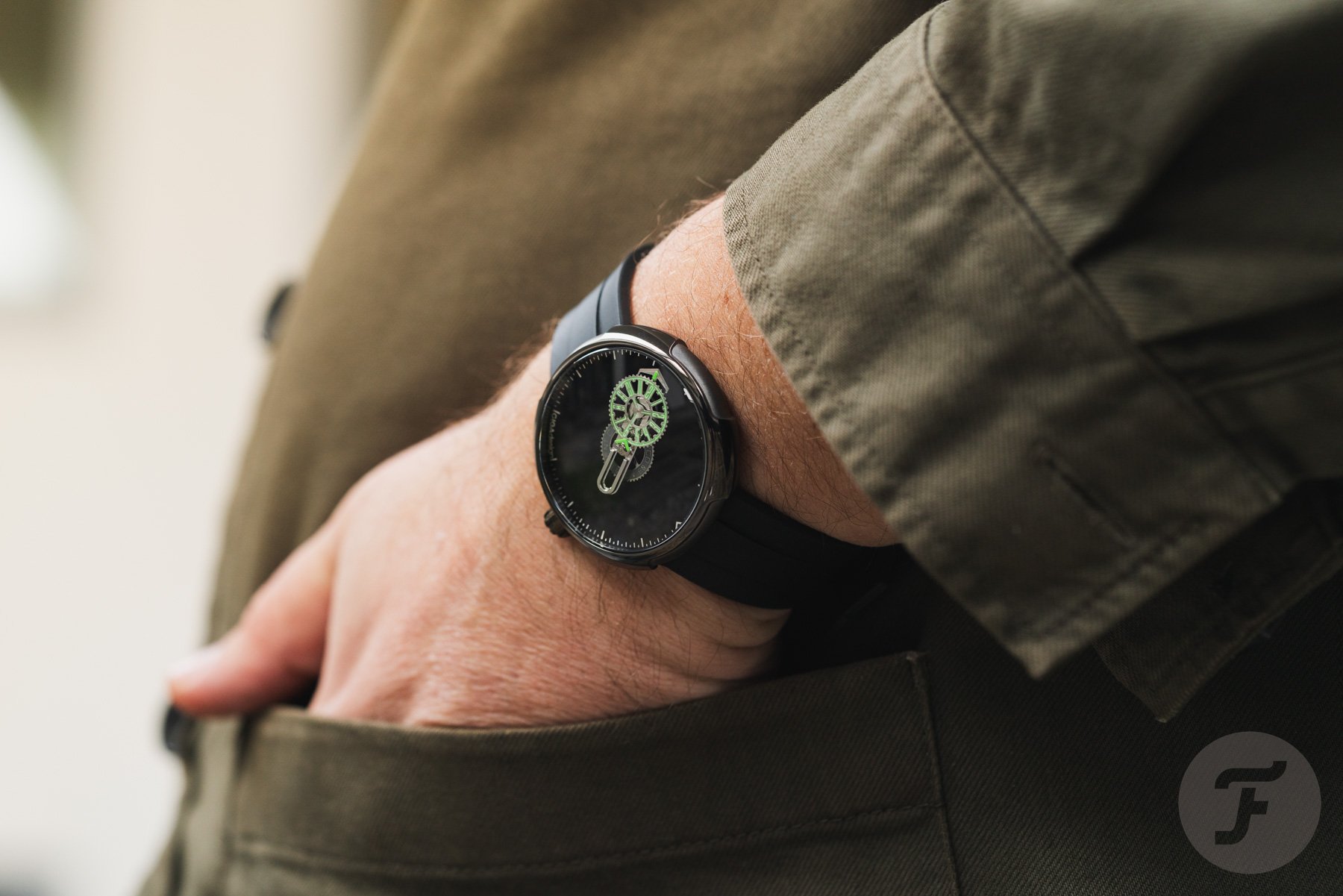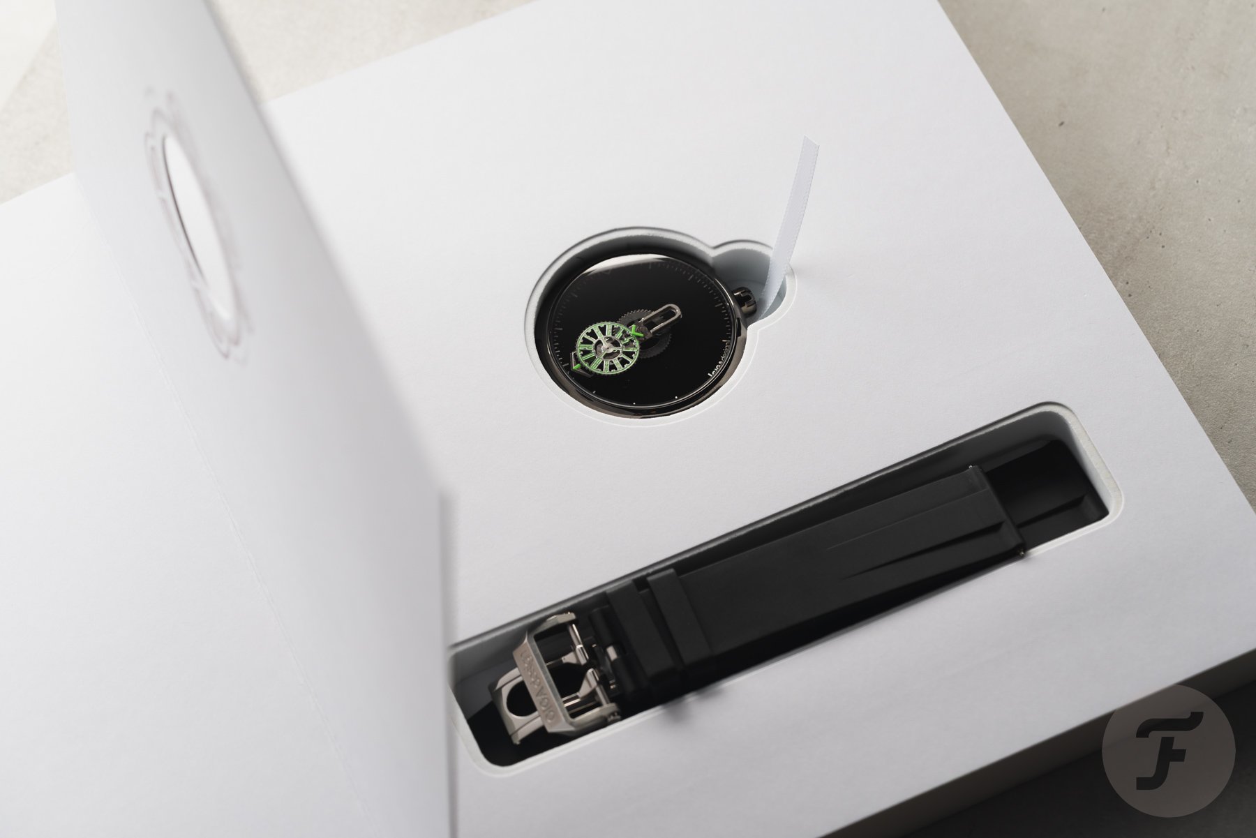 Straight out of the box, the attention to detail is apparent. The quick-release spring bars are super easy to use, so it takes just a few seconds to fit the rubber strap to the watch. What also stands out is how supple the black fluororubber strap is. It makes the Time Cipher super comfortable to wear while keeping it perfectly balanced on my wrist. On top of that, I love how the strap connects to the lugless case. It’s simply very well designed.