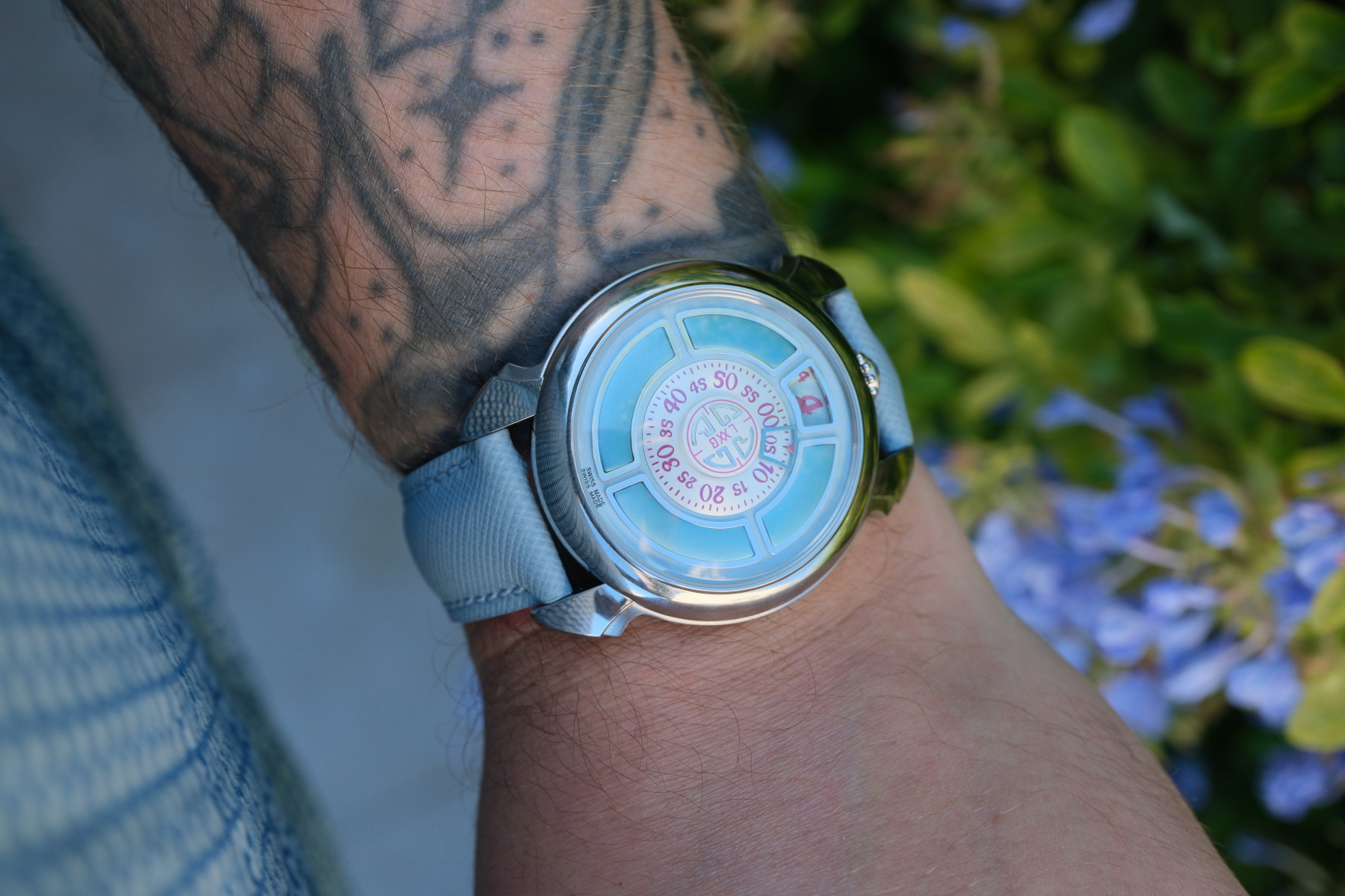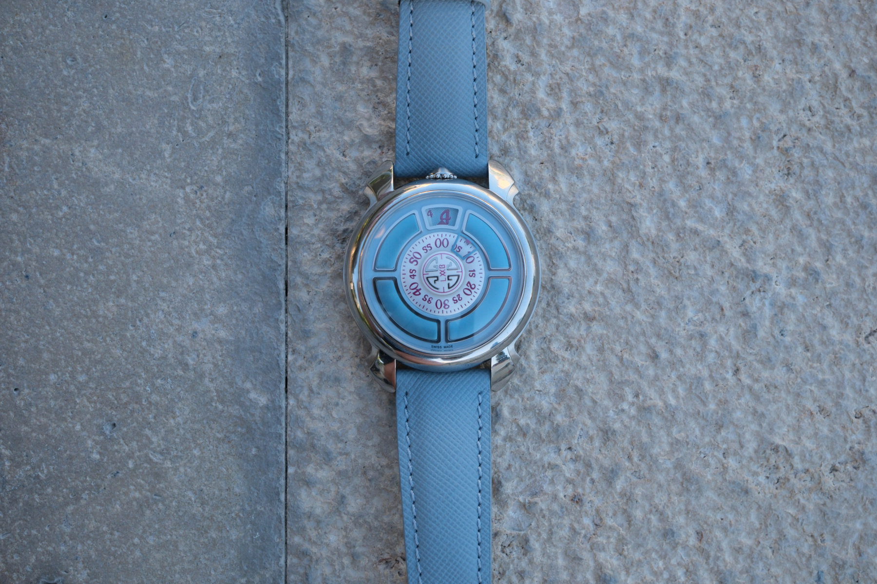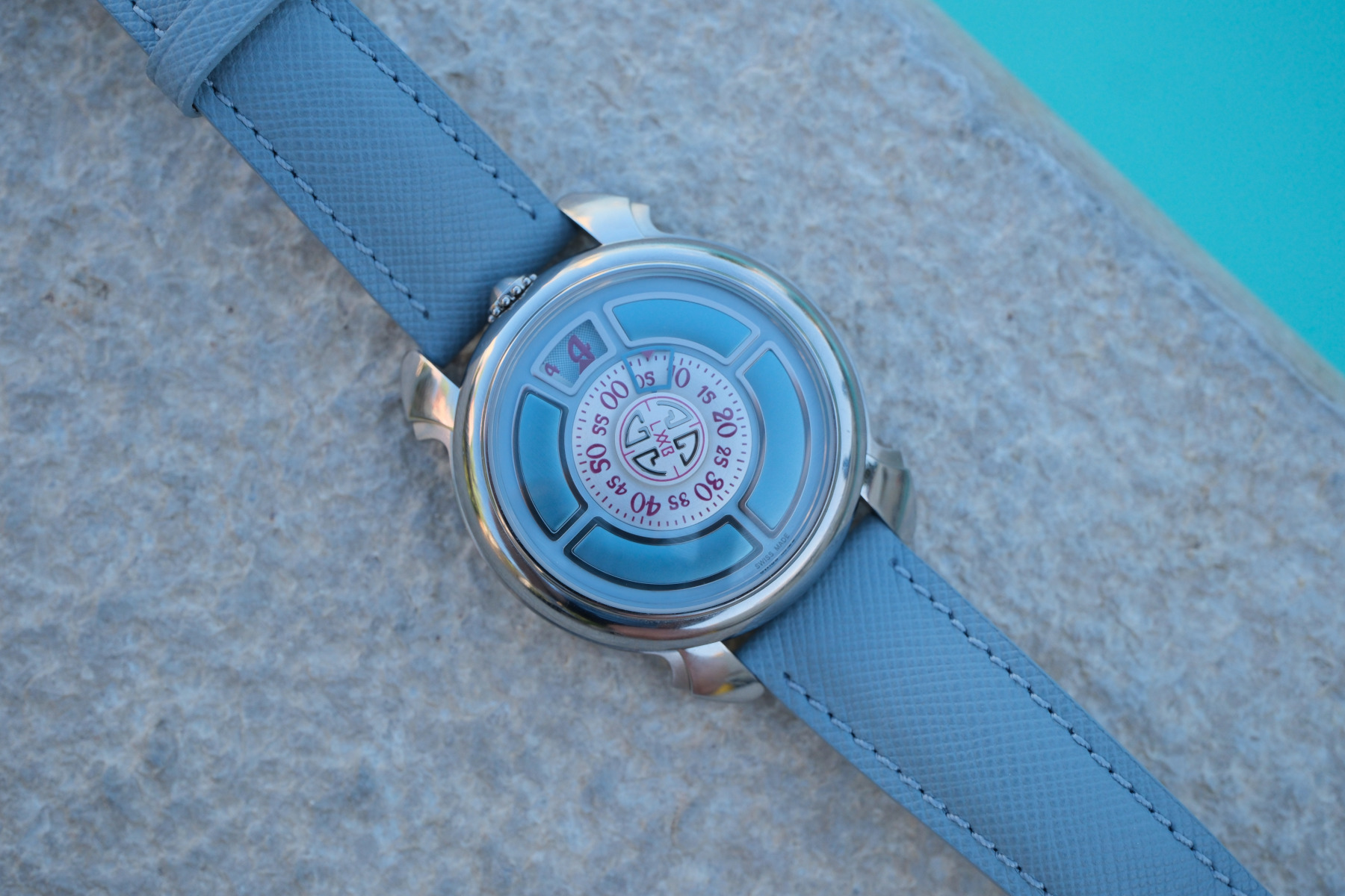 At first glance, you might assume the Labormatic Azzurro has a jump-hour display. The window at 12 o’clock indeed suggests it. But it’s actually far more straightforward. Instead of snapping from one hour to the next, the disc glides smoothly between numbers in a continuous transition. The clever part is the “in-between” numeral. Rather than showing two half-cut digits, Gagà Laboratorio inserts an intermediary number that lets you see both what time it is and where it’s heading. You can instantly tell the direction of movement, and it resolves the in-between issue somewhat elegantly. It’s a satisfying blend of analog flow and digital clarity, an approach that gives the watch real character.