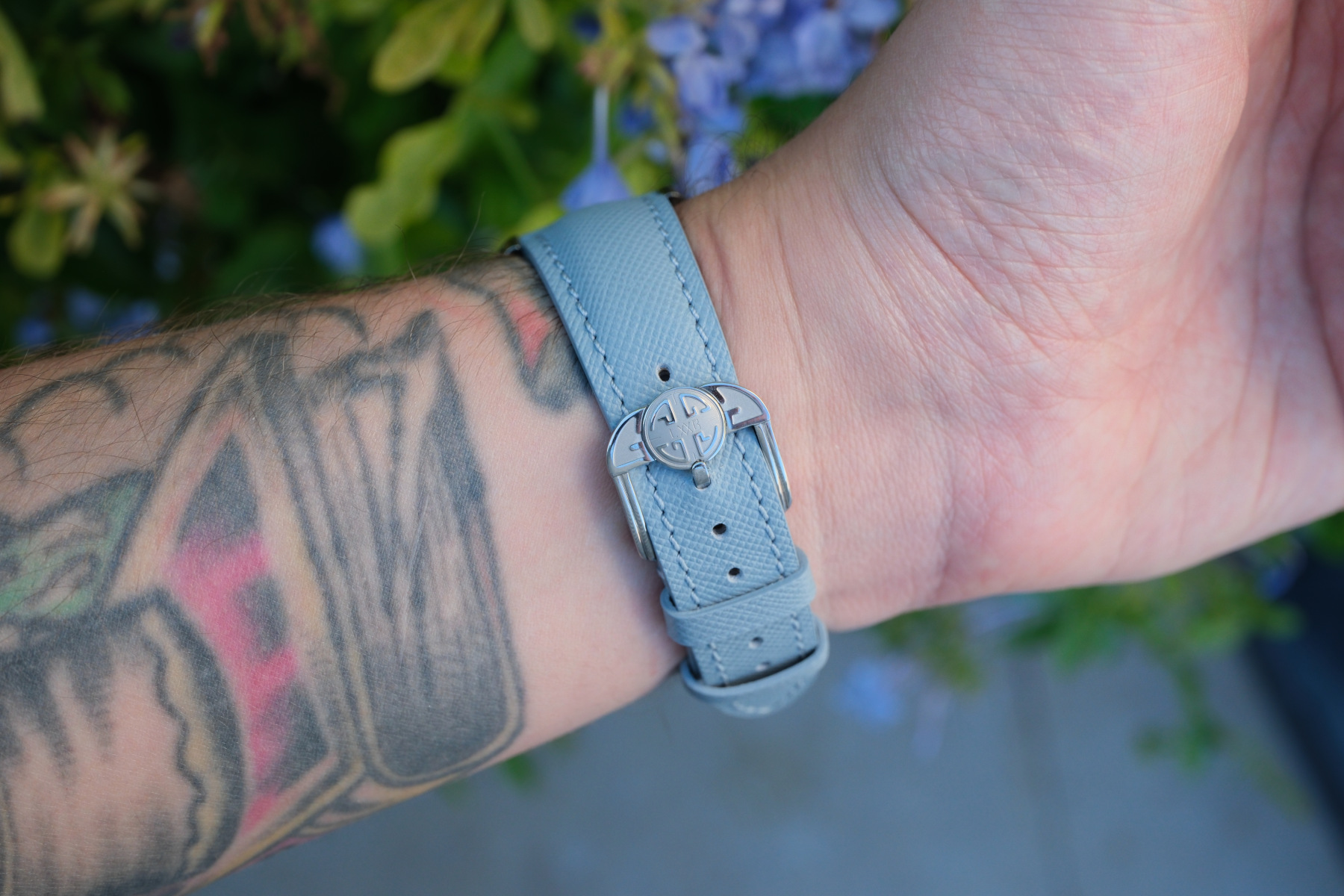 The handcrafted Saffiano leather strap (made in Italy, no less!) deserves credit for elevating the wearing experience. Its texture adds character, and it feels durable while remaining supple on the wrist. Even in warm weather, it stayed comfortable and retained its shape. The light blue shade complements the dial’s tones perfectly, reinforcing the Azzurro theme. The exact color is hard to describe. It’s not a baby blue, and it’s not an ice blue. It’s somewhere in between.