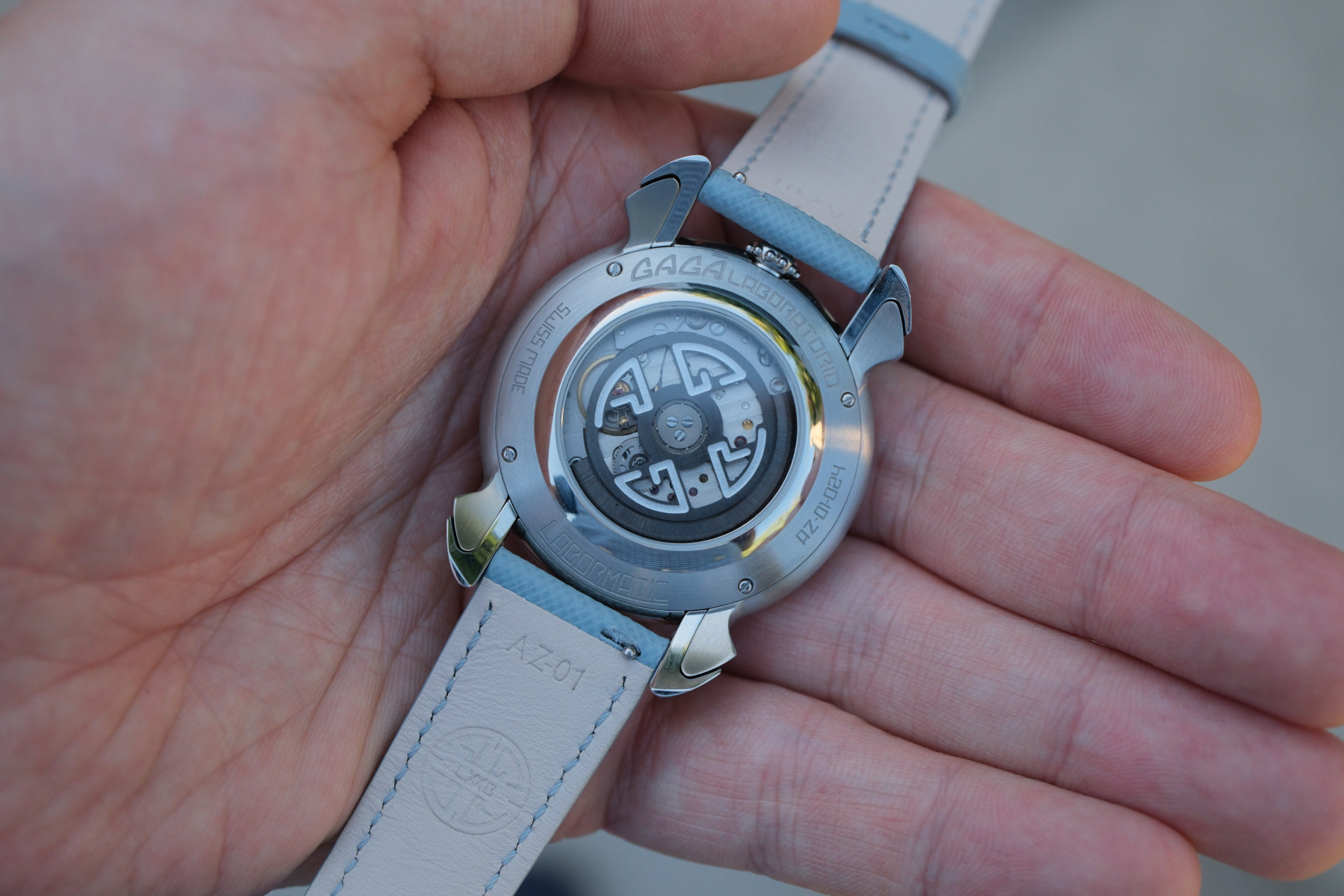 There’s no seconds hand on the Azzurro (or any of the other Labormatics), and that’s intentional. Instead, a small rotating disc with the Gagà logo caps the central pinion. It serves as a subtle running indicator, keeping the design clean. For a refined watch like this, it’s precisely the right call.