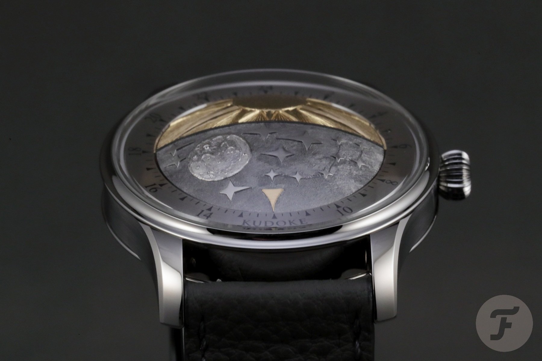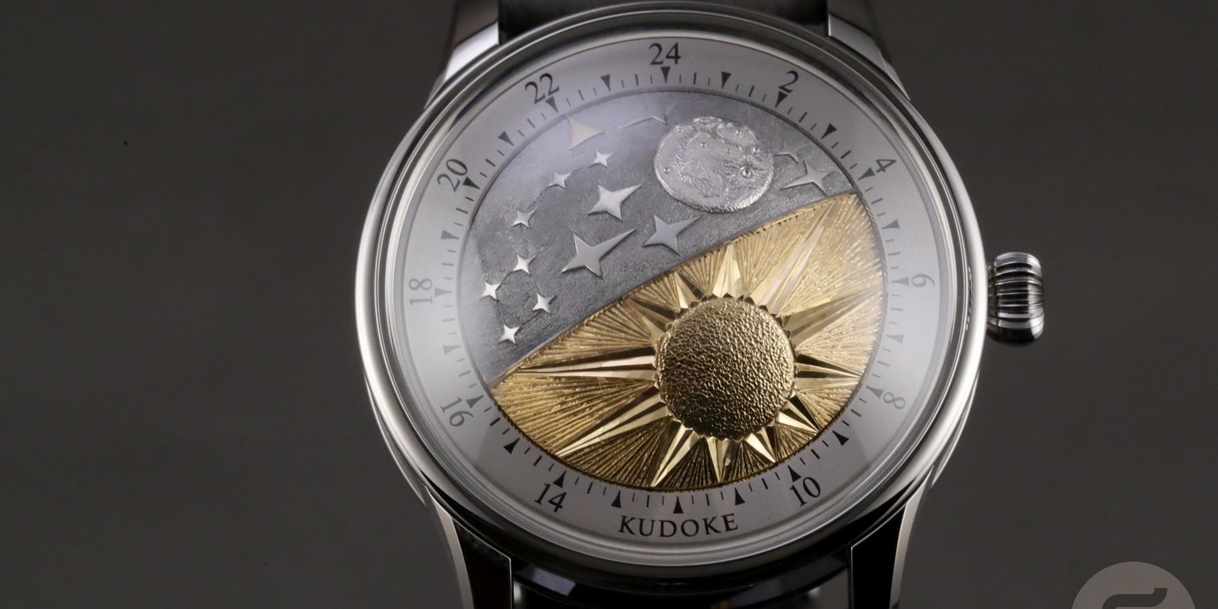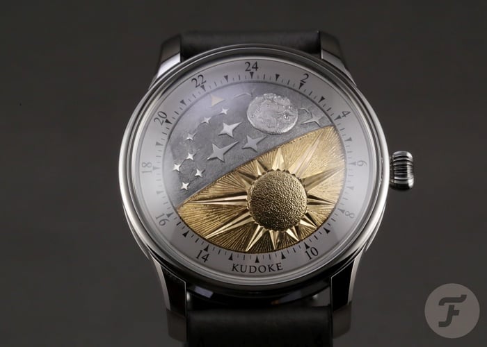 The first peculiarity of the Kudoke 5 — or K5 — you discover is the dramatically domed crystal. Below that, you notice an equally domed disk showing an artistic interpretation of the Sun and the Moon, representing day and night. On the latter half of this disk is a golden arrow that points to a 24-hour scale surrounding the disk. The disk rotates once a day and combines a day-night indication with a one-hand (arrow) time display. When the Kudoke 5 prototype was unveiled last spring, the little golden arrow indicating the time was much smaller. In the final version, it is larger to improve readability.