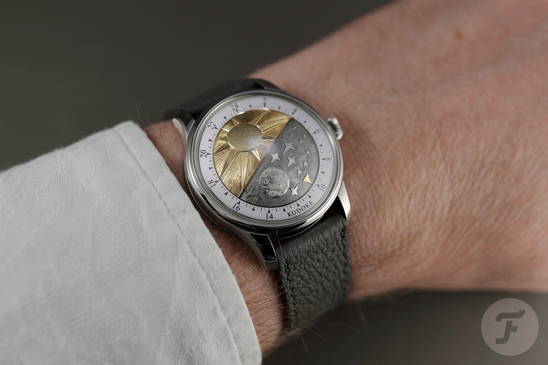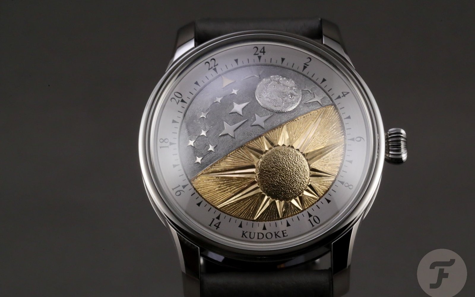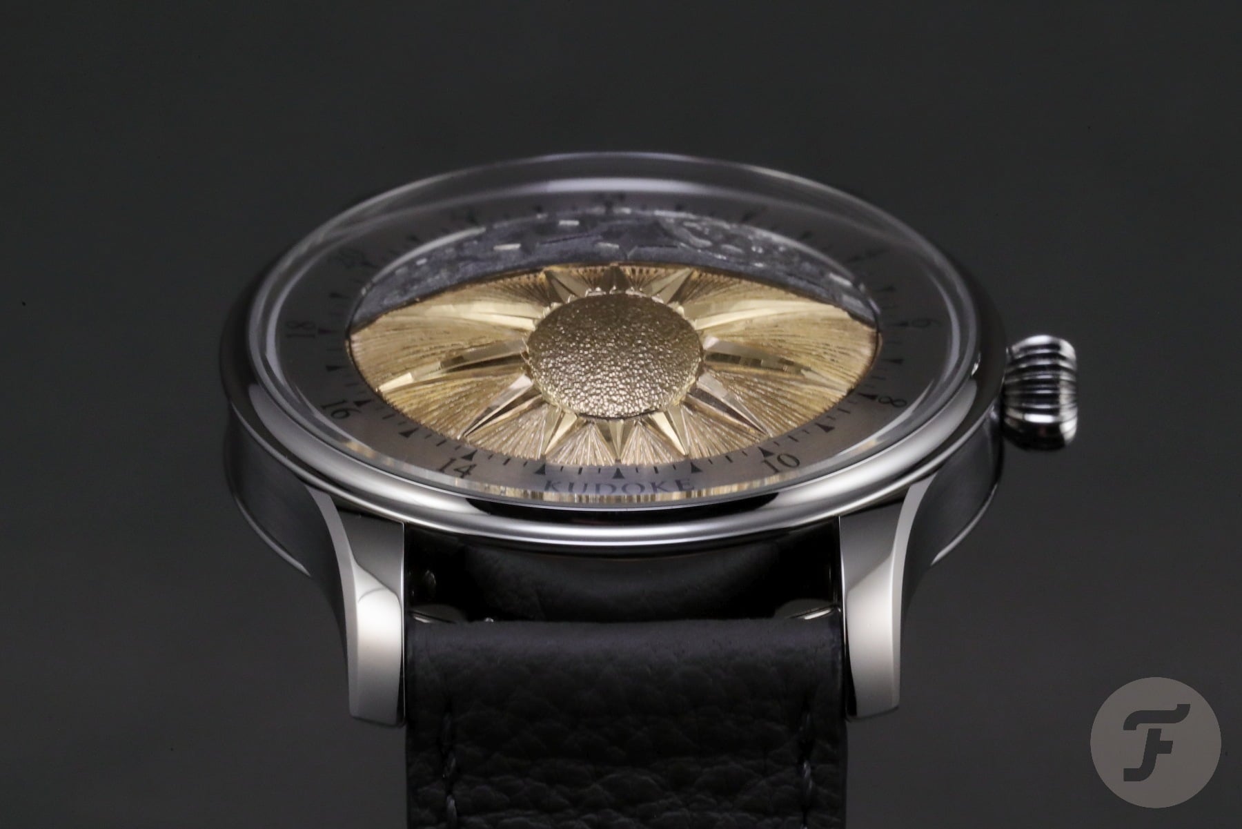 The first peculiarity of the Kudoke 5 — or K5 — you discover is the dramatically domed crystal. Below that, you notice an equally domed disk showing an artistic interpretation of the Sun and the Moon, representing day and night. On the latter half of this disk is a golden arrow that points to a 24-hour scale surrounding the disk. The disk rotates once a day and combines a day-night indication with a one-hand (arrow) time display. When the Kudoke 5 prototype was unveiled last spring, the little golden arrow indicating the time was much smaller. In the final version, it is larger to improve readability.
