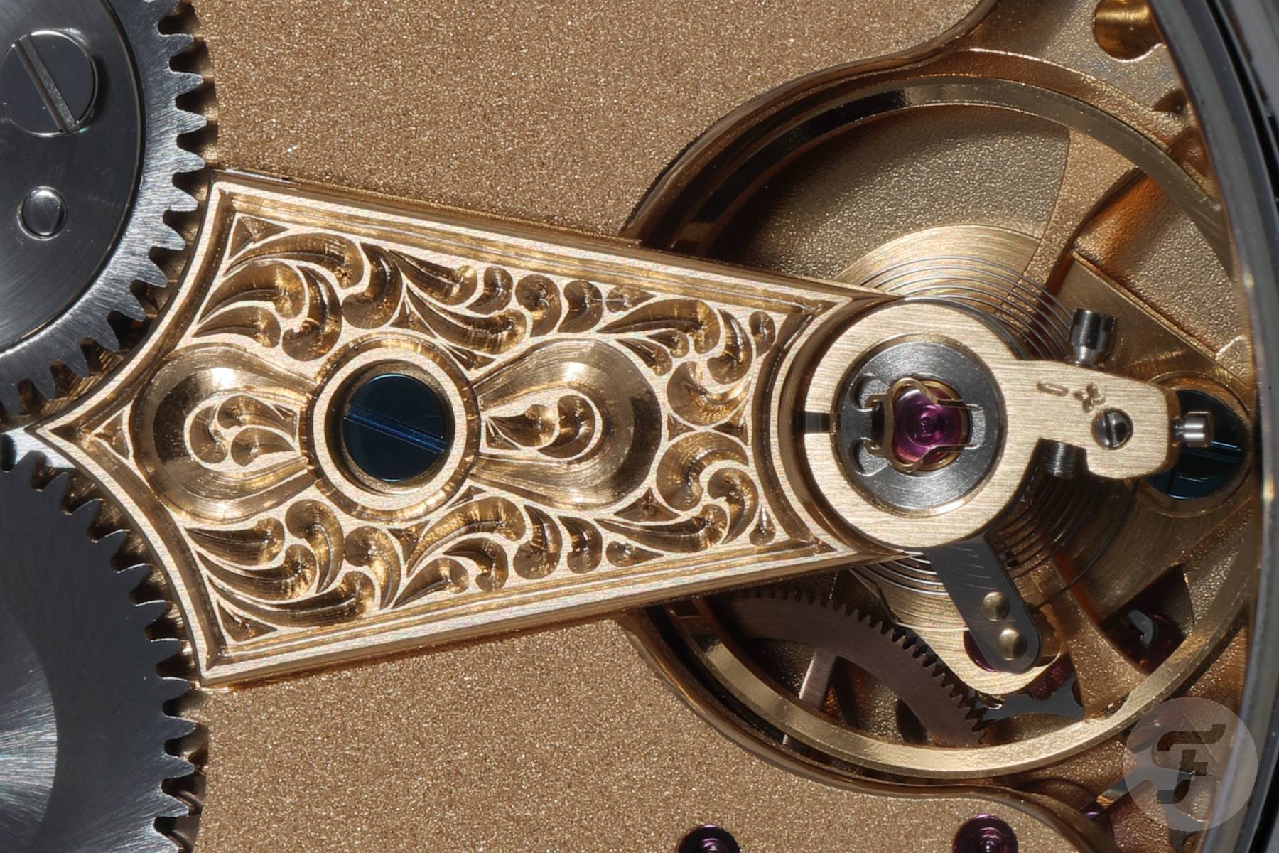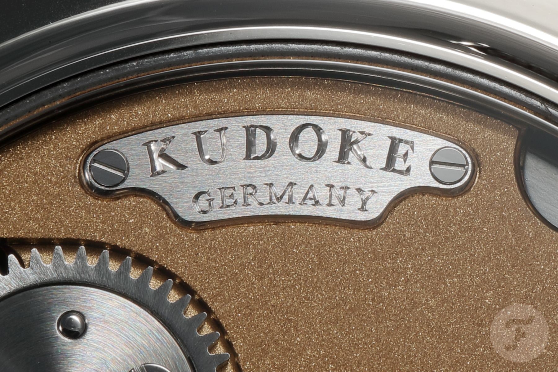 The attention to detail is also evident in the small Kudoke name plaque. The edge surrounding the brushed and hand-engraved plaque has a round chamfer. It is attached to the gear bridge with two screws featuring chamfered, black-polished screw heads.