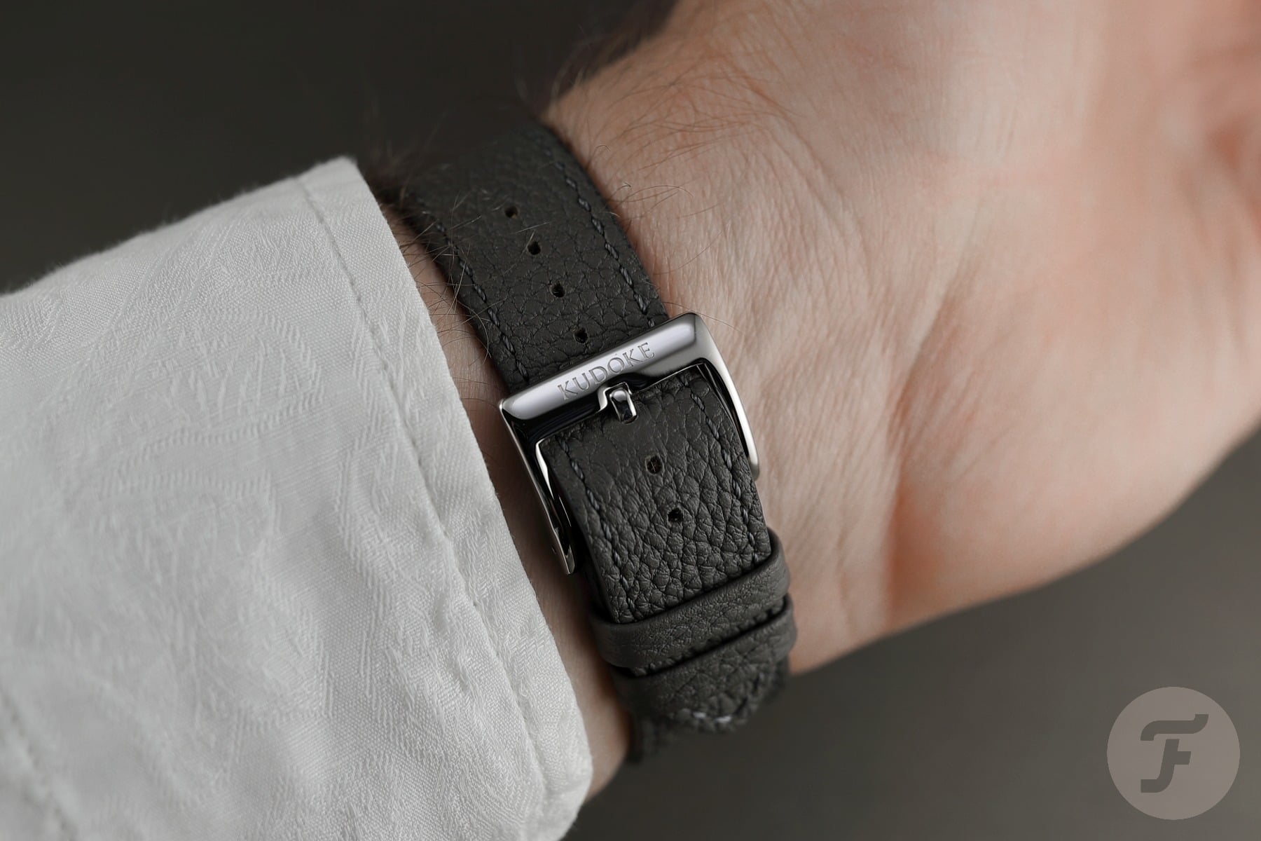 The soft calfskin strap makes wearing the Kudoke 5 even more comfortable. It puts a smile on my face to read “Handgemacht in Deutschland” (handmade in Germany) on the inside of the strap. Also, the shape of the branded, polished pin buckle is more complex than it appears at first.