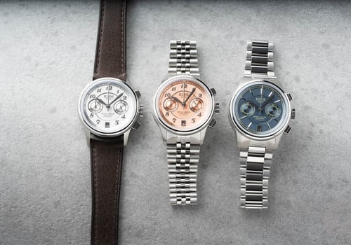 First, let’s go over the two-register chronograph dials. The Kyoto-based brand offers three dial colors. The first is salmon pink, the second is navy, and the third is silver. In terms of style, all colors are available with either polished Breguet-style numerals or bar indexes. The first dial style has a far more classic presence, while the second looks a bit more contemporary. We received examples of both for review so we could see the differences.