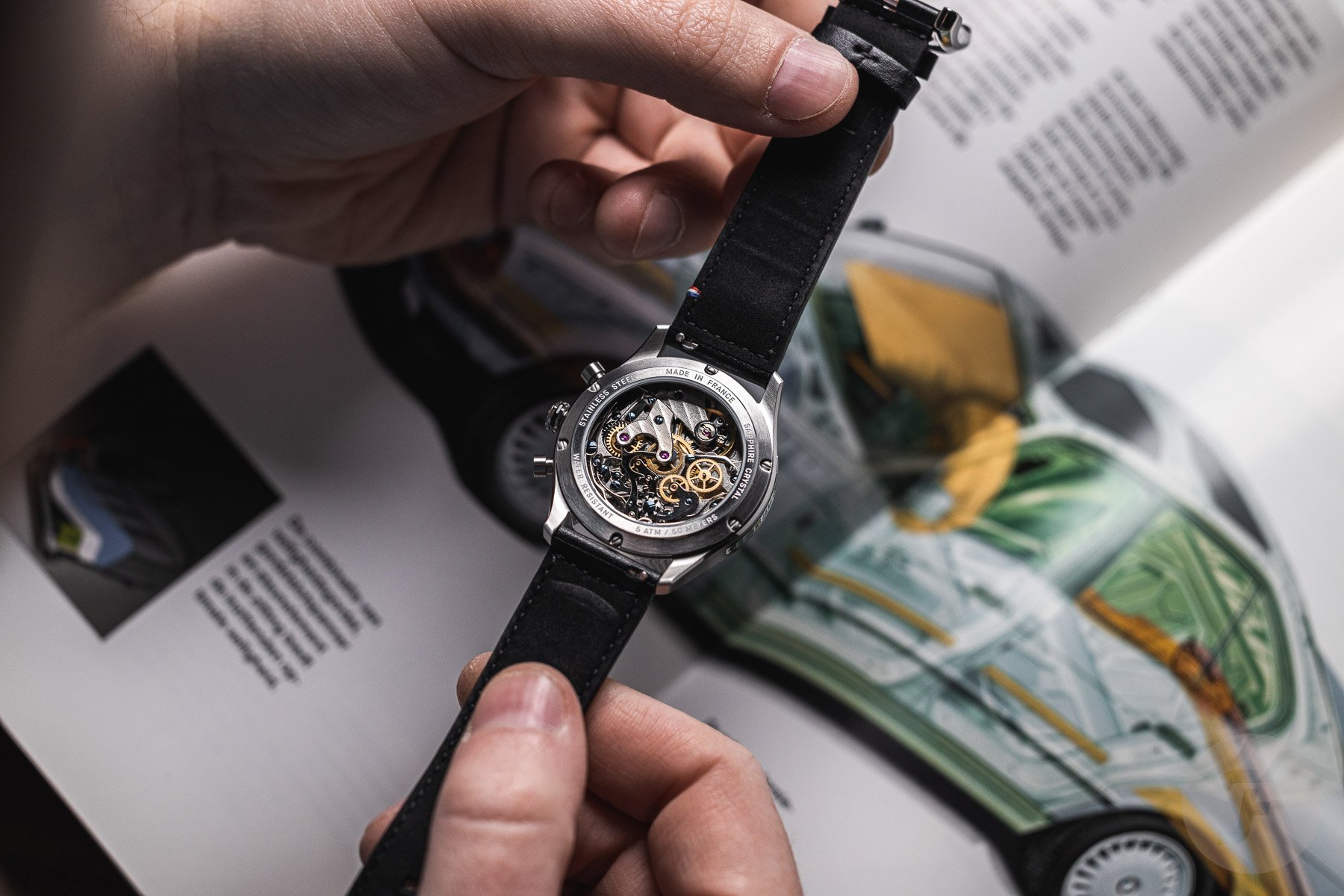 Although I think the pushers are nicely proportioned, the octagonal crown does feel a tad small. But it could also be the lack of grip that it offers, which bothers me a bit. This is especially because there’s a hand-wound movement inside, which means you’ll have to interact with it daily. Initially, I thought that the black ring on the crown was made of rubber, but it’s not, and it doesn’t offer any additional grip. That’s a very minor point of criticism, though, because the case, pushers, and crown feel very sturdy overall. And with a water resistance rating of 50 meters, you can even wear it close to the water.