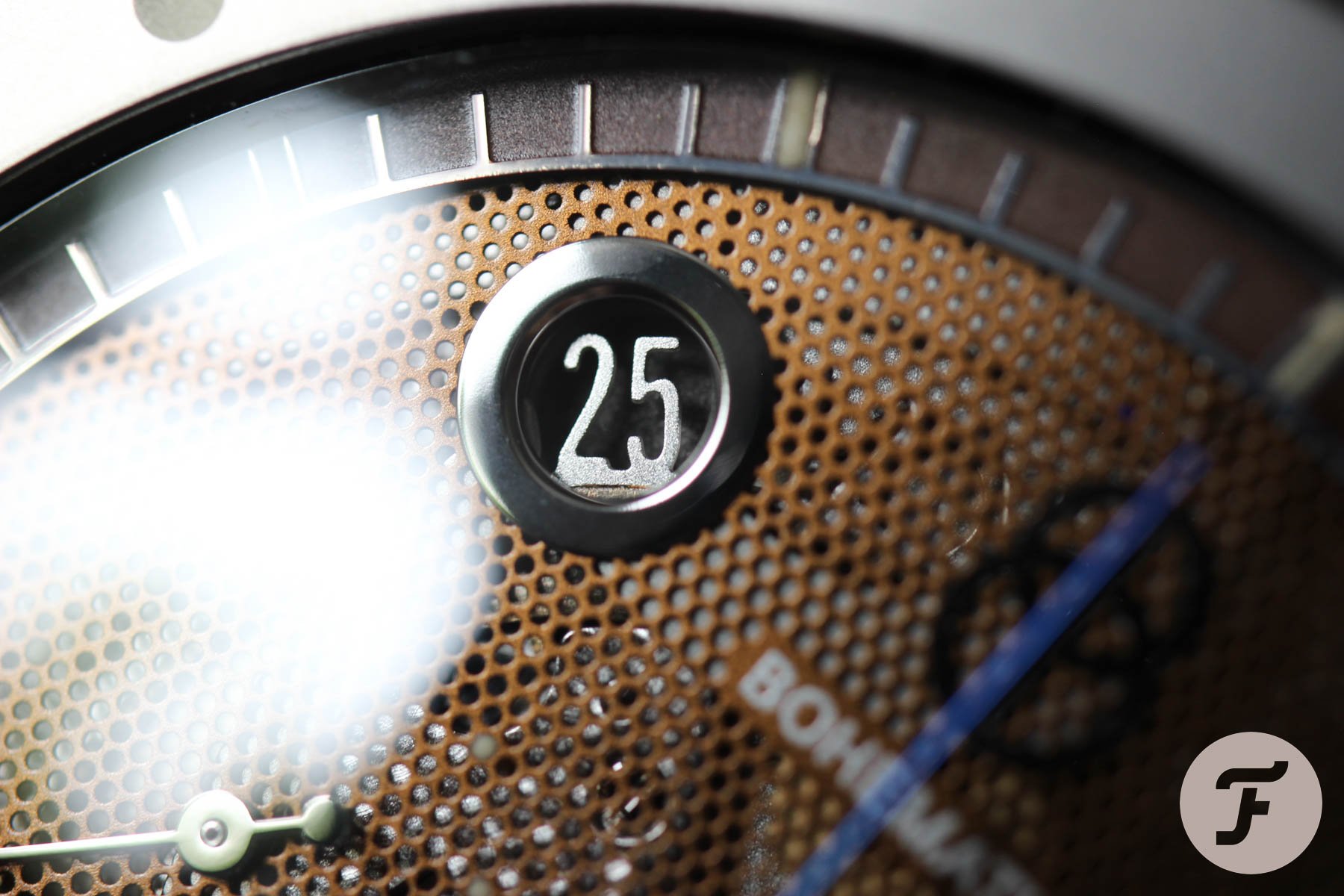 The mesh dial is one step lower than the framing minute track. No over-creativity there, just a bit of spice with good old luminous hour indexes. Forget printed dials, as Bohematic used galvanic plating for minute ring finishing. The frame rings around the chronograph recorders and date window are highly polished and look sharp around the edges. I’ll tell you, the Bohematic guys paid some real attention to the date. Look at the macro shots and you will notice the real depth and plasticity of the displayed numbers. How come? I didn’t notice it at first. The date ring is not printed, each single number is laser cut and “welded” onto the hardly visible base ring. A very thoughtful and nicely executed detail.