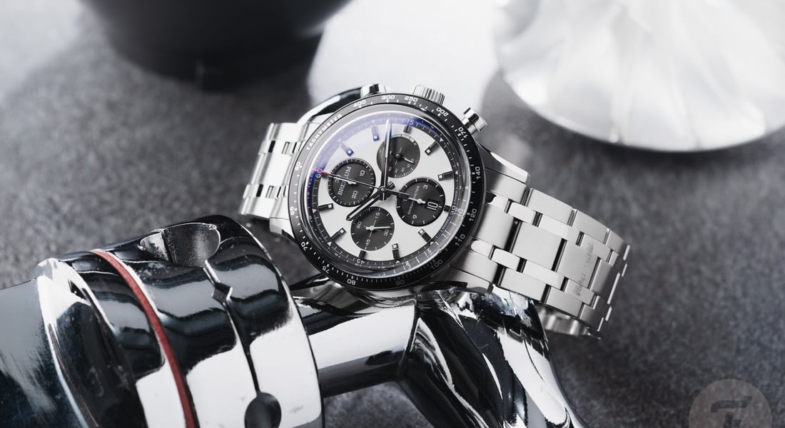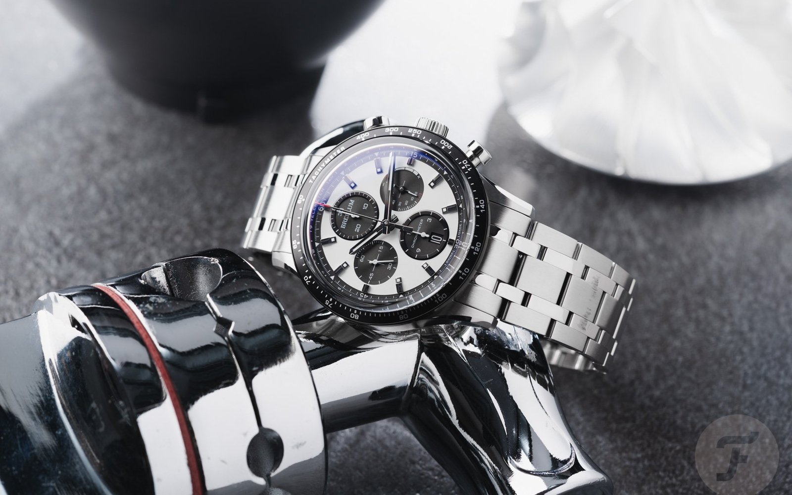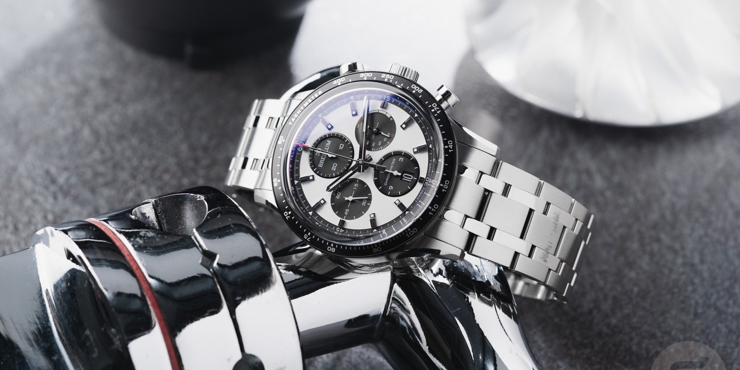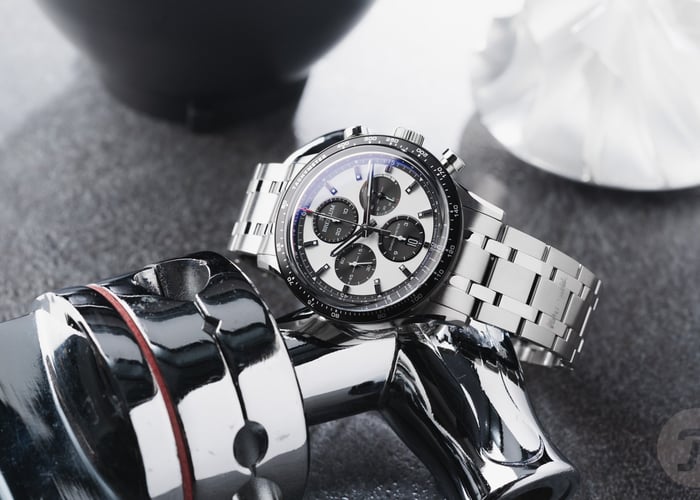 As its name suggests, the Pandial Power Reserve has a white dial with black sub-registers. A matching external black tachymeter bezel insert creates a sharp look. Details like arrow-tipped baton hands, red-tipped central chronograph hand, and applied indices give off Daytona vibes. But wait, like an old Universal Geneve Tri-Compax, a fourth sub-dial peers back at onlookers.