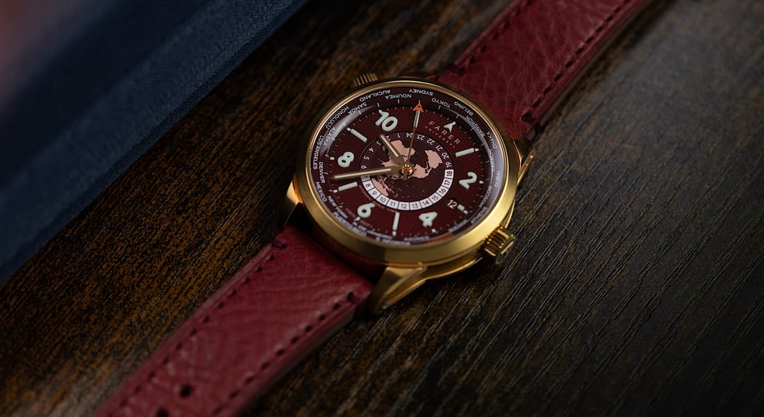The blend of gold and deep burgundy in the new Farer World Timer Thorne Gold hints at a luxurious lifestyle. Consequently, it feels perfectly at home in a world-time watch. In 2026, digital tools do a better job of keeping us globally connected and synchronized. However, there’s a special feeling that comes from using a mechanical watch. The crown-operated calibration allows you to appreciate the passage of time around the world.