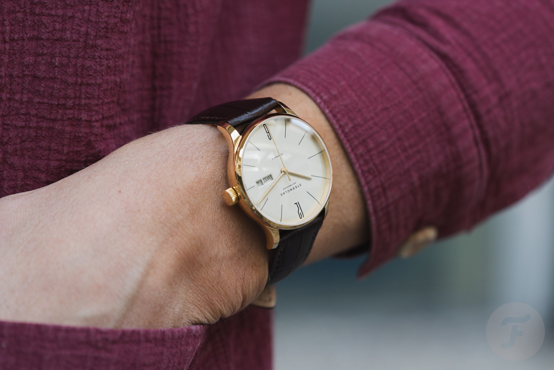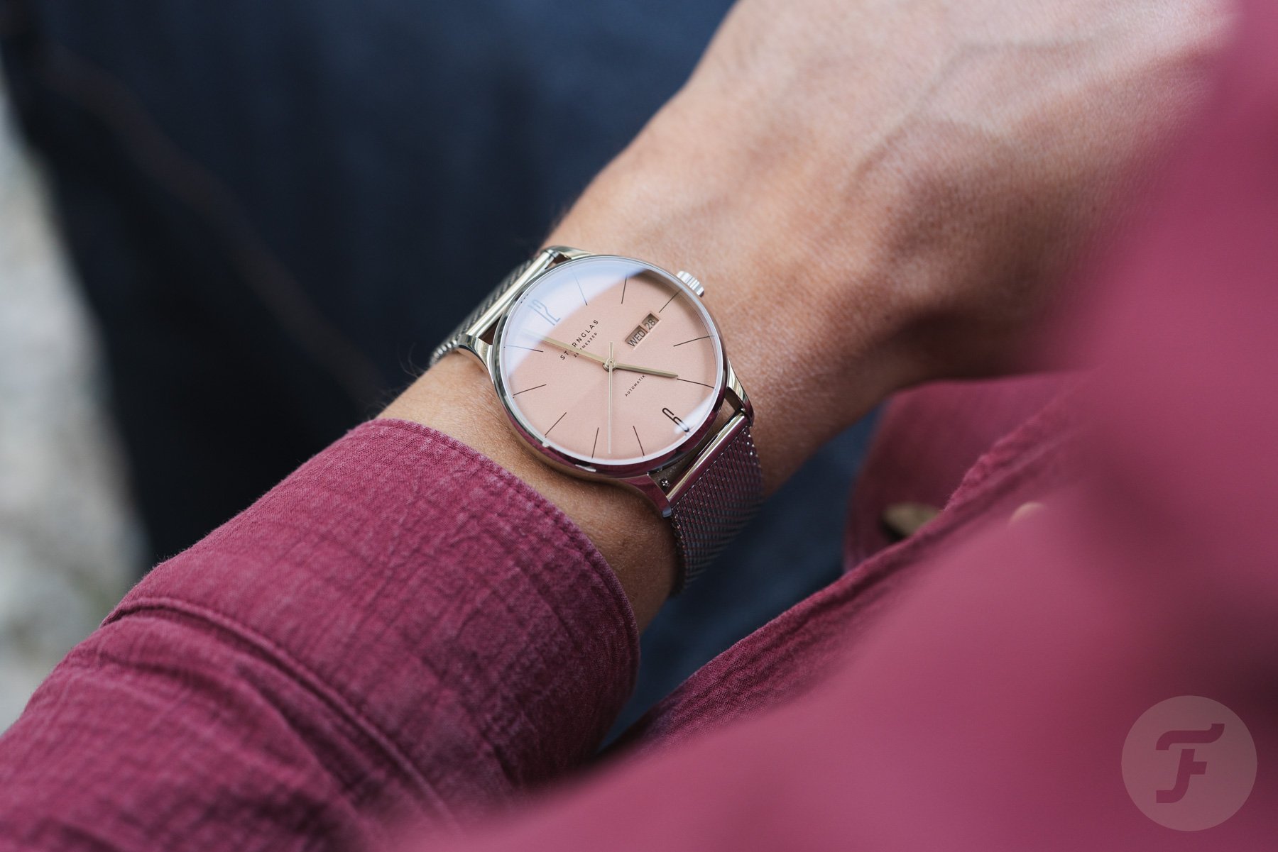 Don’t worry; other than the new colors, the Berlin’s overall Bauhaus-style dress-watch design is still there. There are contrasting elongated “12” and “6” numerals and printed stick markers at all the other hours. The straight hands are beveled and match the case color. At the 3 o’clock position are two cutouts. One is for the day, and the other is for the date. And besides the “Sternglass Zeitmesser” signature on the dial’s upper half and the “Automatik” text on the bottom, there’s not much else to talk about except the color options.