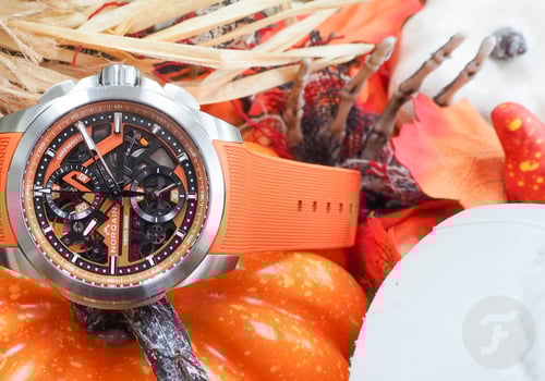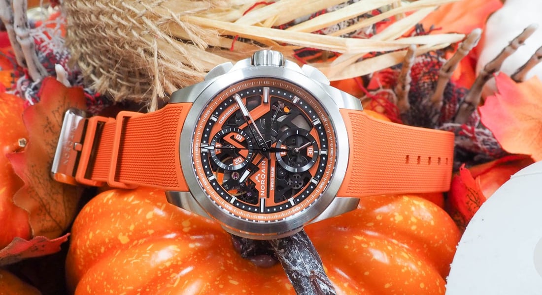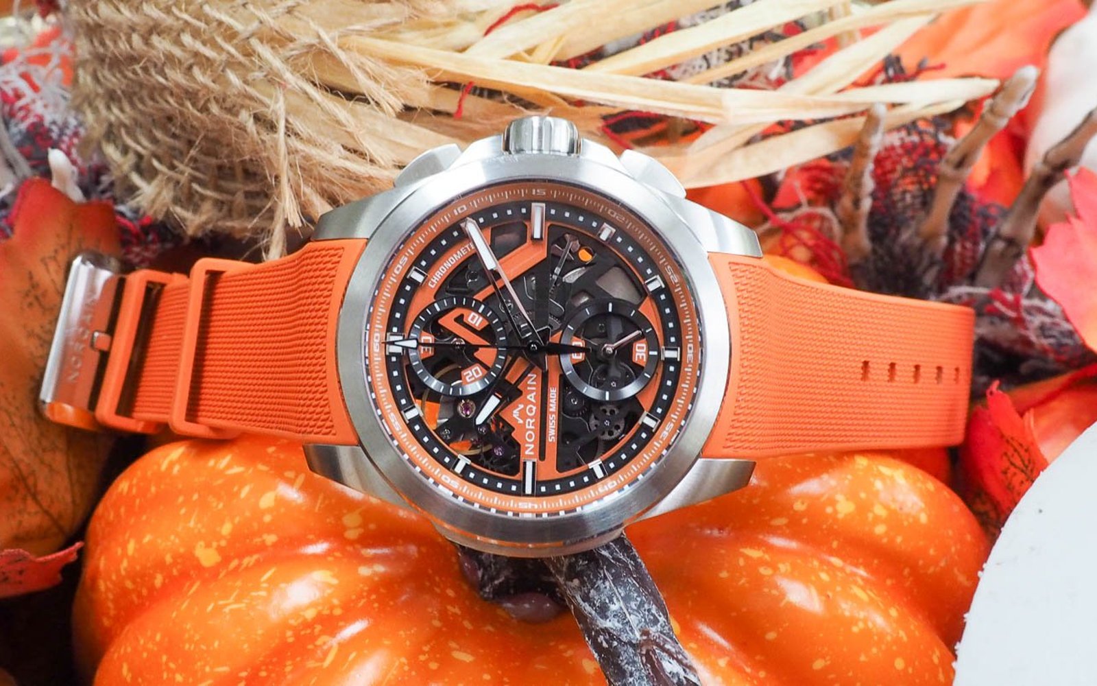 Over the past few months, I’ve had the opportunity to go hands-on with several new Norqain watches. It’s been a positive experience and somewhat surprising. Generally, I’m not a fan of open-worked dials, but on the wrist, the brand’s pieces shine. Comfortable straps and wrist-conforming case designs help too. Today, I’m taking my first spin with a more complicated piece in a new color that’s perfect for the season. The Independence Skeleton Chrono 42mm Orange is here with a bit of Halloween flair.