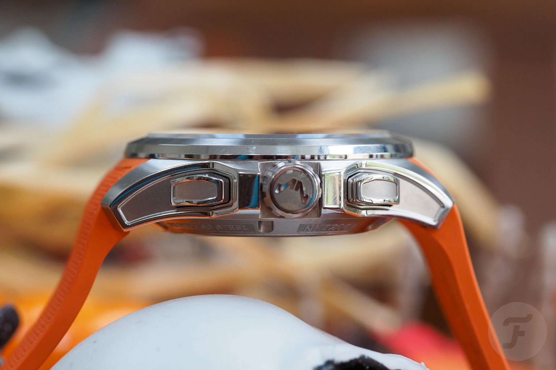 Over a year ago, I covered the then-new purple versions of the Independence Skeleton Chrono 42mm. However, this was at arm’s length since I wasn’t able to wear them. The latest model trades grapes for oranges, but otherwise, it’s quite similar. This translates to a 42mm by 49.8mm 316L stainless steel case with a 13.9mm profile. While a bracelet option is available, Norqain sent the watch on a textured orange rubber strap with a stainless steel pin buckle. Both choices are suitable for utilizing the watch’s 100m water resistance rating. The case, with its chiseled-out flanks, features the company’s calling card on the side opposite the crown. It’s a removable nameplate that can be customized with any engraved design.
