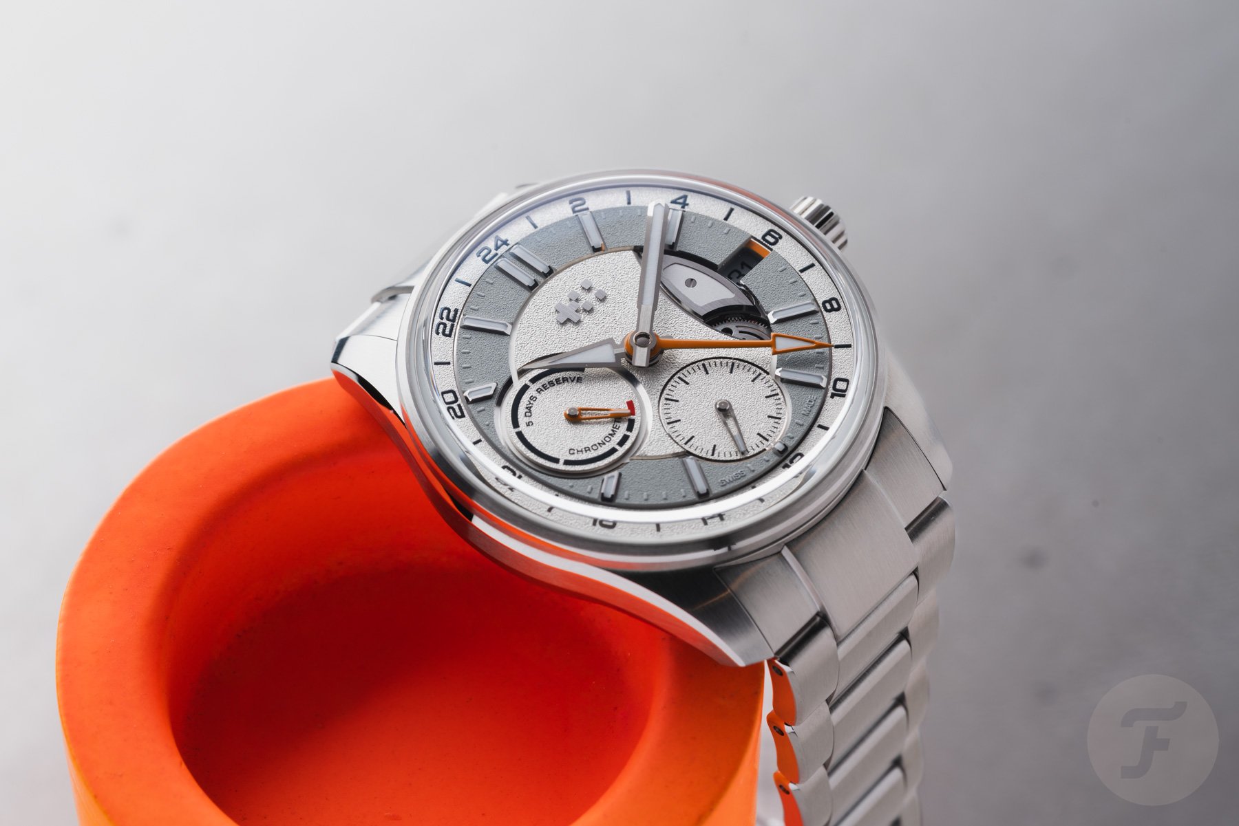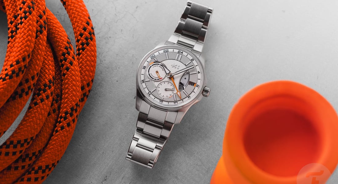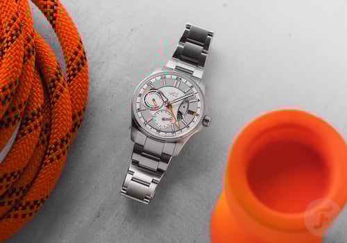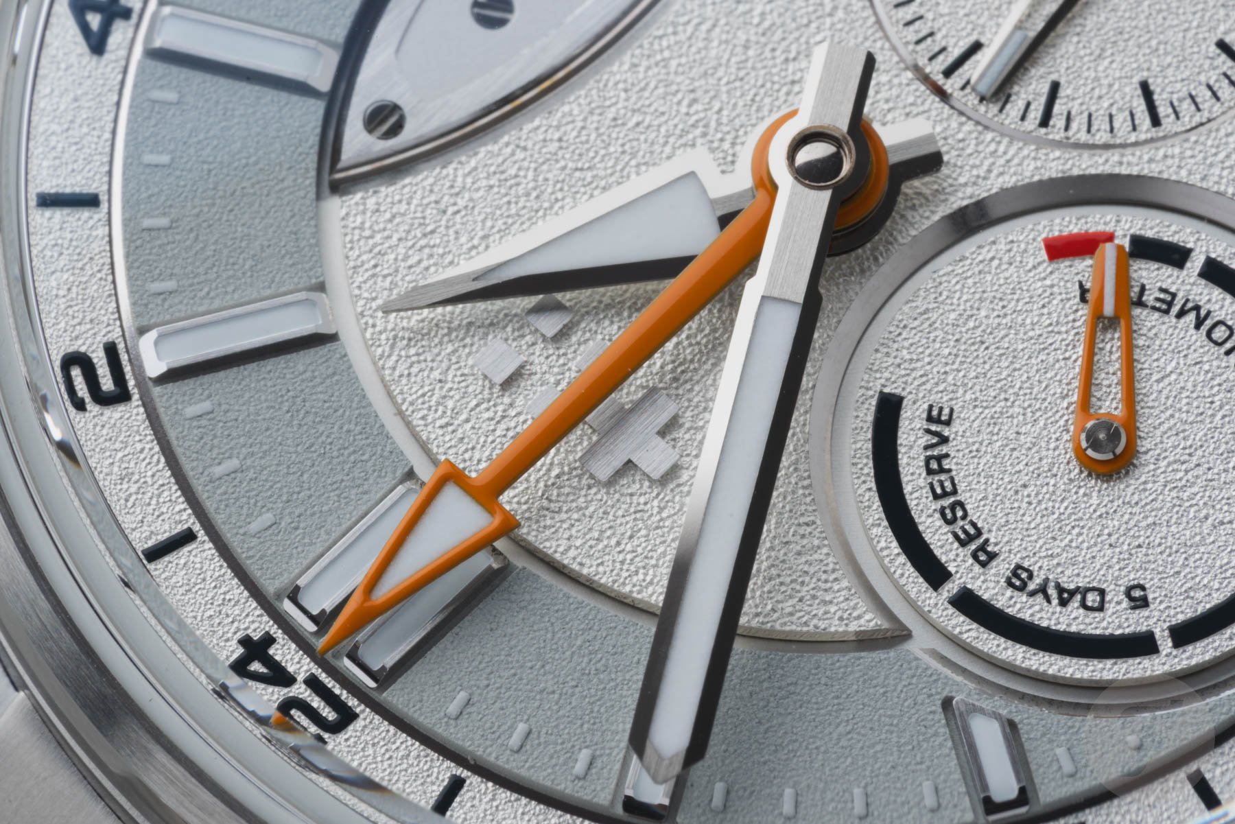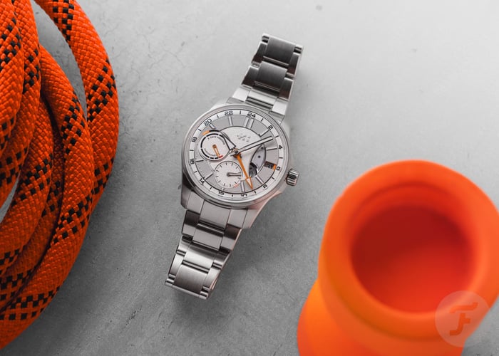 The two sub-dials are asymmetrical and feature different hands. While the power reserve indicator features a skeletonized orange hand with a lumed tip, the small seconds hand is rhodinized and matches the lume-filled central hour and minute hands. Lastly, the arrow-shaped orange GMT hand indicates the time in another time zone on the outer GMT ring. A nice detail is the hint of orange next to the date window. The date wheel matches the light gray ring on the dial, and the date is printed in black. Protecting the dial is a box-shaped sapphire crystal that increases the overall thickness but adds to the visual drama.