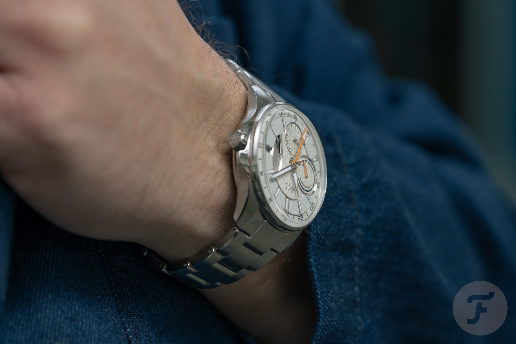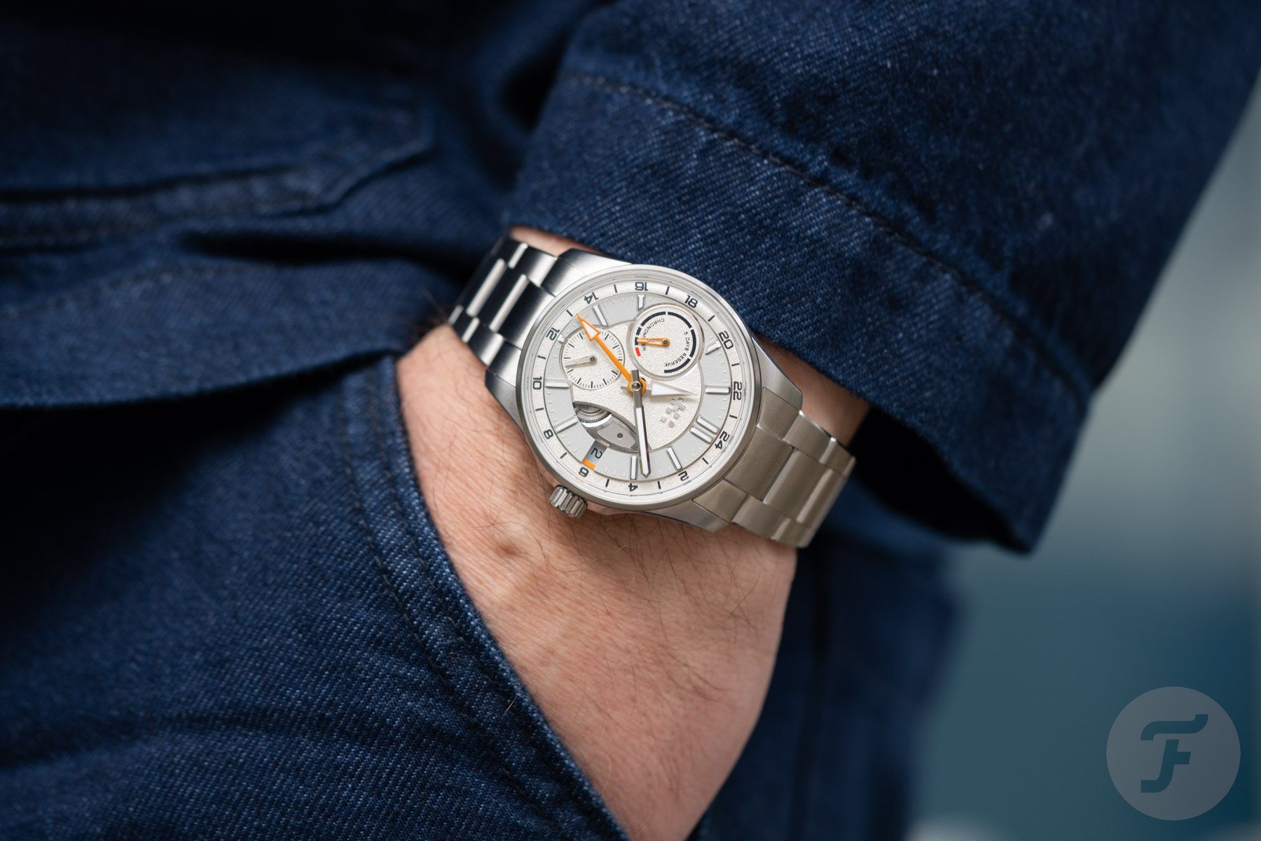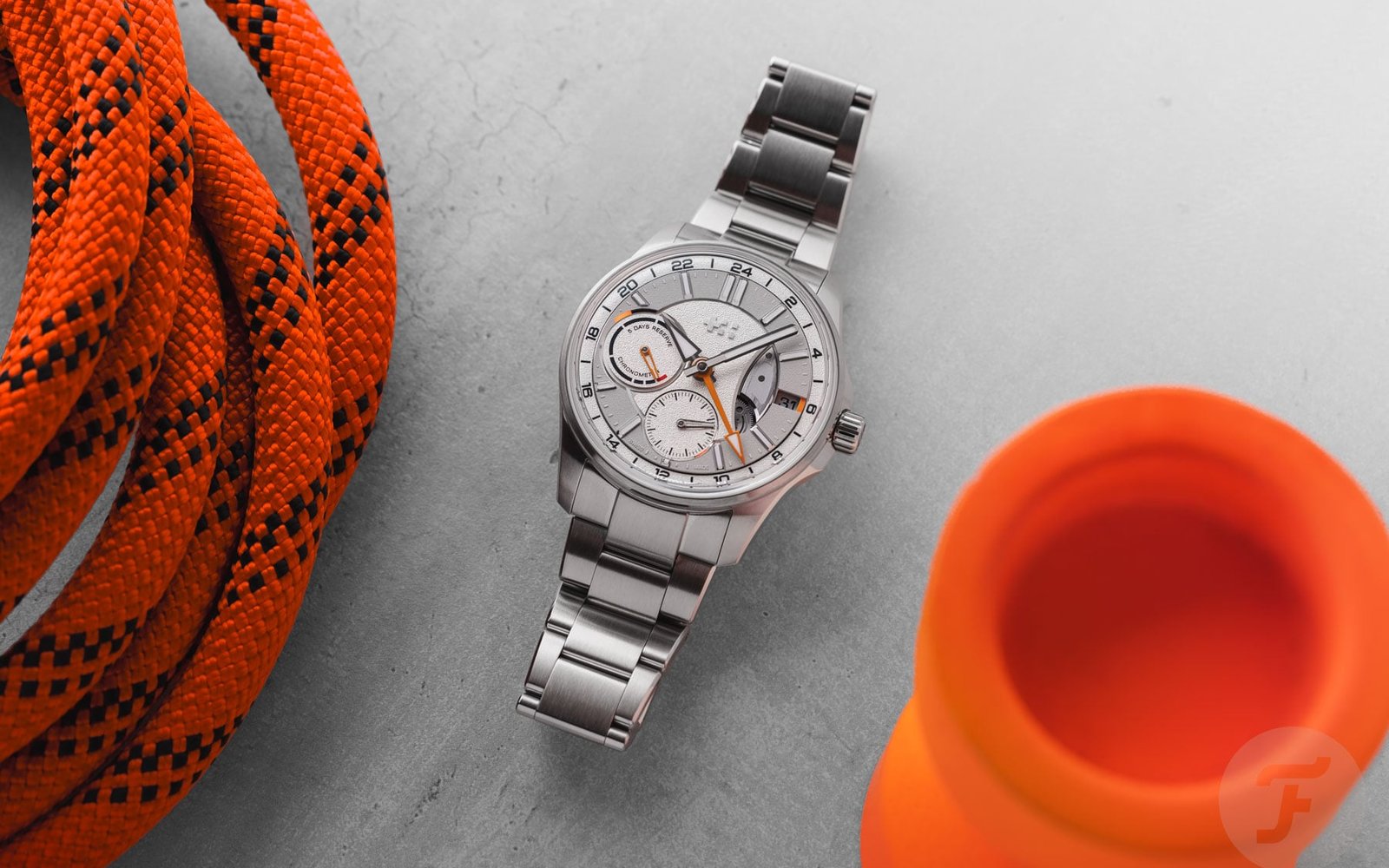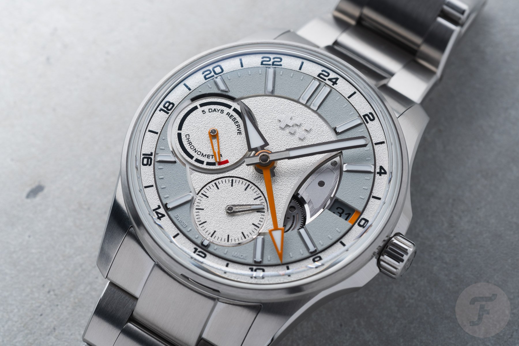The two sub-dials are asymmetrical and feature different hands. While the power reserve indicator features a skeletonized orange hand with a lumed tip, the small seconds hand is rhodinized and matches the lume-filled central hour and minute hands. Lastly, the arrow-shaped orange GMT hand indicates the time in another time zone on the outer GMT ring. A nice detail is the hint of orange next to the date window. The date wheel matches the light gray ring on the dial, and the date is printed in black. Protecting the dial is a box-shaped sapphire crystal that increases the overall thickness but adds to the visual drama.