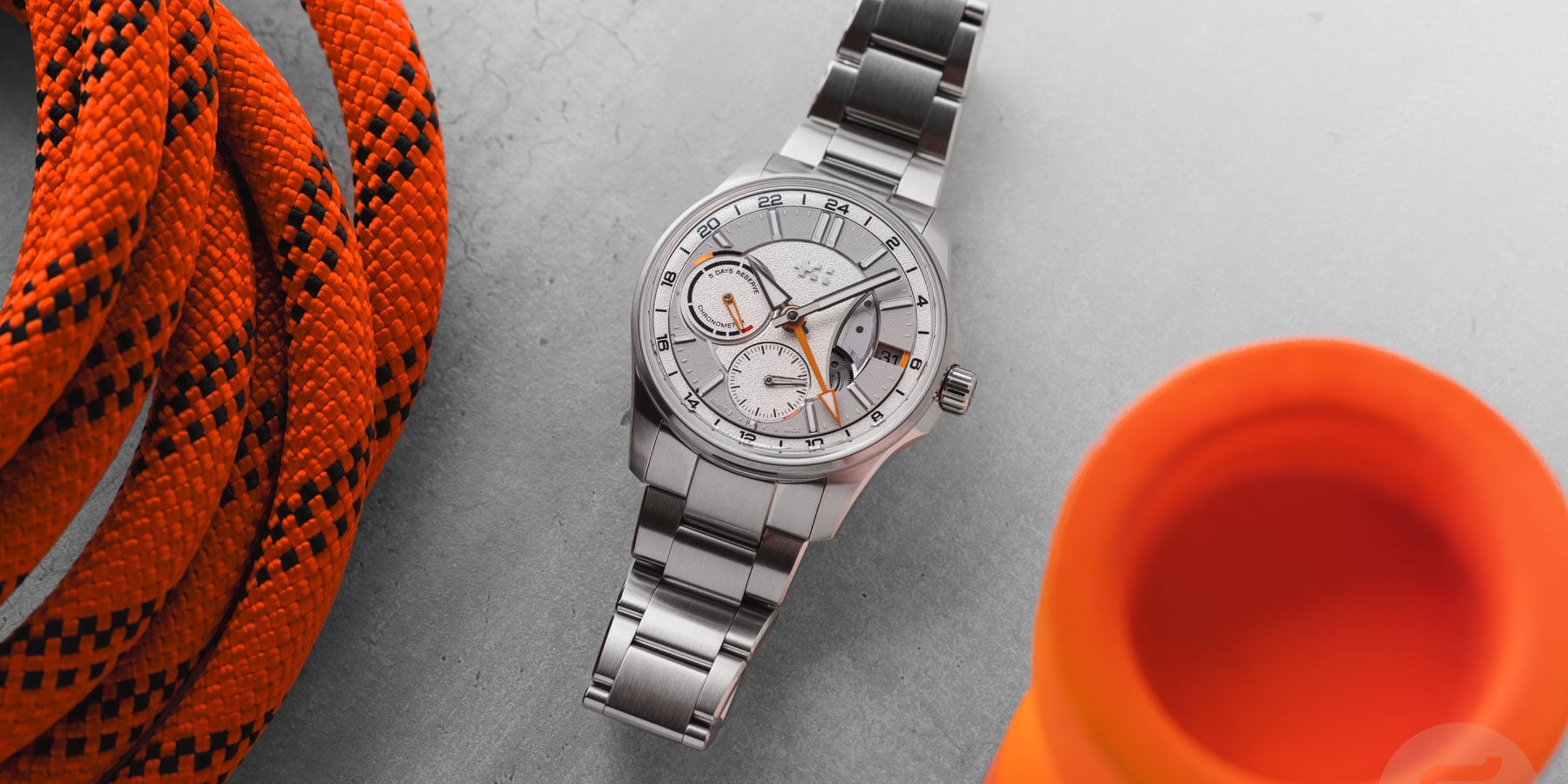 When your eyes hit the dial, you immediately realize how different this GMT watch is. The multipiece dial features a sub-seconds register at 6 o’clock, a power reserve indicator at 9 o’clock, and a date window at 3 o’clock. The brand offers two versions of this new C63 Sealander True GMT. The first has a black dial with light blue accents, while the second houses a silver dial with orange accents. As the latter is the model that we had in for review, we will focus on it for this review.