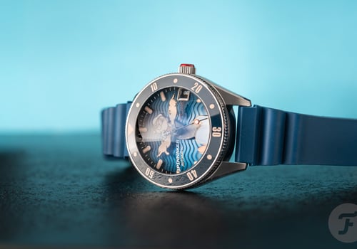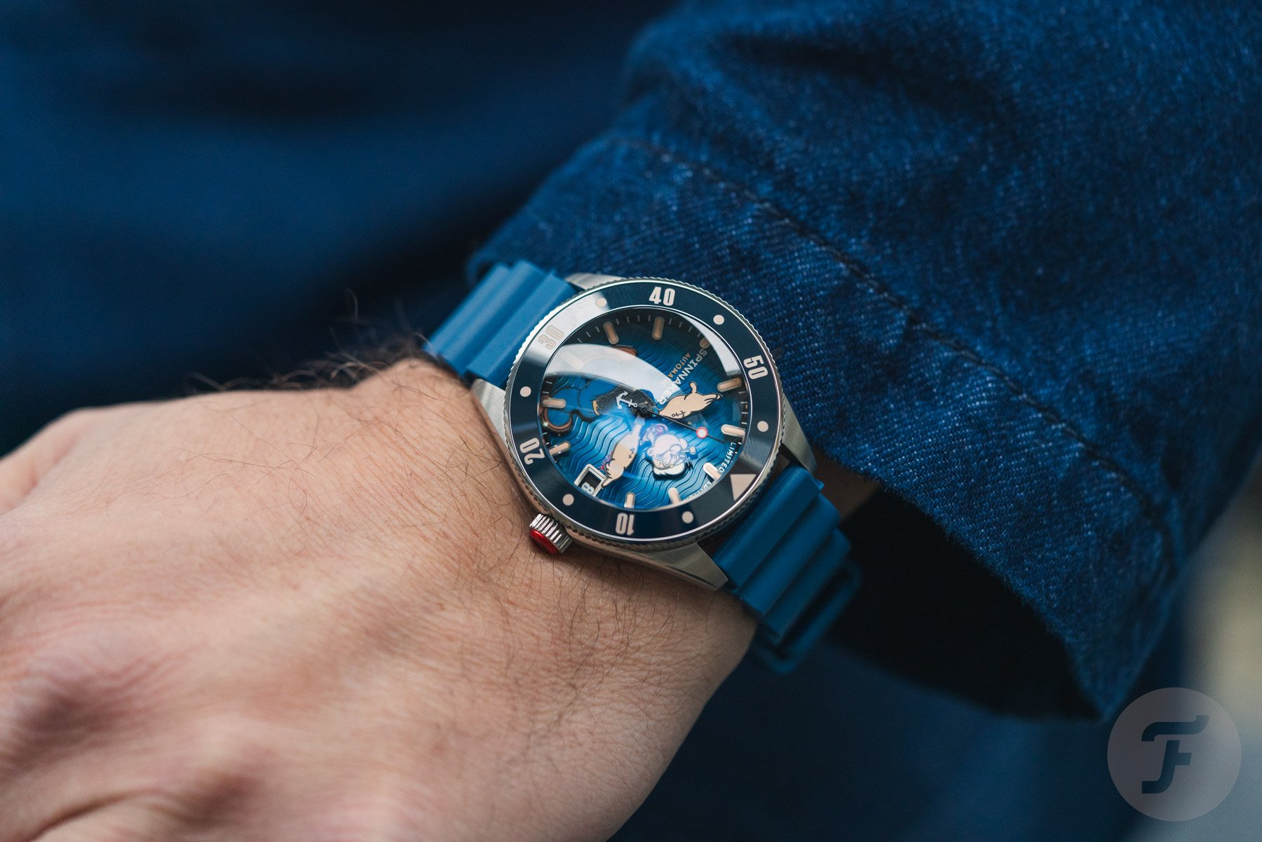 The three variations all feature a wave-patterned textured dial with a date window at 3 o’clock. Ours had a lively blue dial contrasted by applied hour markers filled with light pink lume. The color corresponds with the Super-LumiNova color used for the markings on the ceramic bezel insert. Taking center stage is our hero of the story, whose arms serve as the hour and minute hands. A lollipop seconds hand with an anchor counterweight effectively emphasizes the sailor theme.