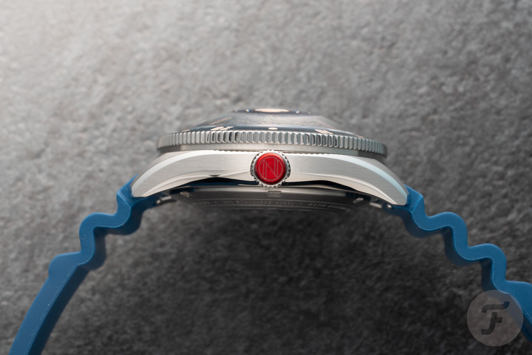 Regarding the watch’s thickness, it is only 19mm thick at its center, where the heavily domed sapphire is at its thickest. It creates a dramatic and super characteristic presence.