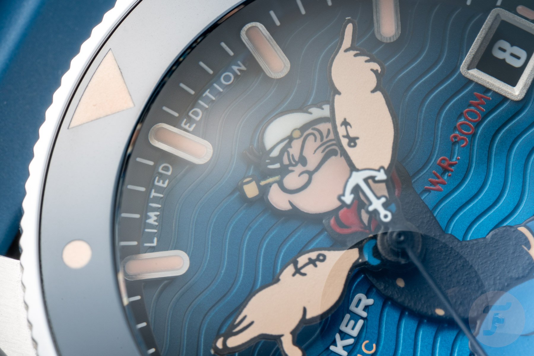 The heavily domed sapphire does influence the image of Popeye, though. As you will understand, looking at the dial from an angle distorts the view significantly. But that also makes it fun because as soon as you change the angle, Popeye slowly reveals himself. Additionally, playing with a lume torch and seeing the watch light up in the dark is another playful aspect that makes this limited edition enjoyable. Other than that, the watch feels solid and ruggedly built, so it is ready for a proper adventure. But I think it’s more about the fun surprises that reveal themselves to you.