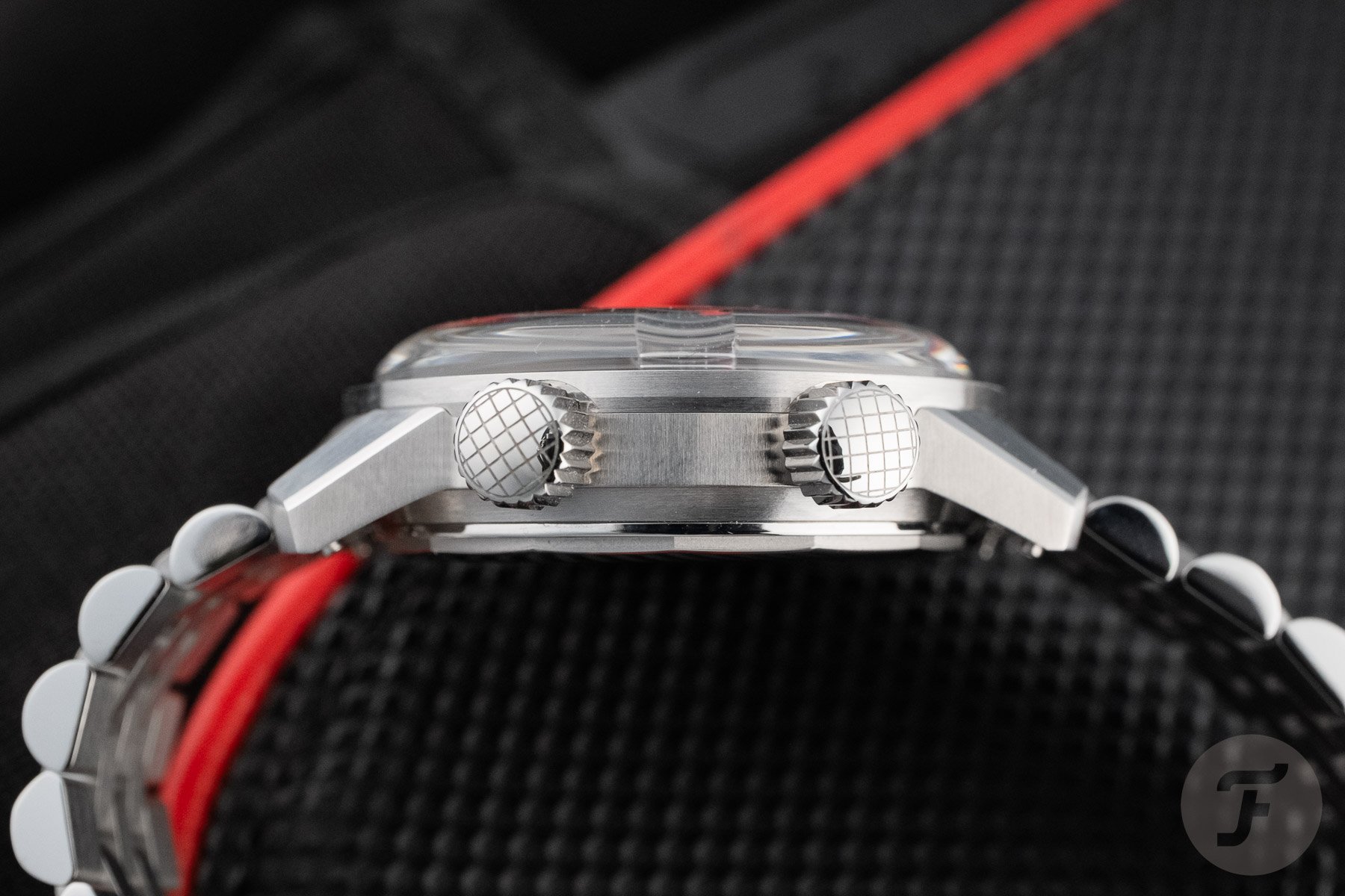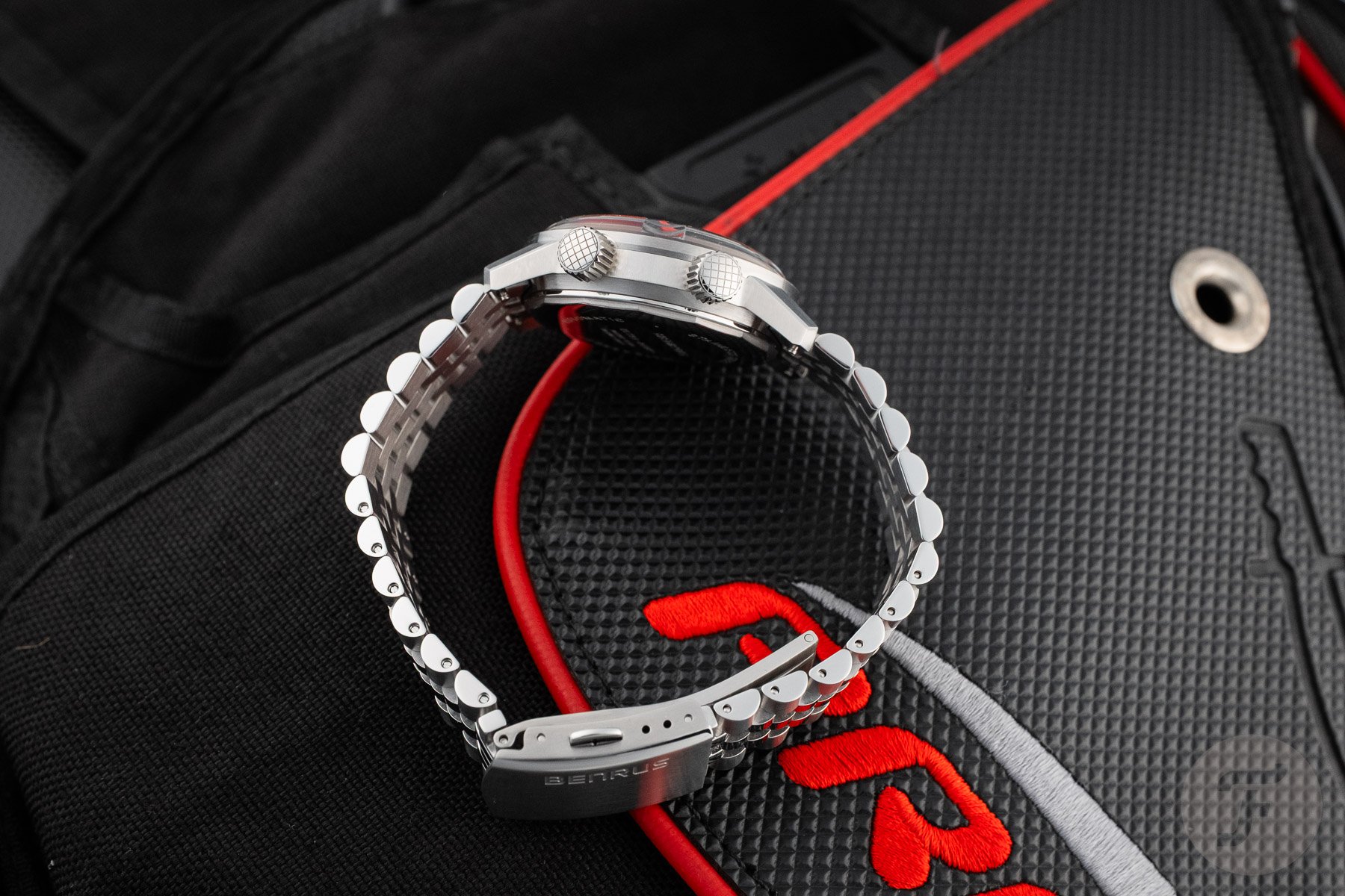 Additionally, the modest case features fairly long lugs, making it easier to wear even on larger wrists. Operating the dive bezel is easy too. If you turn the crown, the bezel immediately starts rotating, and setting it exactly is easy as there is no play between the two. A nice detail is the diagonal engraving on the crowns, which refers to the classic Super Compressor cases of the original watches.