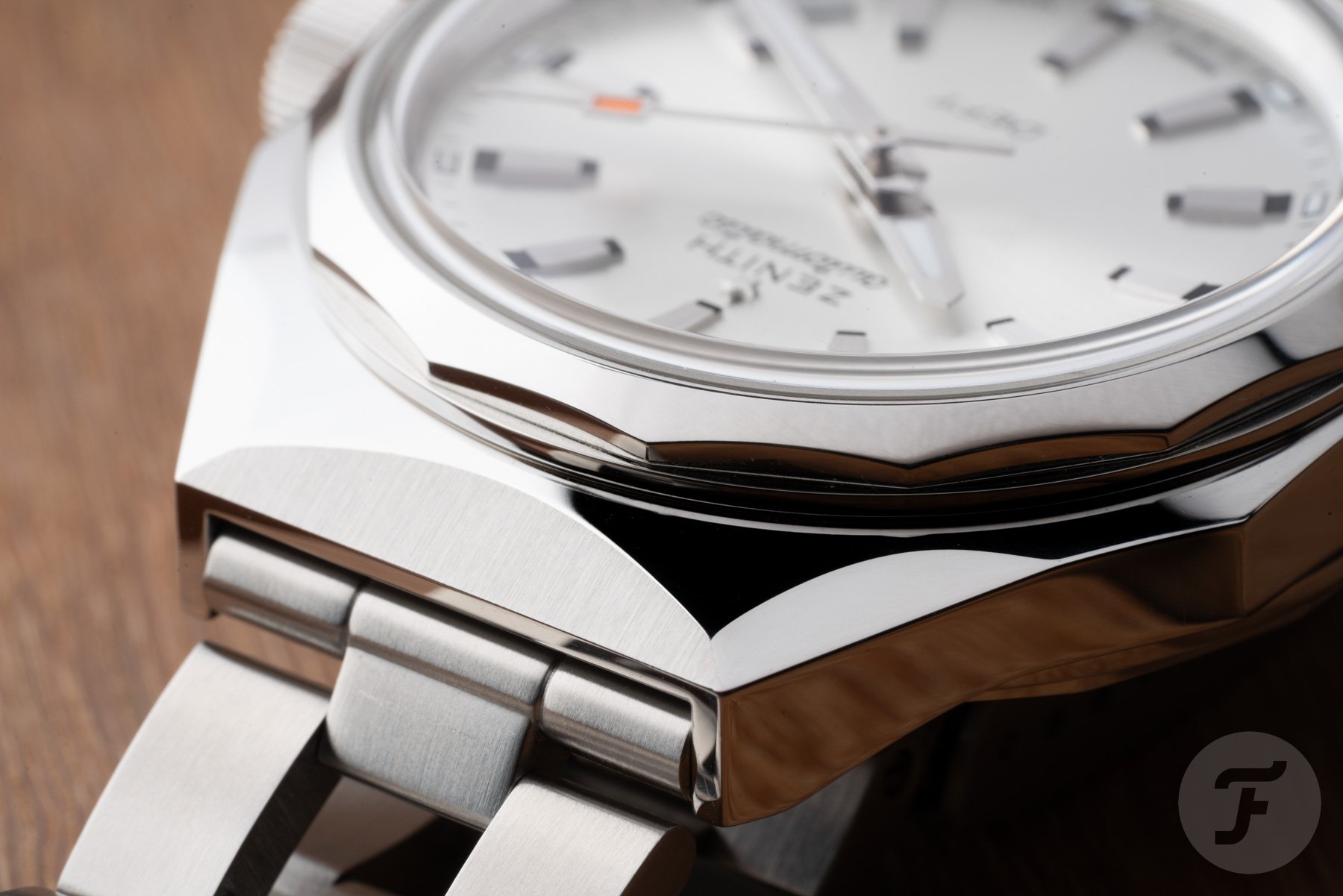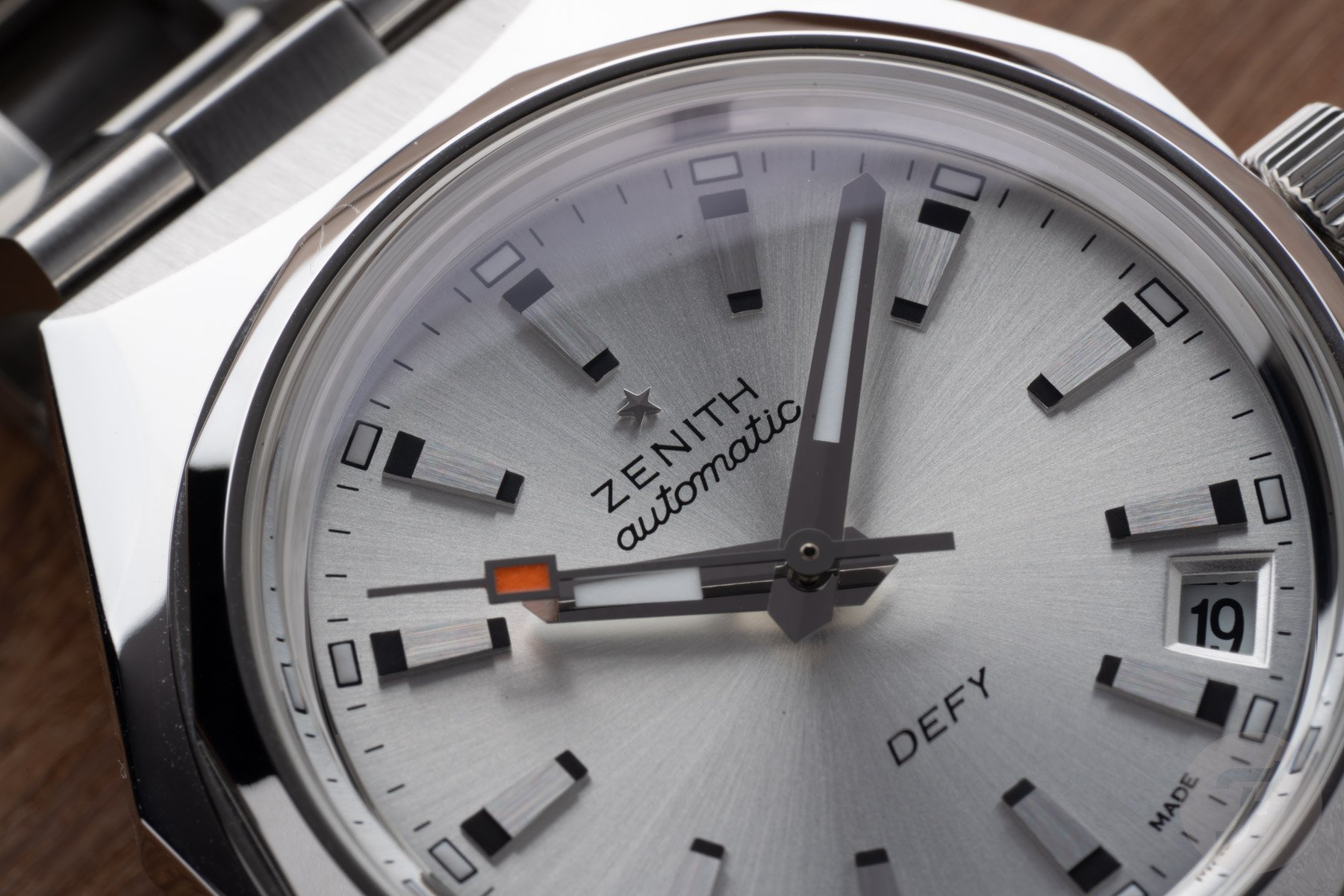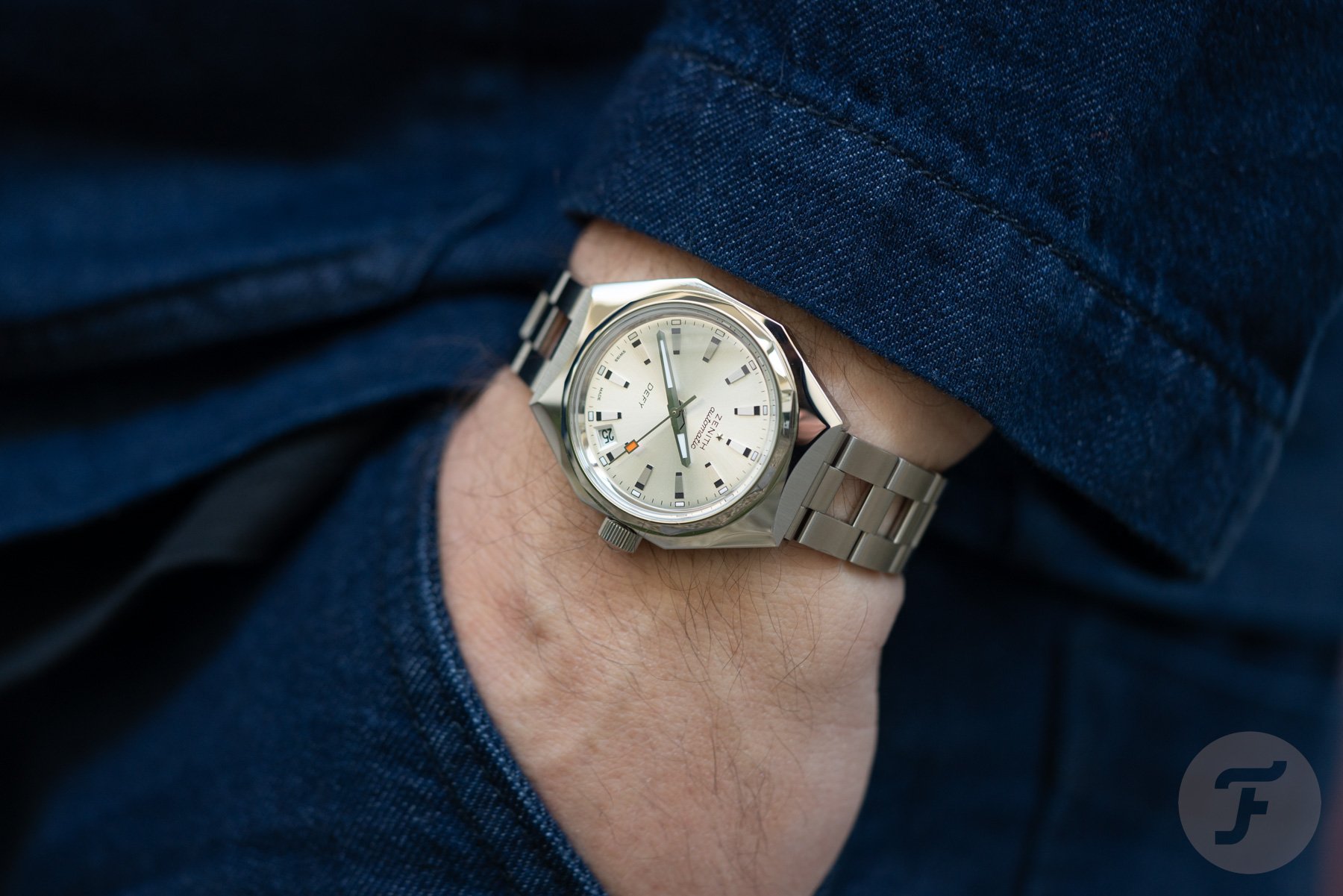 The Defy Revival A3643 features the familiar stainless steel octagonal “Miura” case with a 14-sided bezel. This nicely proportioned case has a modest 37mm diameter, 13.6mm thickness, and 44mm length. While it offers plenty of retro charm, the case design still feels relevant almost six decades later. For this model, Zenith paired with a silver-tone sunray dial featuring a full set of 12 identical hour markers. Encircling them is an open minute track, with luminous rectangles marking every hour.